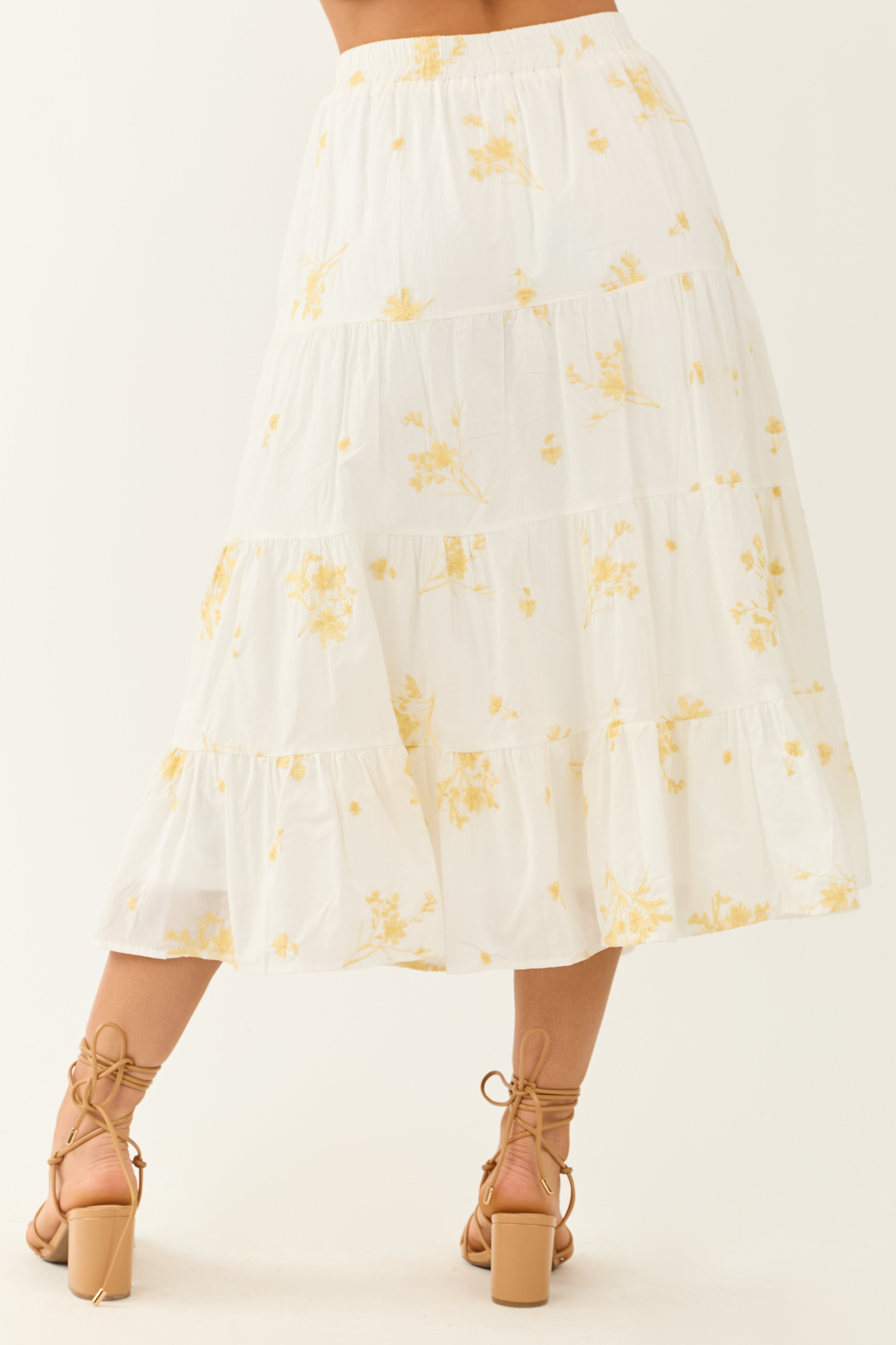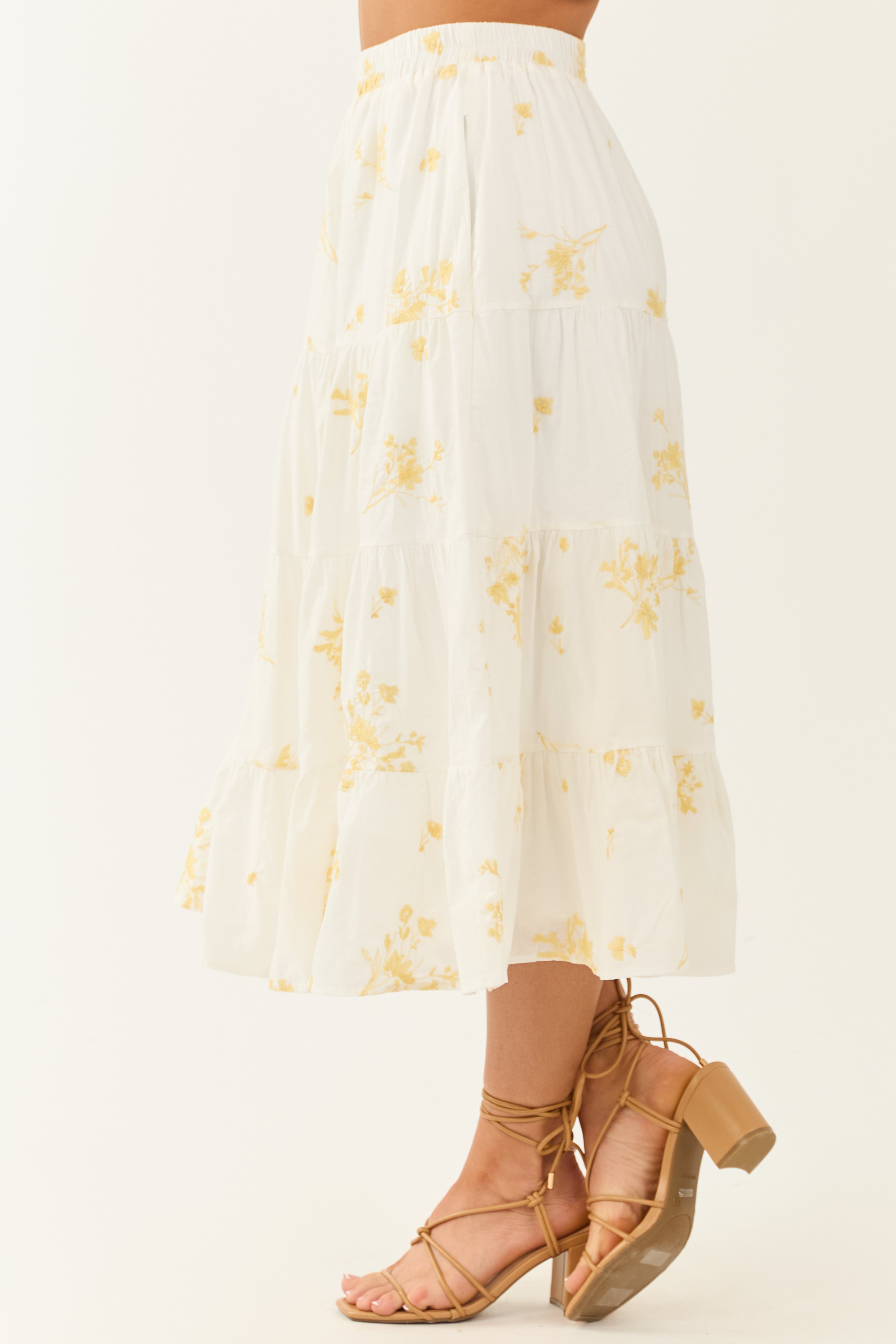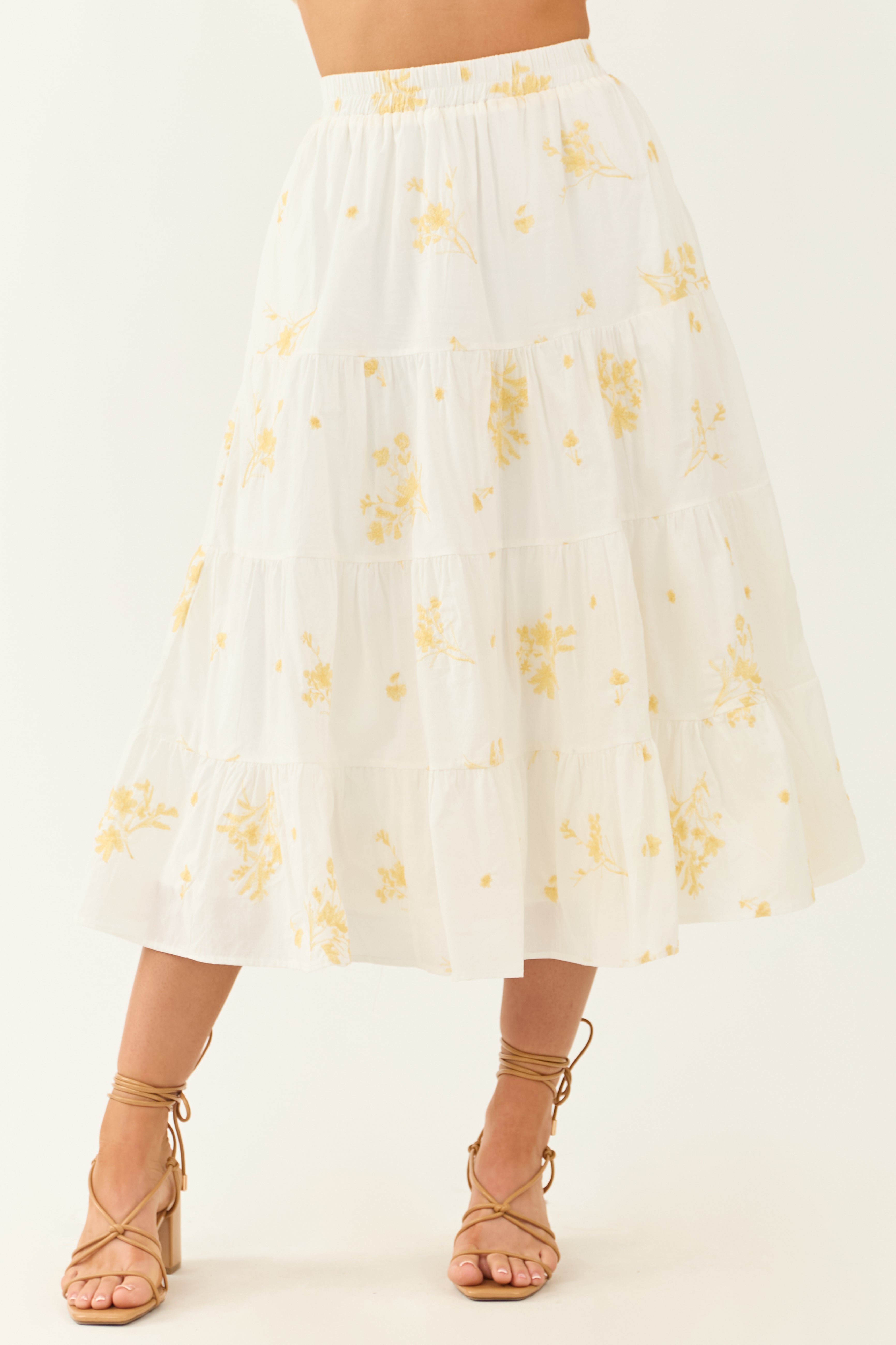 This stunning tiered midi skirt features delicate floral embroidery in a lovely honeysuckle shade. Crafted from non-stretchy woven cotton with a smocked elastic waistband for a comfortable fit. Perfect for spring and summer occasions, it comes in sizes S, M, and L with lengths ranging from 31″ to 33″. Fully lined for added elegance. Care instructions: Hand wash cold, hang dry. Available in white. Model is wearing size Small.