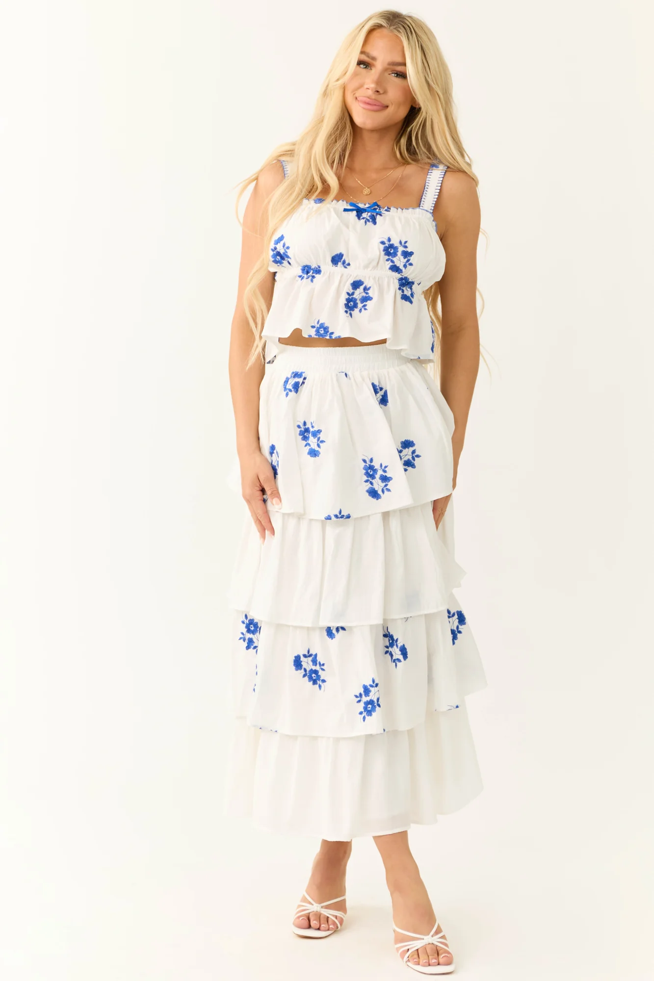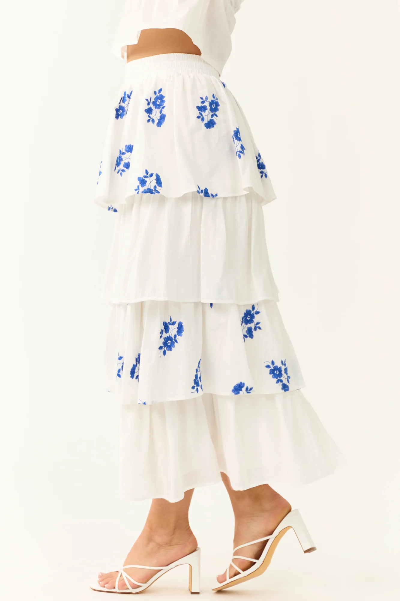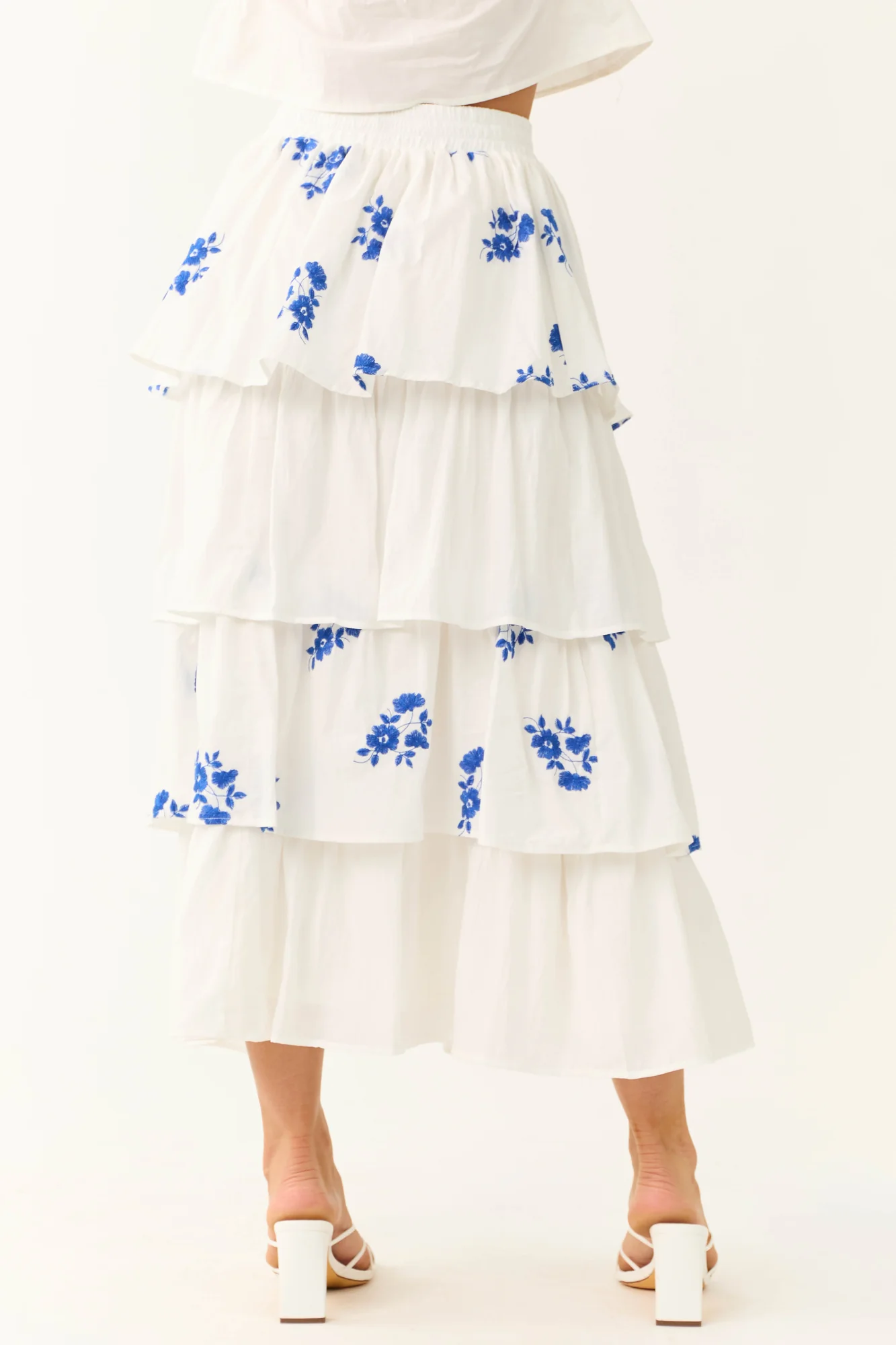 Enhance your wardrobe with the Floral Embroidered White and Cobalt Midi Skirt . This non-stretchy woven skirt features tiered floral embroidery in elegant shades of white and cobalt. The elastic waistband provides extra room and comfort, making it perfect for any occasion. Crafted from 86% Cotton, 11% Polyester, and 3% Spandex with a 100% Rayon lining, this midi skirt is both stylish and practical. Pair it with the matching tank top for a complete look. Hand wash cold and line dry for best care.
