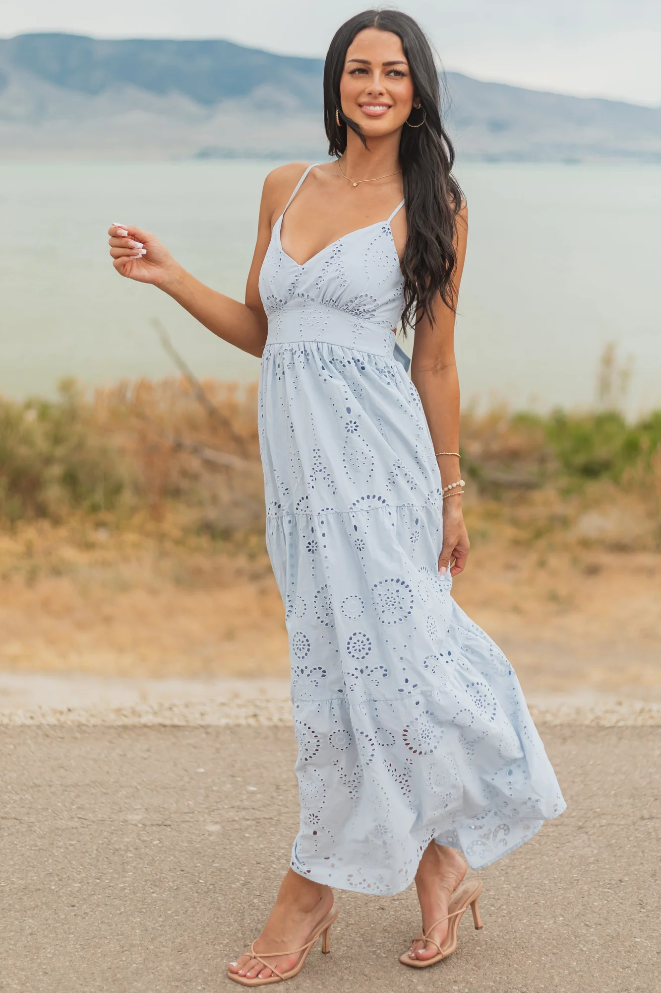 Embrace the breezy charm of summertime with our Floral Eyelet Sleeveless Maxi Dress in Sky Blue Cotton. This tiered maxi features delicate floral patterns, adjustable spaghetti straps, and a stretchy smocked back waistband for a comfortable fit. The soft and feminine design is perfect for a casual day out or a beach vacation. Made of 100% lightweight cotton with a lined polyester interior, this dress offers both style and comfort. Find your perfect fit with sizes ranging to XL.