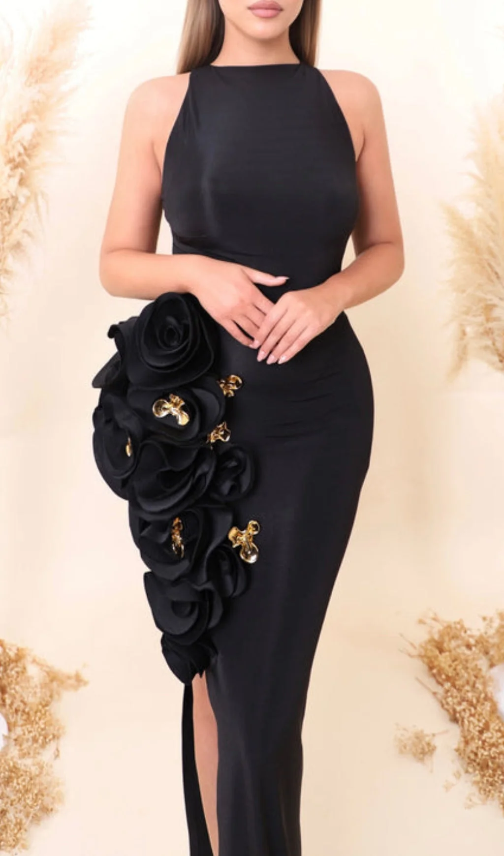 Elevate your style with the charming Floral Halter Maxi Dress. Featuring a playful halter top, eye-catching flower print, and flirtatious side slit, this dress is perfect for summer events. Expertly crafted for the perfect fit. Not sure about sizing? Consult our size chart for guidance. Dry clean only. *Color may vary slightly due to image lighting.