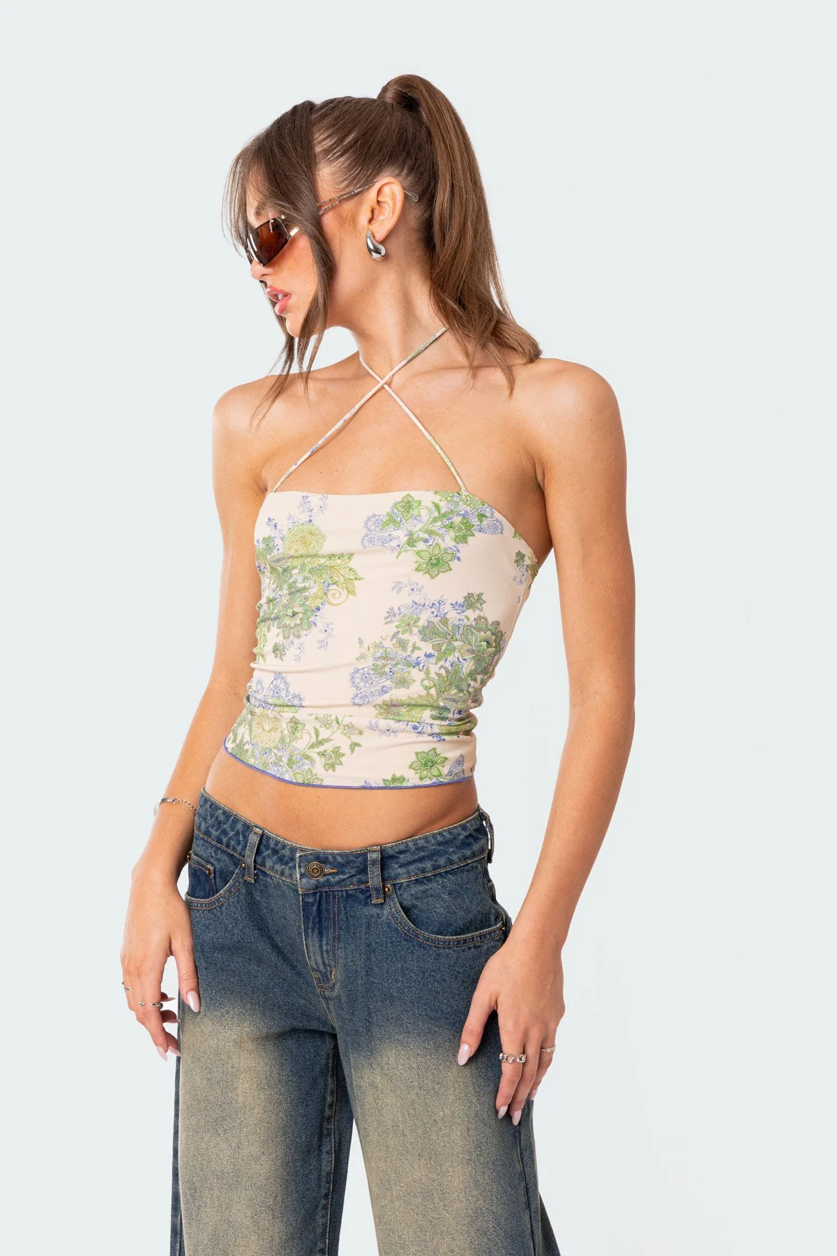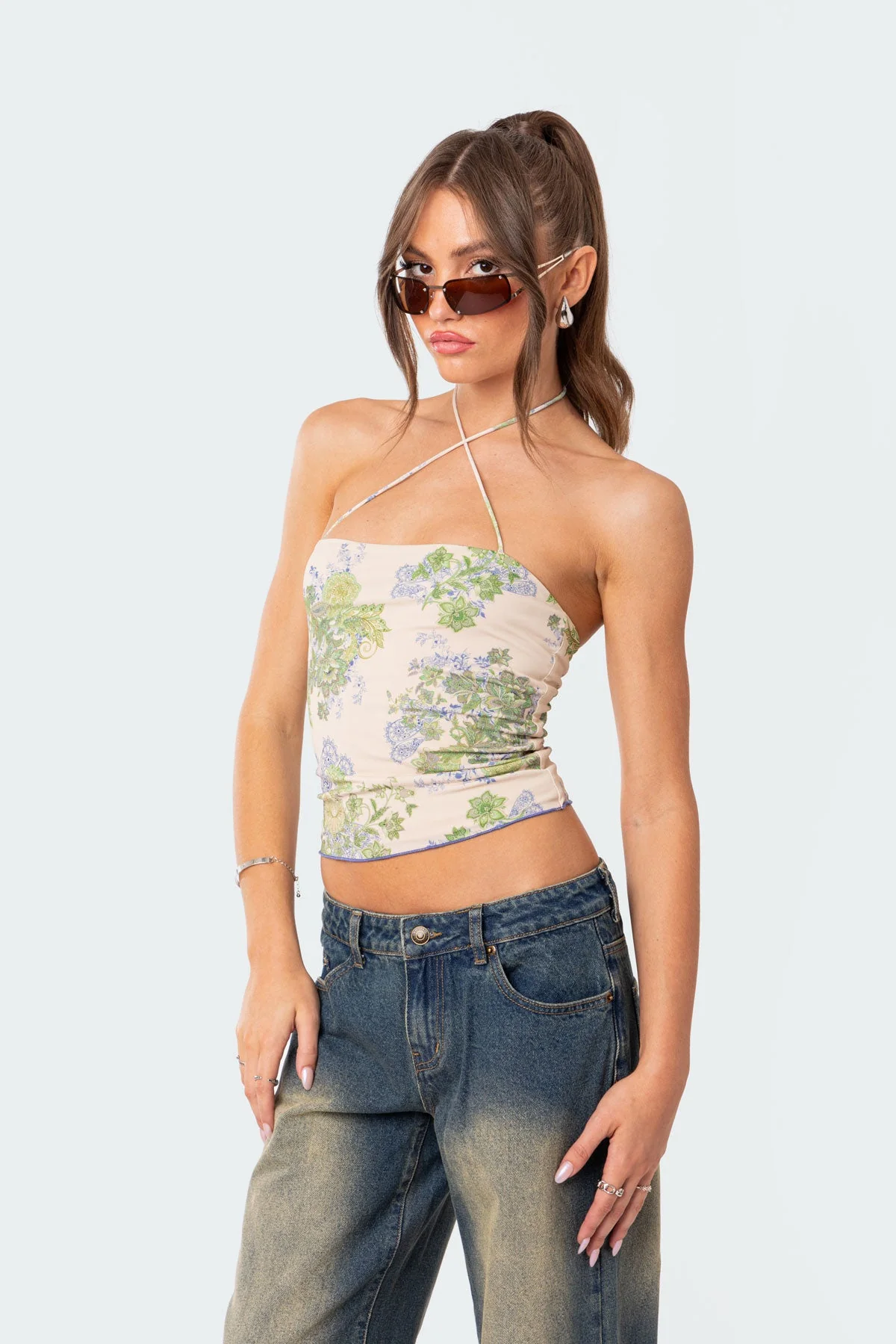 Indulge in the charm of our floral halter neck crop top crafted from a blend of Polyester and Spandex. Featuring a stylish printed fabric, this top is a perfect blend of fashion and comfort. Make a style statement effortlessly with this versatile piece. Model wears size S; Model height is 58. For best care, wash with similar colors.