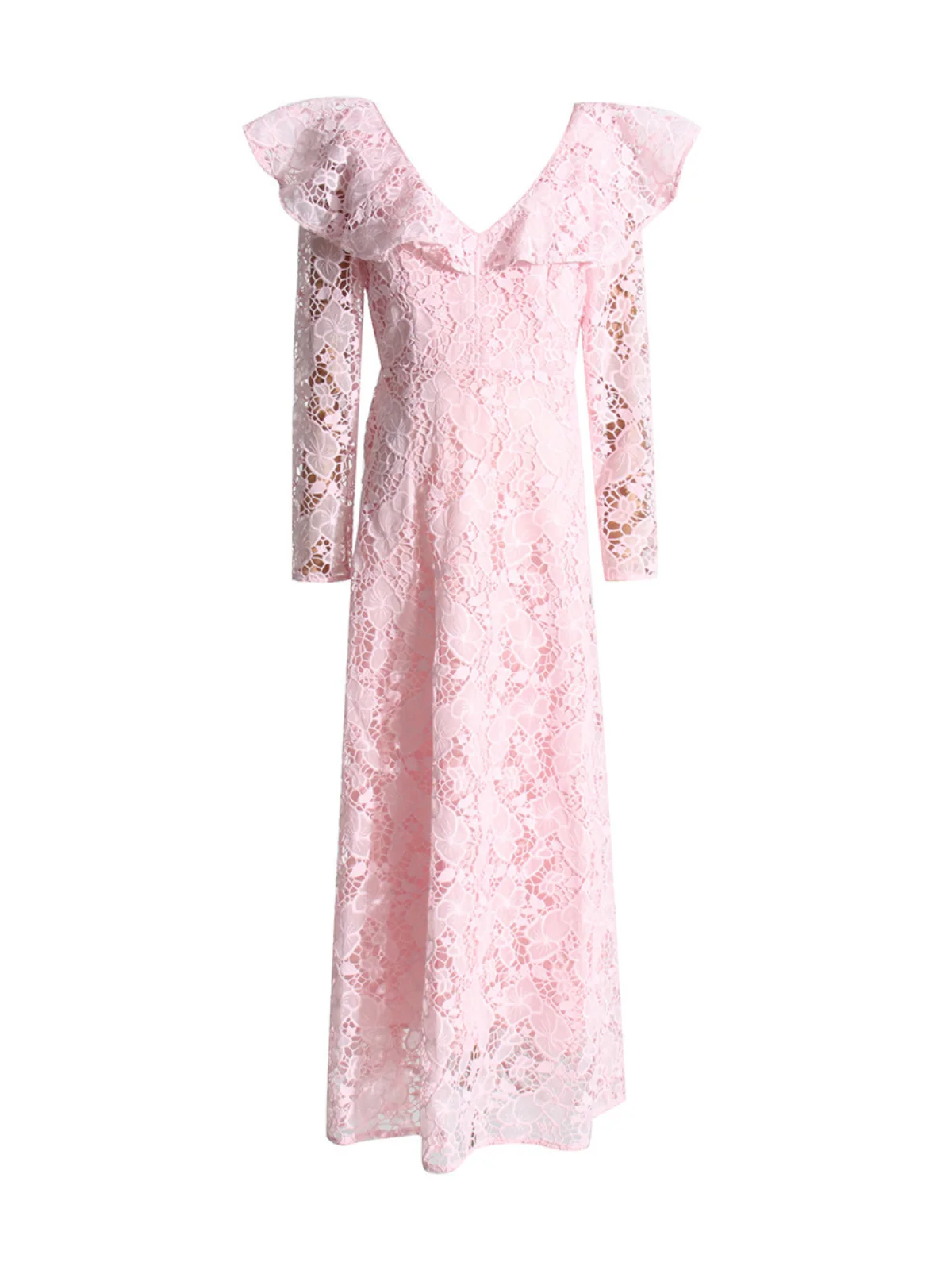 Indulge in the elegance of this Pink Floral Hollow Lace V Neck Dress, designed to flatter with delicate floral lace details. Crafted from high-quality 100% Polyester, this dress features a slight stretch for comfort. Ideal for any occasion, it boasts an invisible zipper opening at the back for added convenience. This graceful dress is machine washable for easy care. Please note that the color may vary slightly due to lighting. Surround yourself in feminine charm with this beautiful dress from Li Fu.