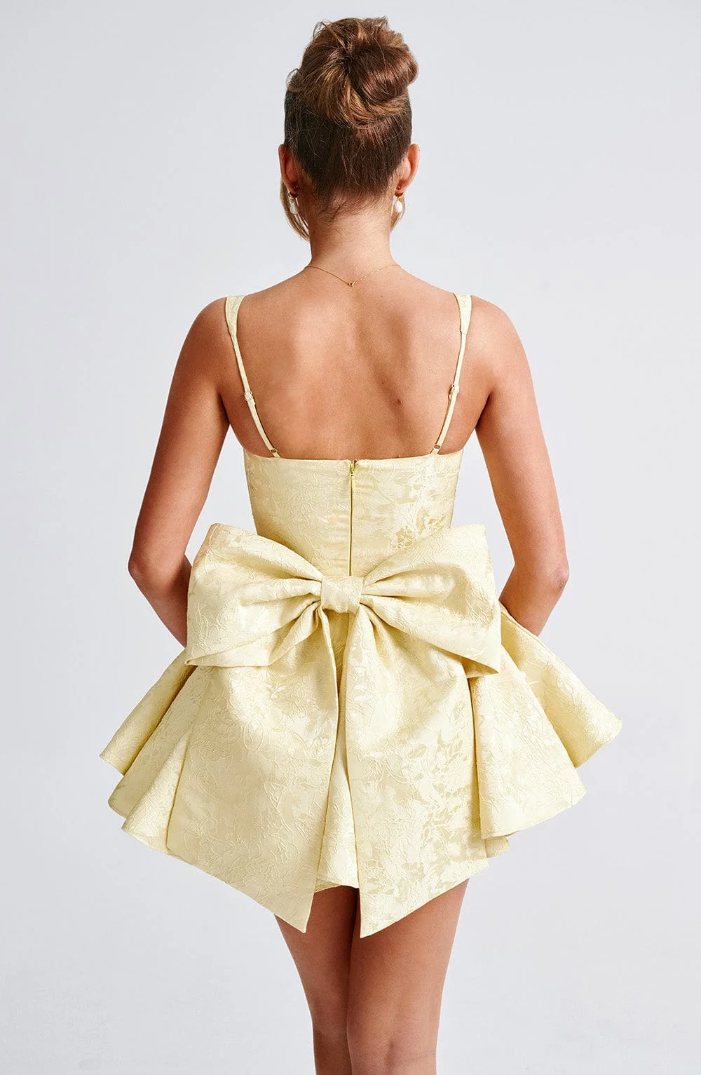 Indulge in the elegance of this floral jacquard jumpsuit featuring an underwired balconette bust, waist cinching design, and lace trim detail. Made from premium fabric, it includes in-built shorts and a removable oversized bow at the back. Perfect for various occasions like brunch or evenings. Stay comfortable and stylish with this lemon-colored jumpsuit. Fully lined, boning in bodice for added support, adjustable straps, and invisible zipper for easy wear. Embrace the mini length and flaunt your style effortlessly. Model is shown wearing size XS.