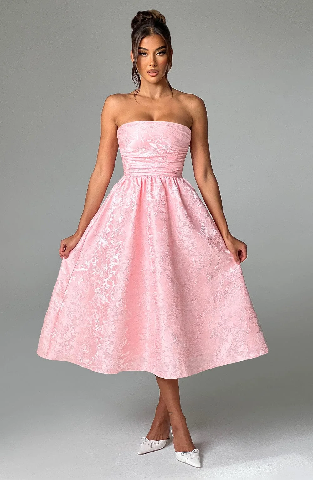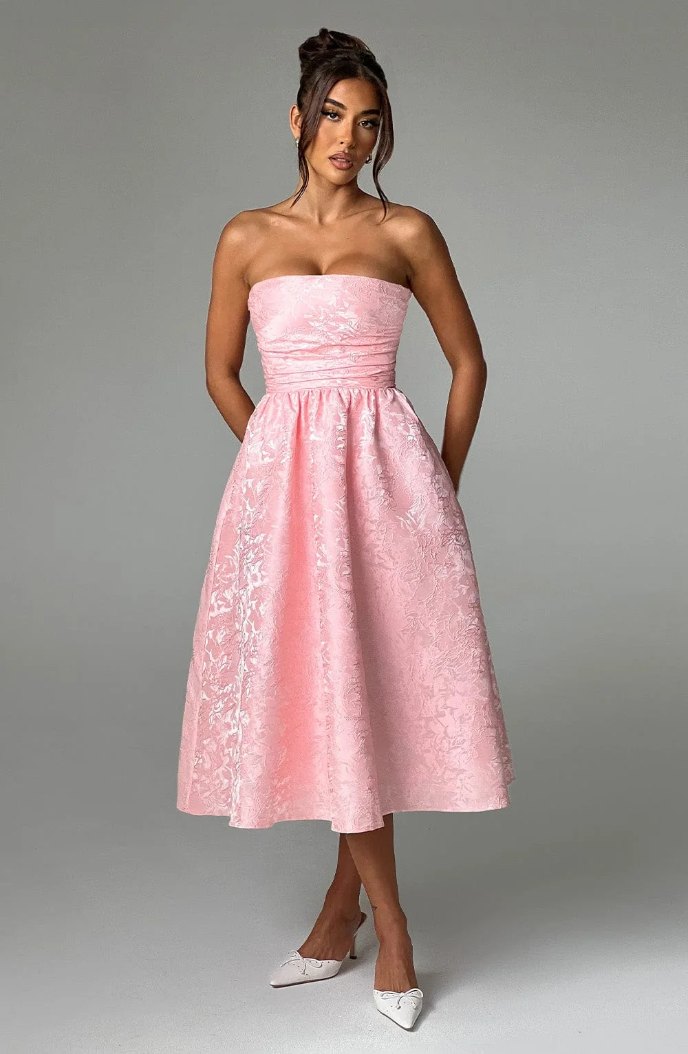 Elevate your wardrobe with the versatile Saoirse Floral Jacquard Midi Dress in Blush. This dress features a flattering boned bodice with pleating and gathered detailing, a full skirt lined with tulle for added volume, and a charming lace-up back. Perfect for any occasion, from weddings to parties. Crafted in floral jacquard fabric and fully lined for comfort. Complete your look with pointed heels for a chic style. Available in XS, S, M, L, XL, and XXL sizes. Model is wearing size XS.
