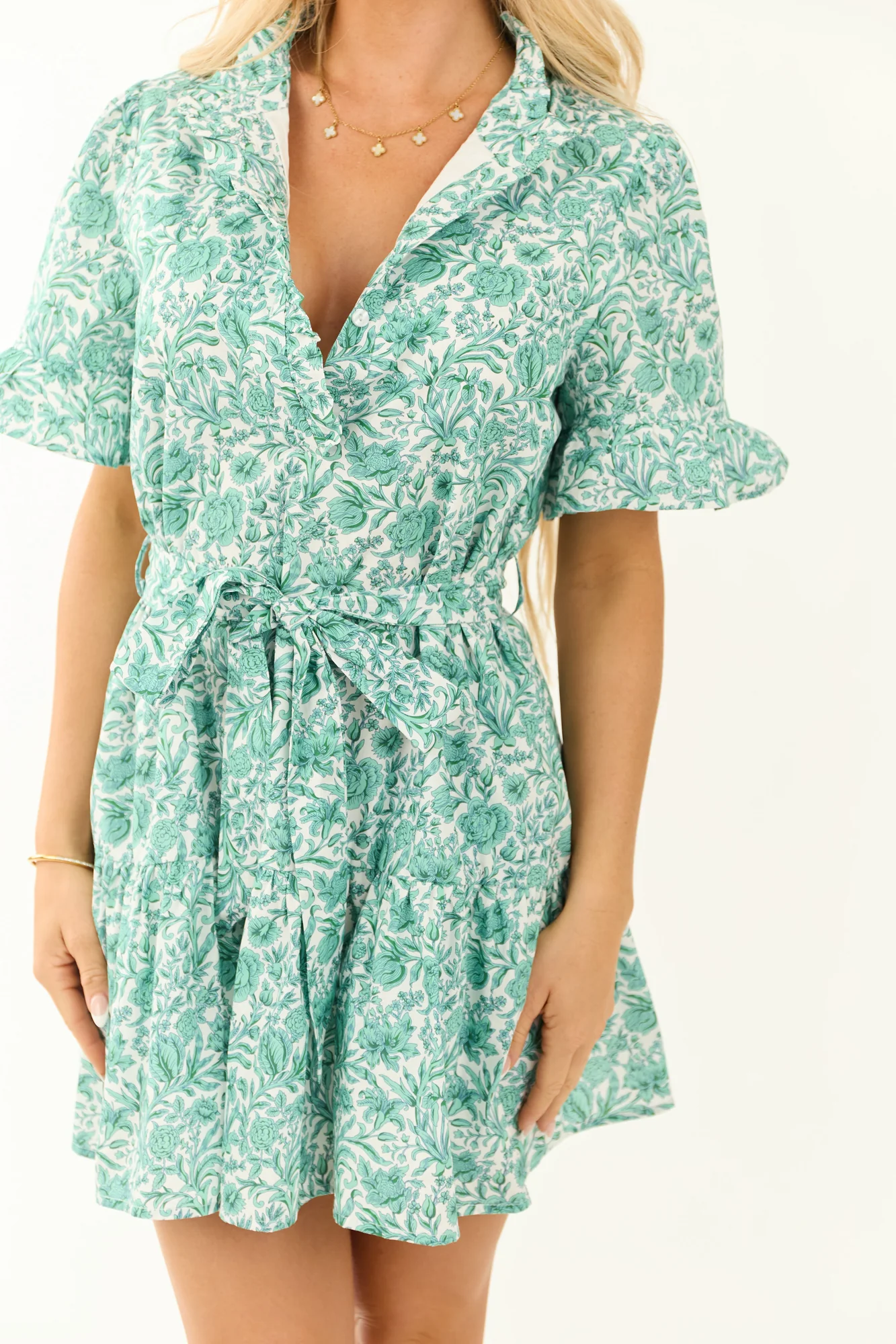 This flattering shirt-style mini dress features a comfortable adjustable fit and timeless charm! It fits true to size with a waist tie and has a large tent fit when untied. Enjoy a high frill neckline, half sleeves with ruffle cuffs, banded hem, side pockets, and belt loops. The dress is lined, features a detachable waist tie, floral print in Juniper, Mint, and Ivory shades, and buttons in Ivory. Model is wearing size Small. Model Profile: Size 1, Height 57, Bust 34, Waist 26. Material: Self – 100% Cotton, Lining – 100% Cotton. Imported.