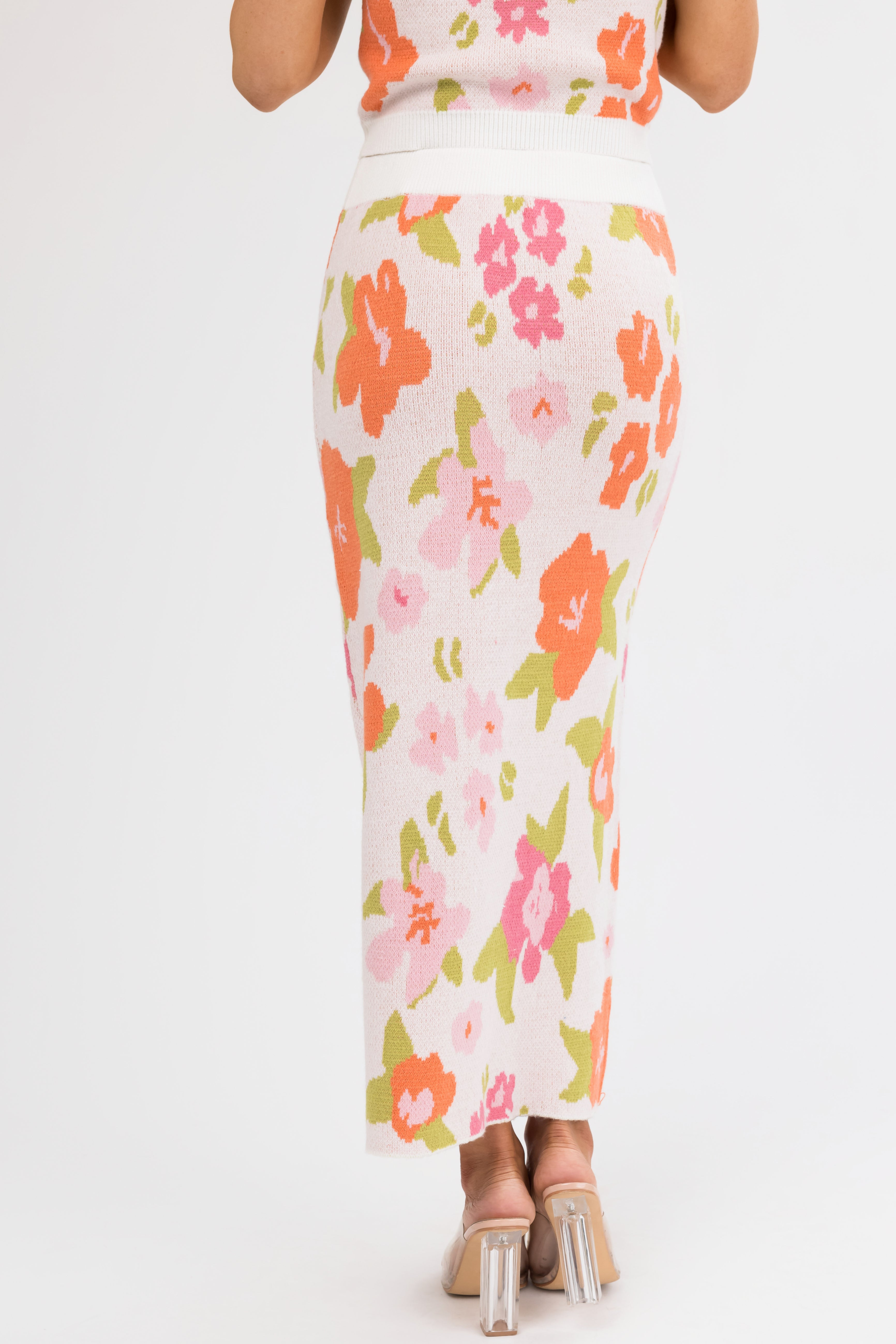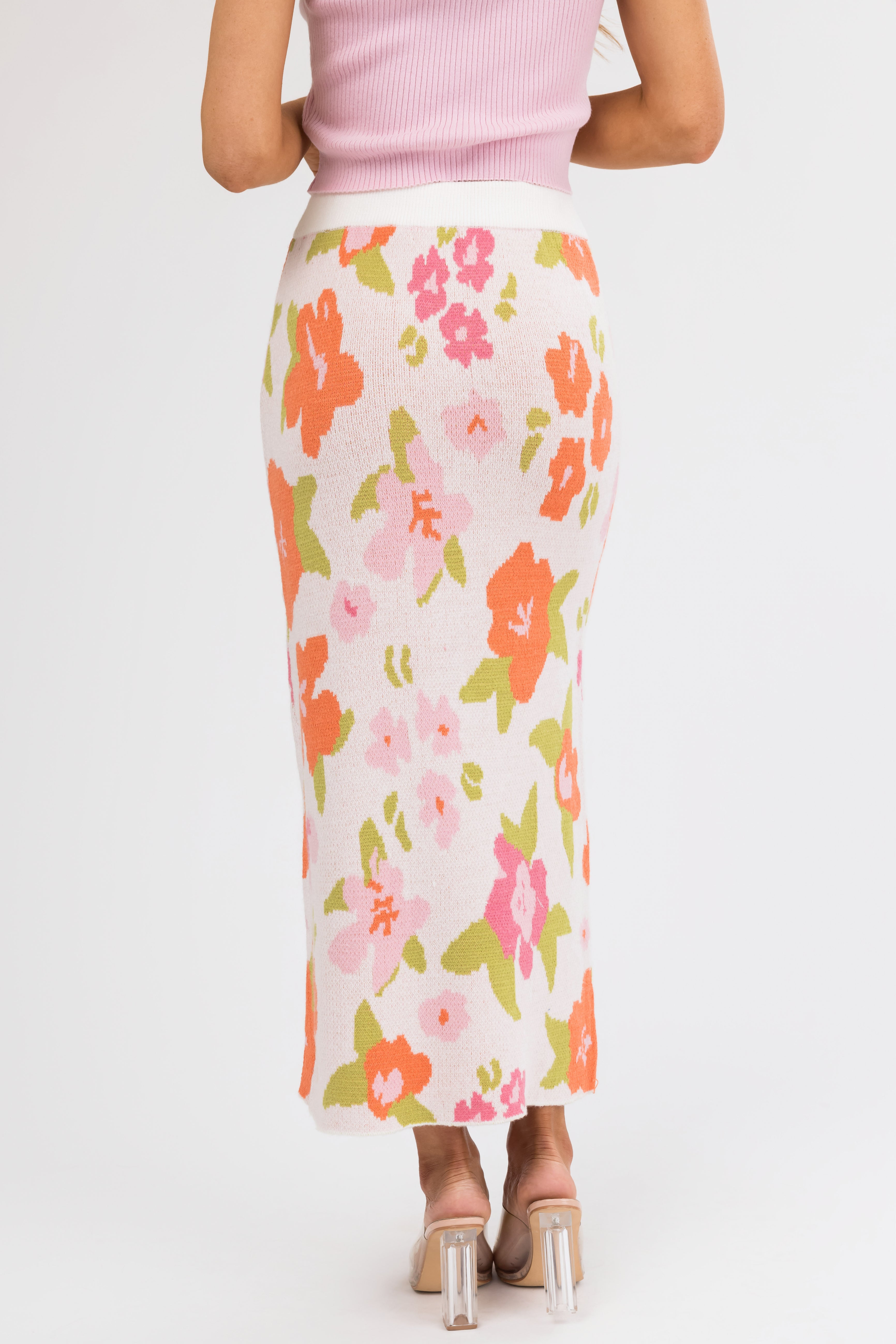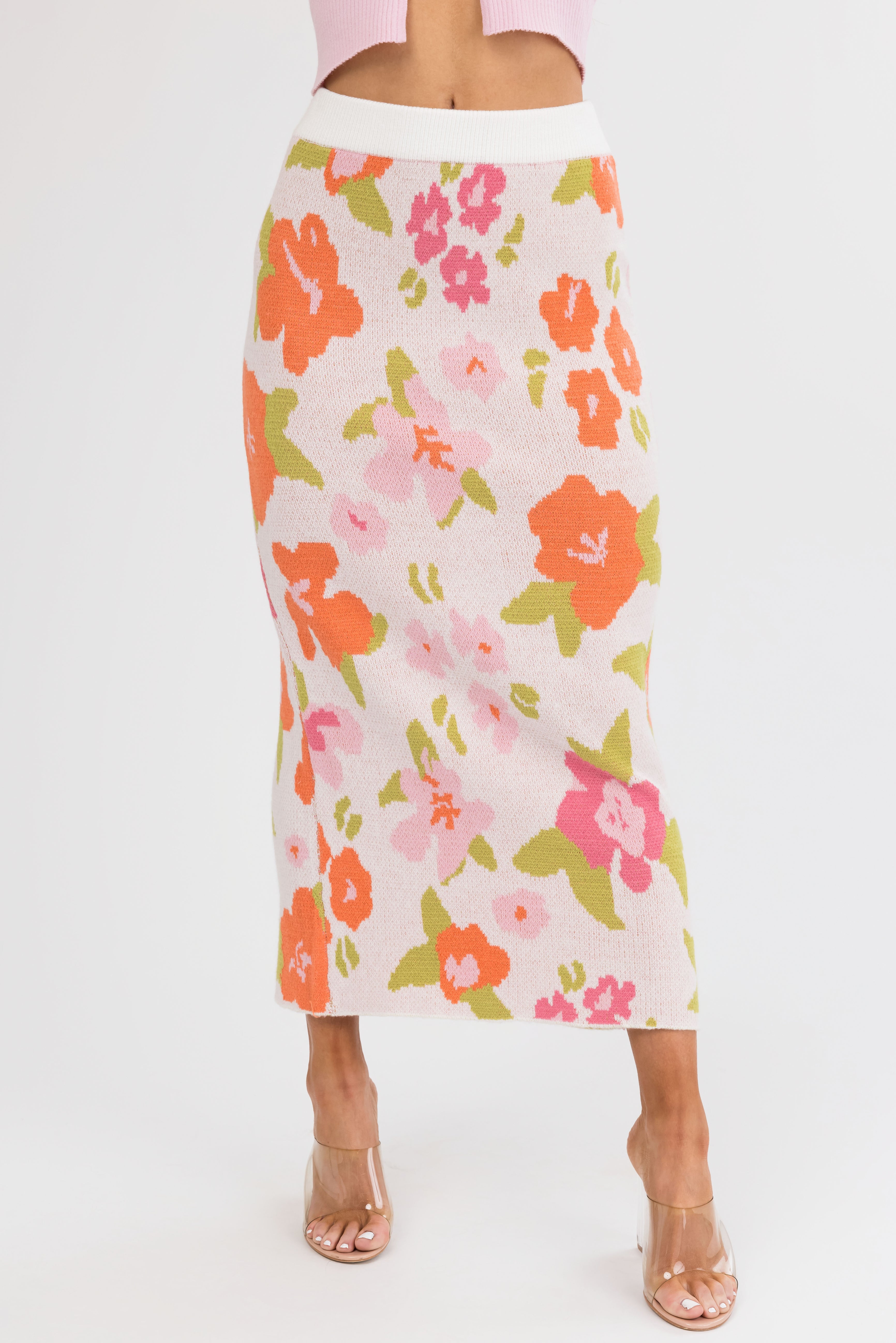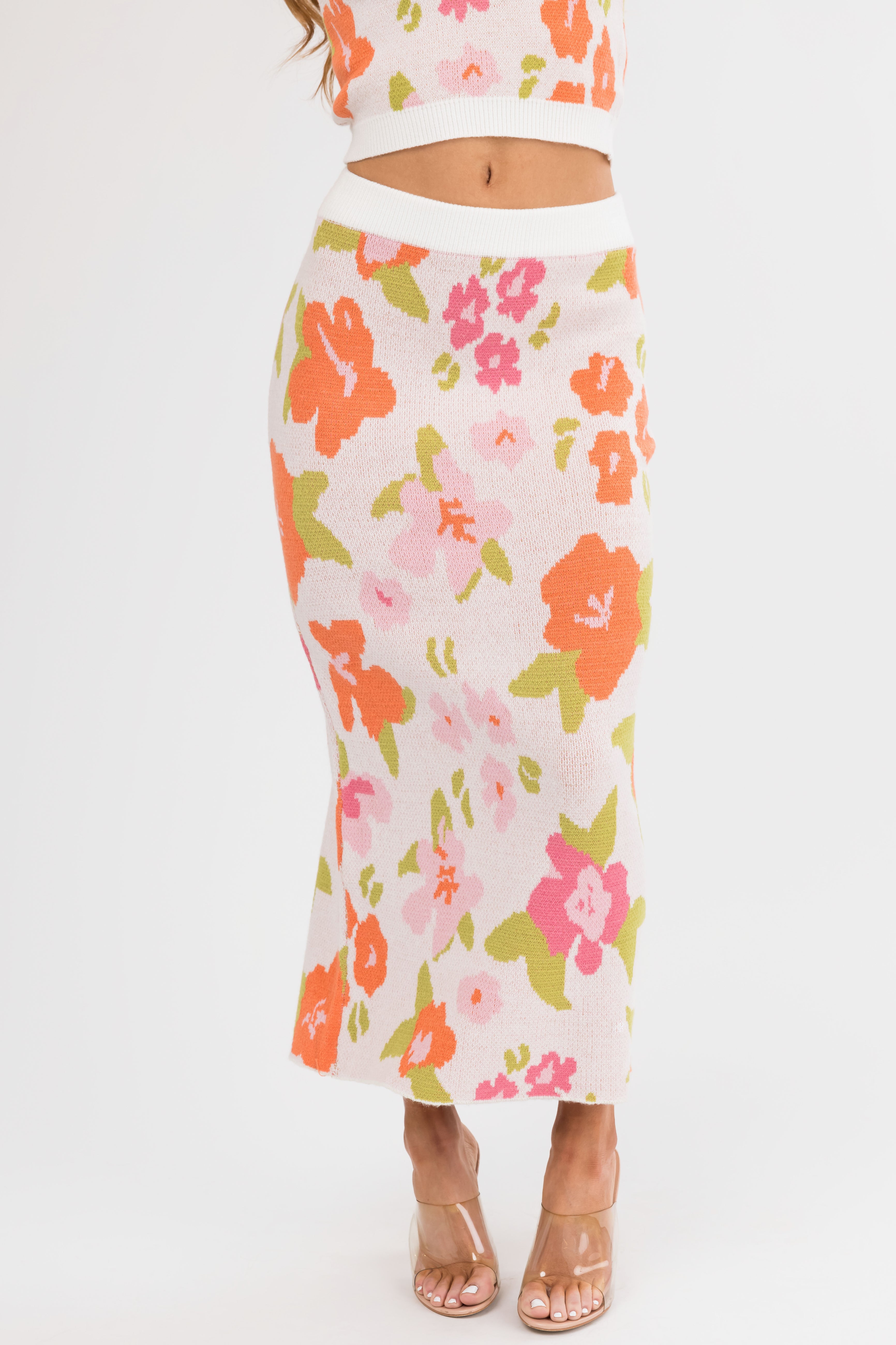 Indulge in timeless elegance with our Floral Knit Midi Skirt in Dusty Blush. Crafted from high-quality 100% Acrylic for ultimate comfort and style. This beautiful skirt features a stretchy ribbed knit, an elastic waistband, and a mesmerizing floral print in shades of Dusty Blush, Watermelon, Dark Pistachio, Papaya, Ivory, and Carnation. Pair with our matching Cropped Tank Top for a coordinated ensemble. Unlined and imported. Please note: Dry clean only. Each piece is unique; print placement may vary. Embrace sophistication with this wardrobe essential.