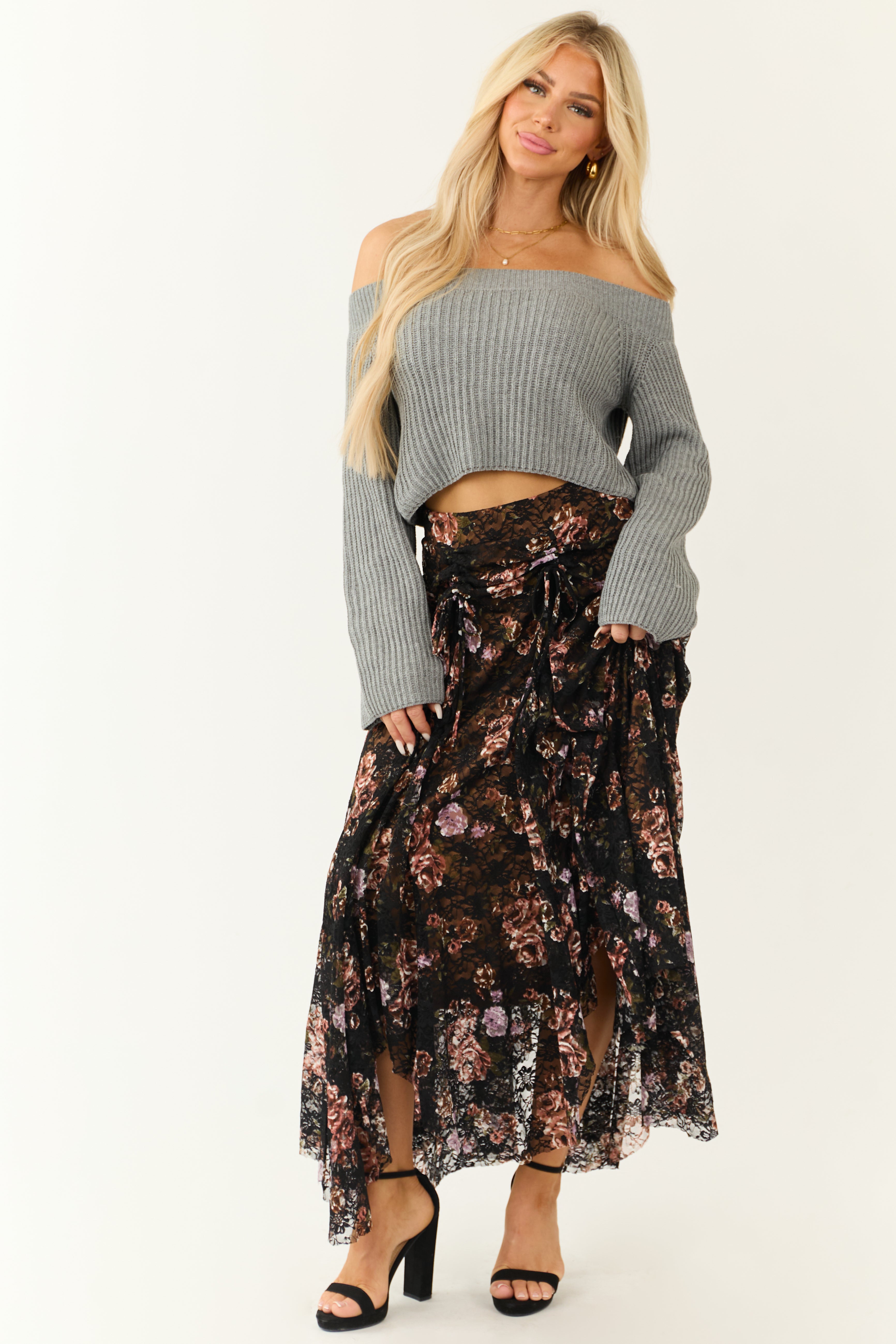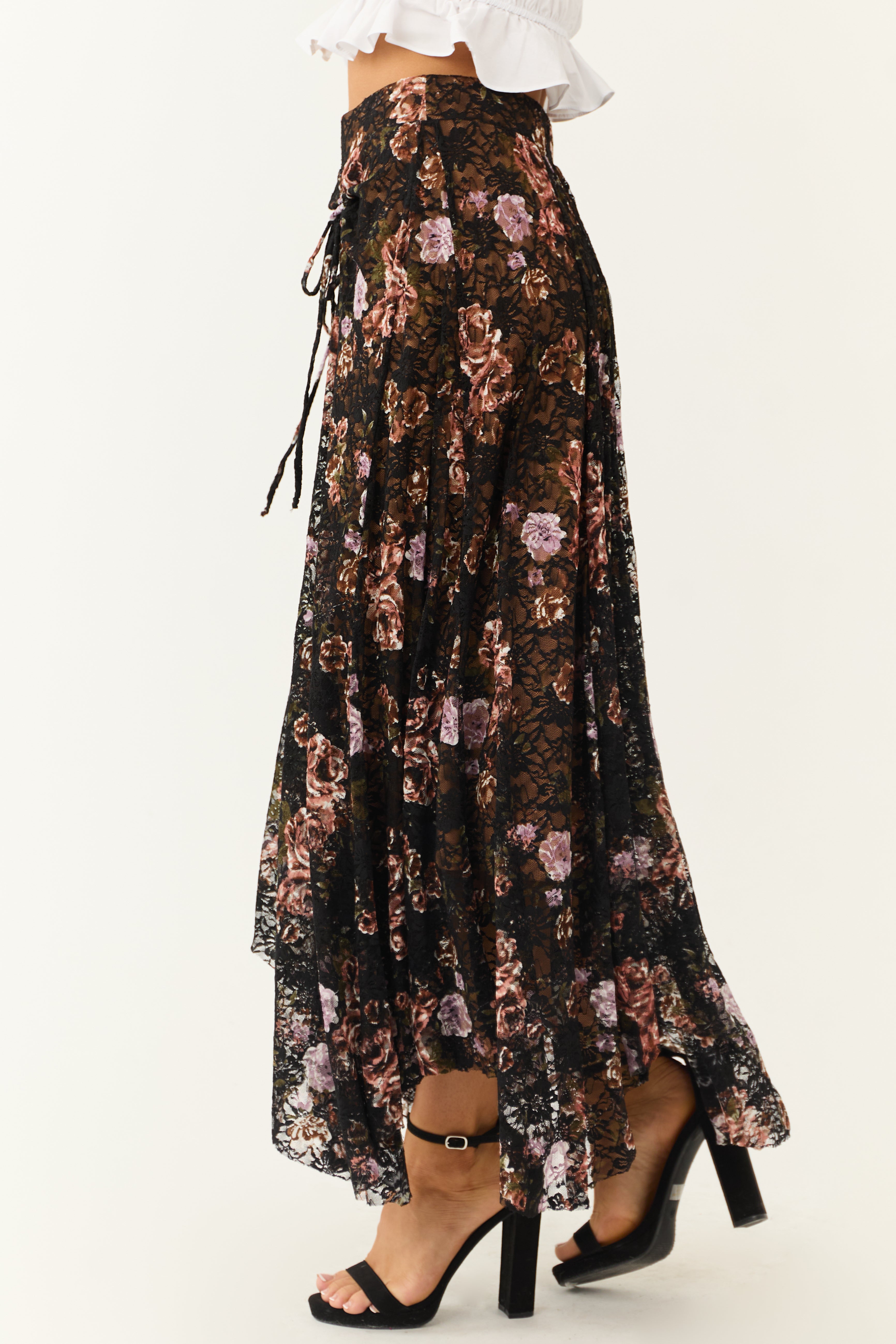 Experience elegance and comfort with our Floral Lace Handkerchief Hem Maxi Skirt in Black. Available in sizes S, M, and L with waist measurements ranging from 28 to 36 inches, this semi-stretchy knit skirt features a unique floral lace design in a classic black hue. The elastic waist and front adjustable ruched bow ties ensure a perfect fit, while the soft lining in Cognac adds a luxurious touch. Crafted from 90% Polyester and 10% Spandex with a 100% Polyester lining. This imported skirt is easy to care for – simply hand wash with cold water, line dry, avoid bleach, and iron on low if needed. Please note that slight variations may occur due to the cutting and sewing process. Model is wearing a size Small. Model’s Profile: Size 1, Height 57″, Bust 34″, Waist 26″.