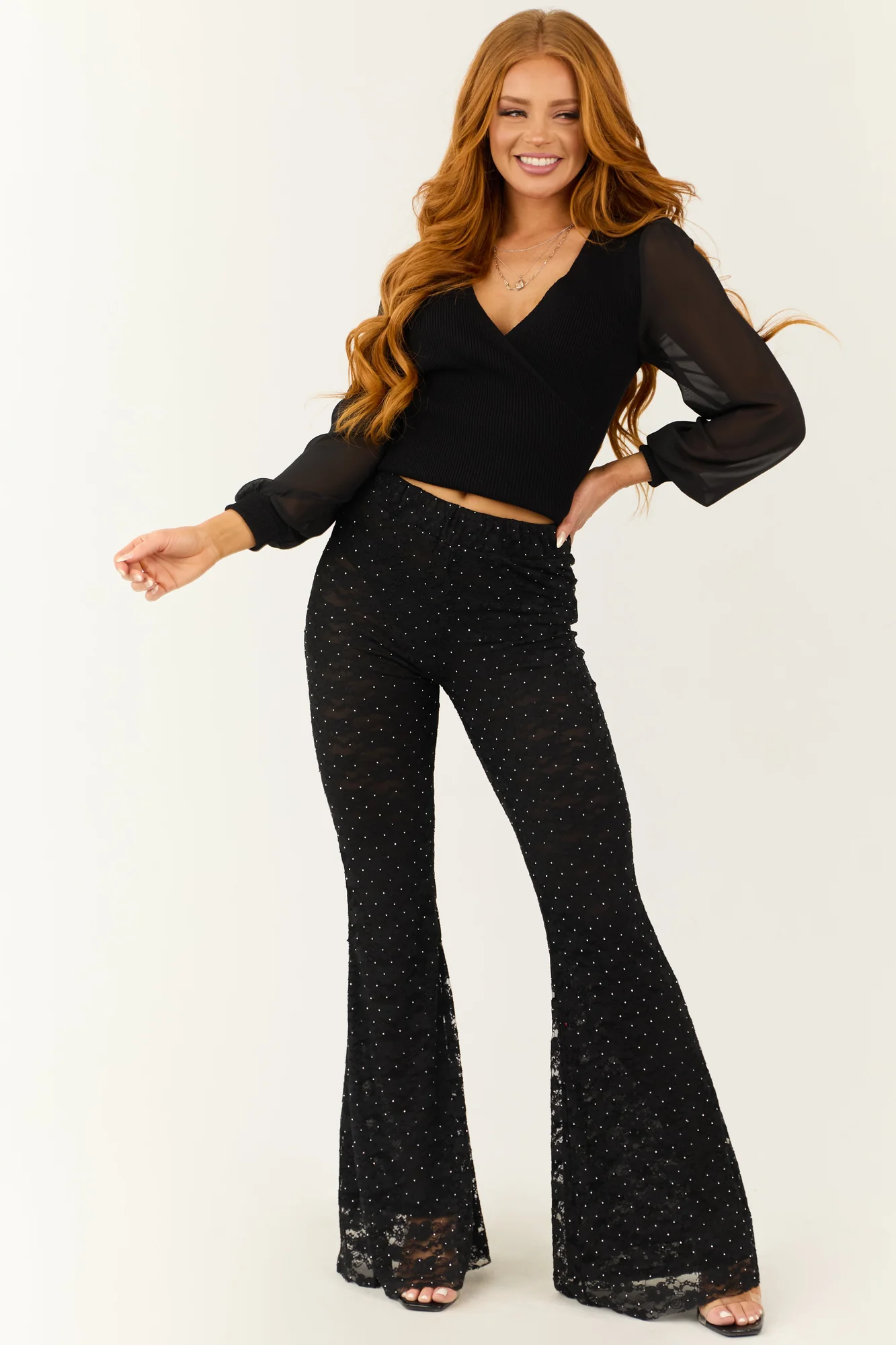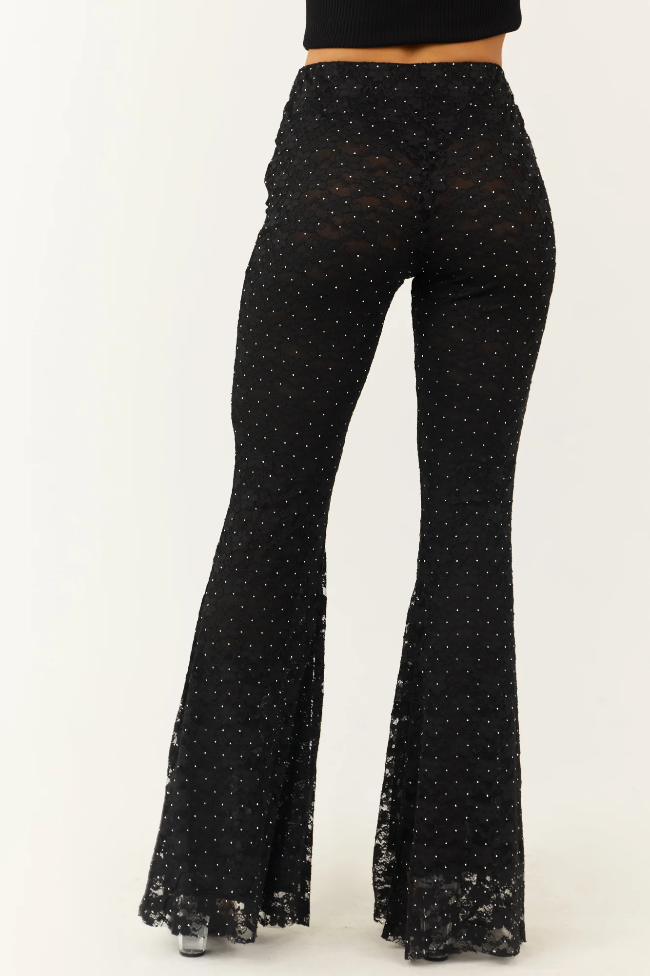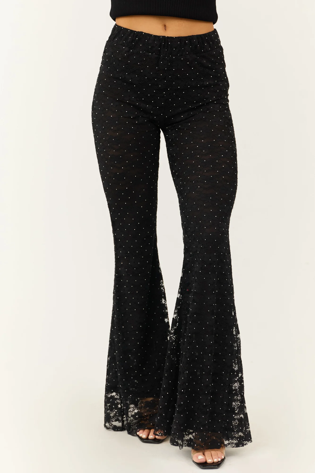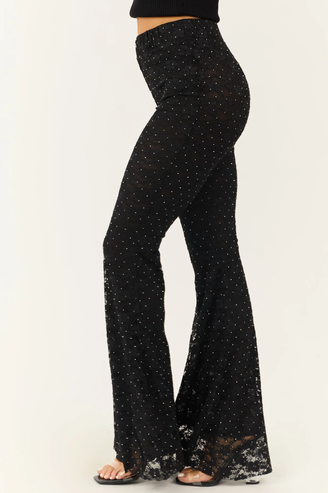 Discover comfort and style with our Floral Lace High Waist Black Pants. Available in S, M, and L sizes with waist measurements of 27to 31and inseam options of 34to 36. Crafted from non-stretchy woven fabric with intricate rhinestone studs, these pants feature an elastic waistband, a flattering flared design, and come lined for your comfort. Made of 95% Polyester and 5% Spandex, these imported pants are hand wash cold recommended. Elevate your look with these chic pants that are perfect for any occasion. Model is 55″ and is wearing a size Small.