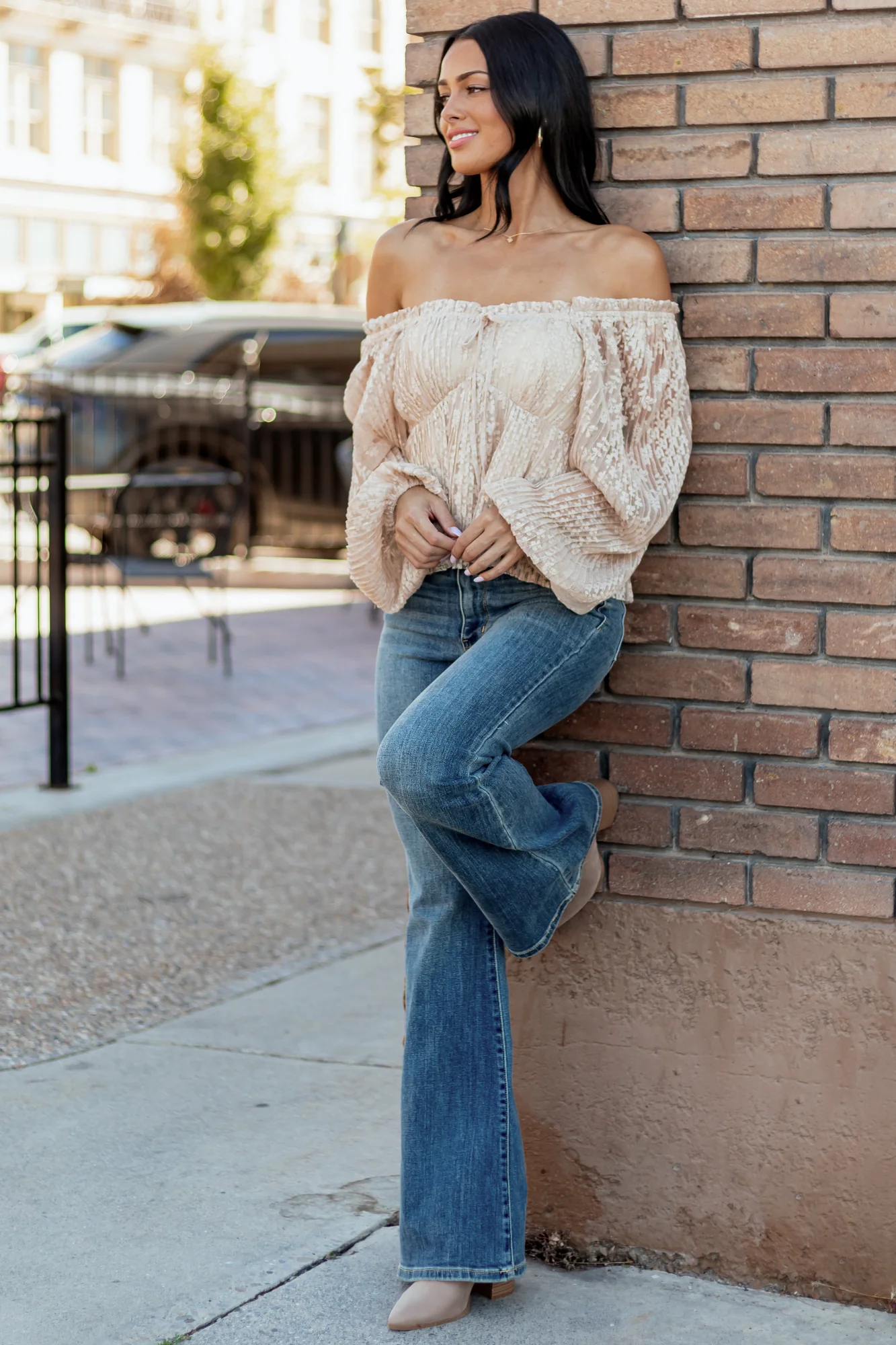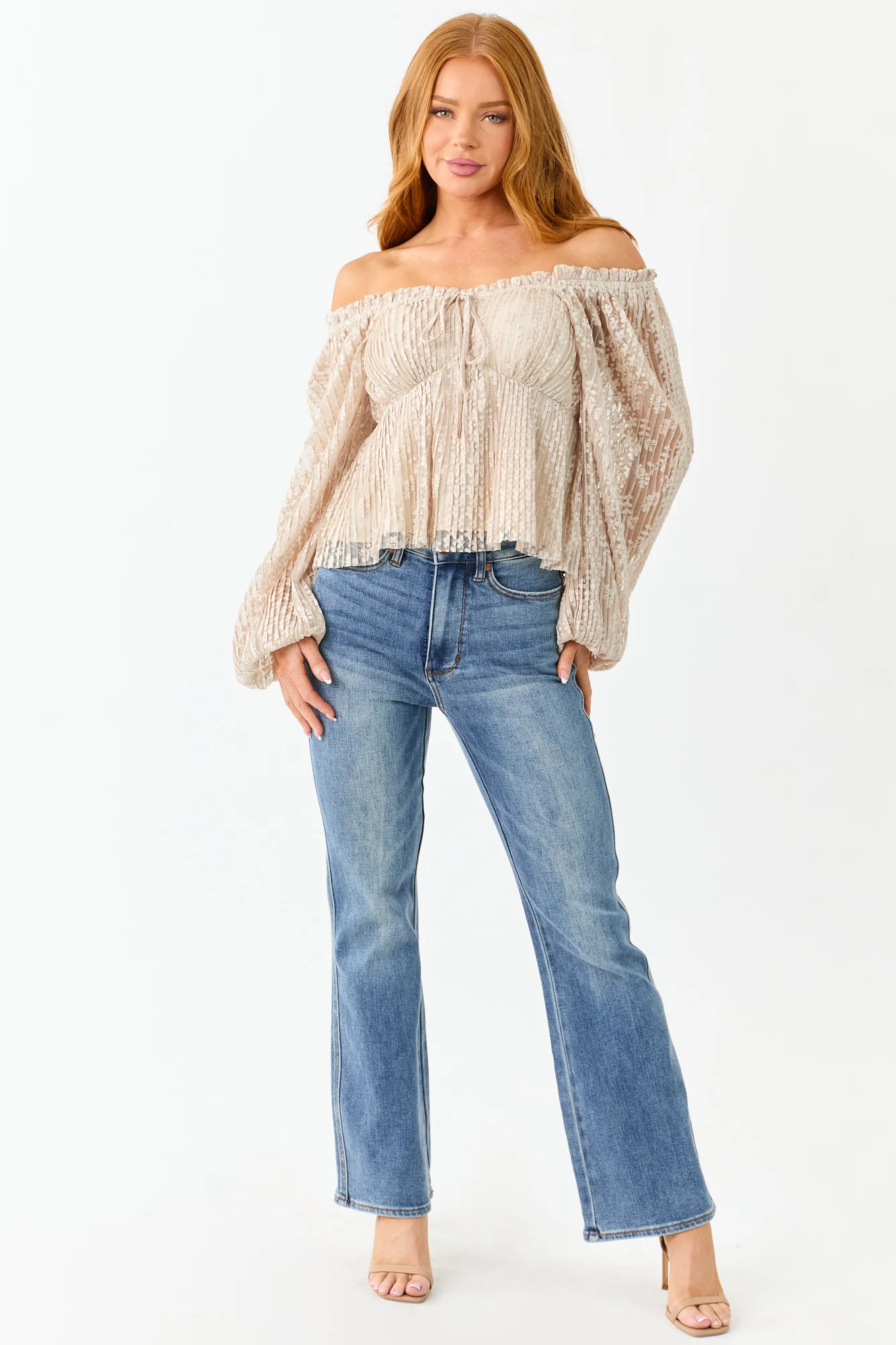 This elegant top features sheer bubble sleeves, lightweight lace, and a flowy babydoll hem, creating a soft and feminine silhouette. Designed with a smocked back, elastic cuffs, non-cinching bust tie, and a lined bodice for added comfort and style. Perfect for dressy occasions and daily wear.