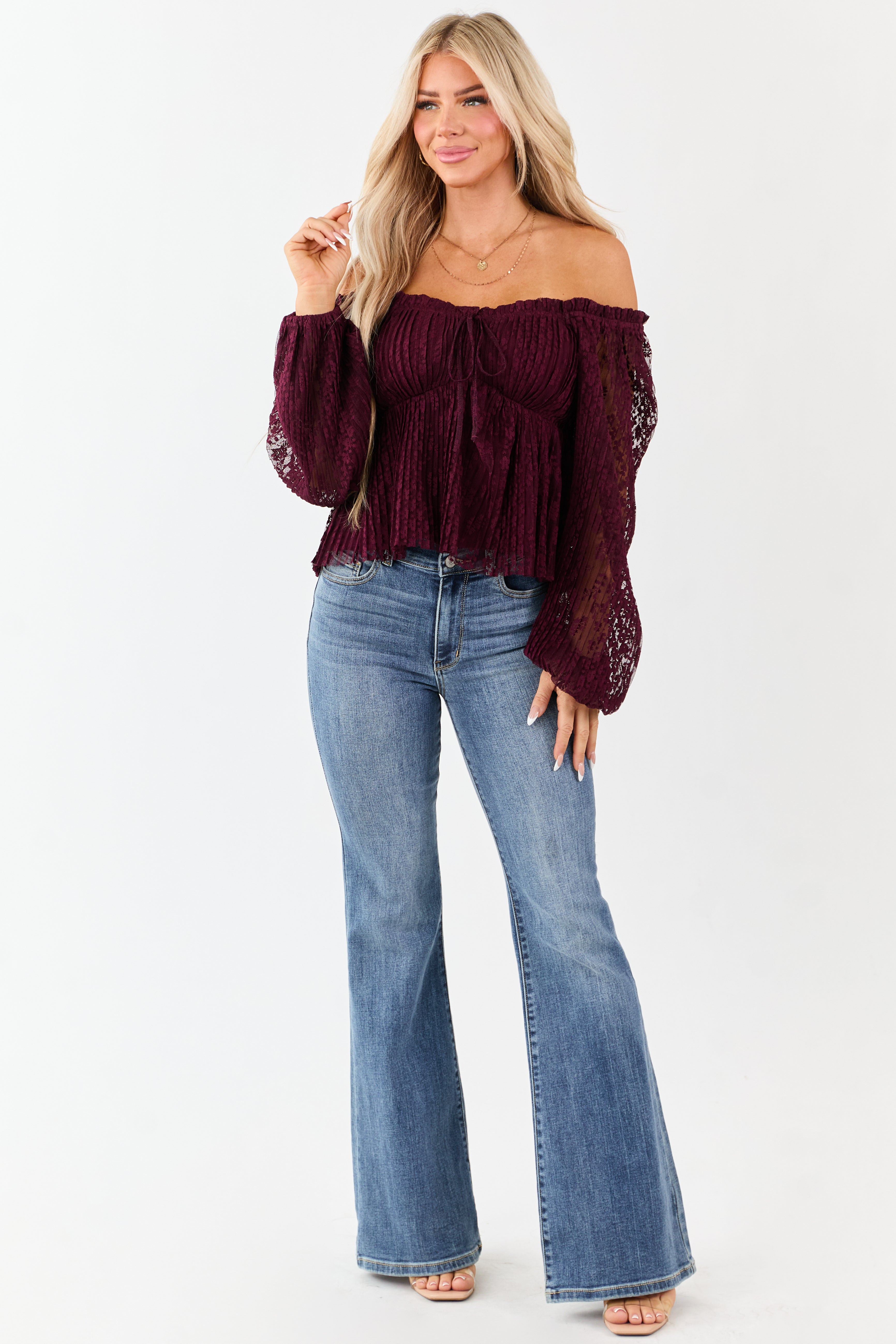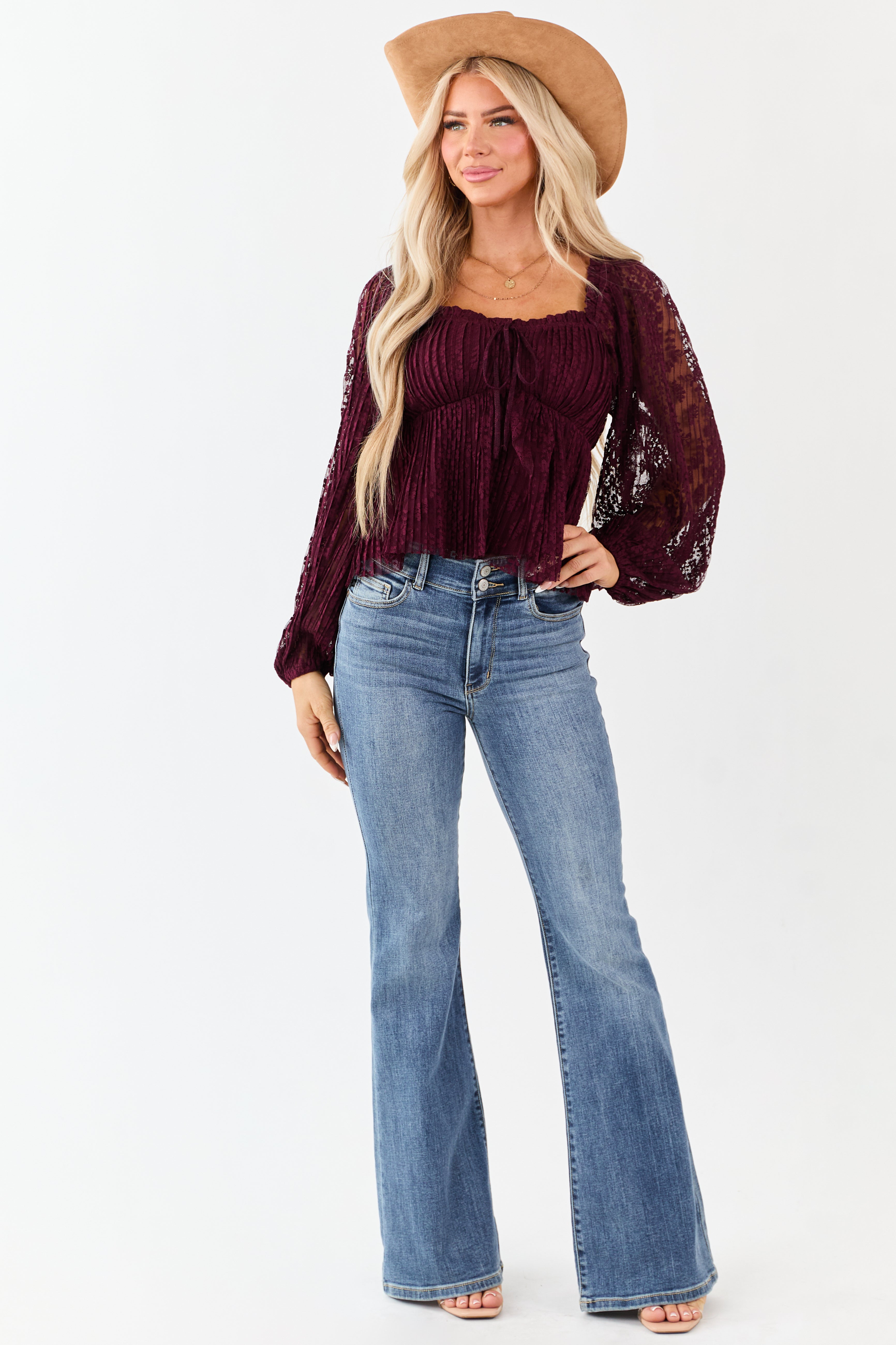 Tags: Listicle Floral Lace Top, Long Sleeve Lace Shirt, Red Lace Blouse, Sheer Bubble Sleeves, Women's Dressy Top