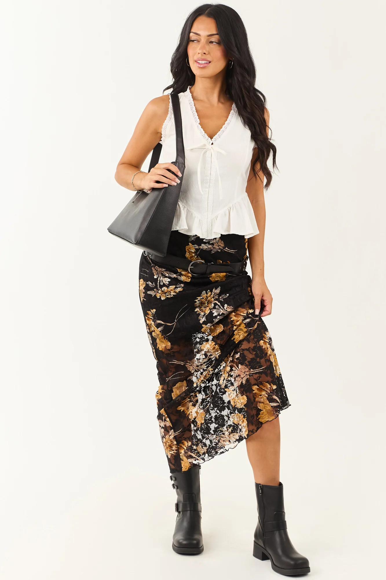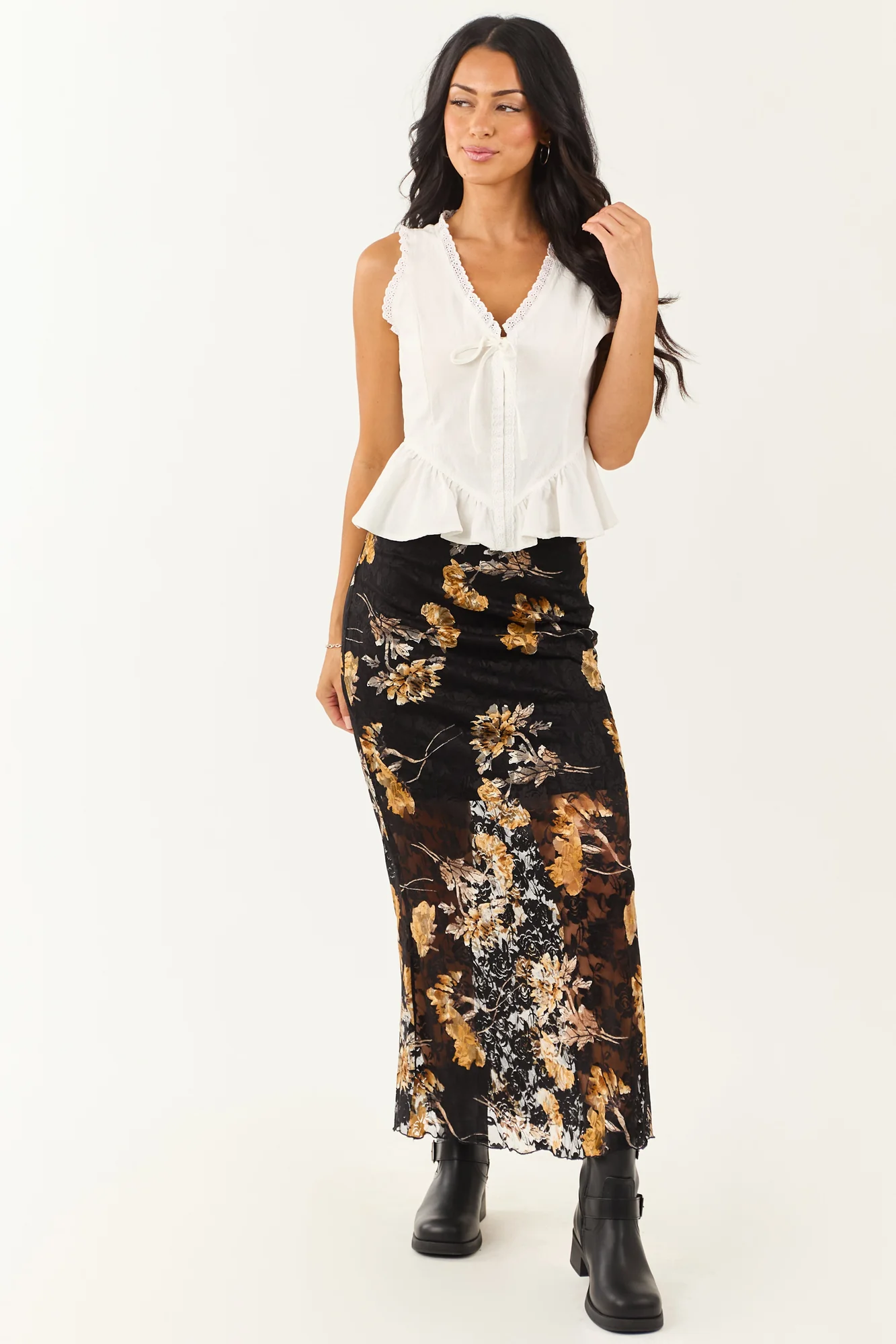 Indulge in the enchanting allure of this black and copper floral lace maxi skirt that exudes elegance and romance. Adorned with bold floral details, sweeping sheer layers, and scallop trimmed waist, this skirt features stretchy sheer lace in shades of Camel, Mauve, and Ivory. The mini-length lining offers a perfect blend of style and comfort. Made from 93% Nylon and 7% Spandex with a 100% Polyester lining, this imported skirt is a stunning addition to your wardrobe. Pair it with your favorite top for a sophisticated and chic look. Model #1 is 57″ tall with a Size 3, 35″ Bust, and 26″ Waist. Model #2 is 59″ tall with a Size 1, 34″ Bust, and 26″ Waist.