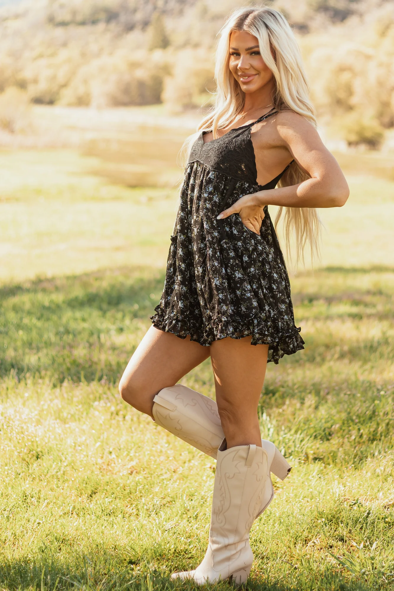 Experience the dreamy elegance of our flowy sleeveless romper featuring soft florals intertwined with delicate lace in shades of Black, Cornflower, Sky Blue, Olive, and Blush. Designed with an open lace bust, adjustable double spaghetti straps, and frill details, this romper exudes charm. The lined shorts offer comfort while the self is crafted from 100% Polyester and the lining from 100% Rayon. A must-have for any fashion-forward individual. This model is wearing a size Small with a bust of 34 inches and a waist of 26 inches. Embrace style and comfort effortlessly!