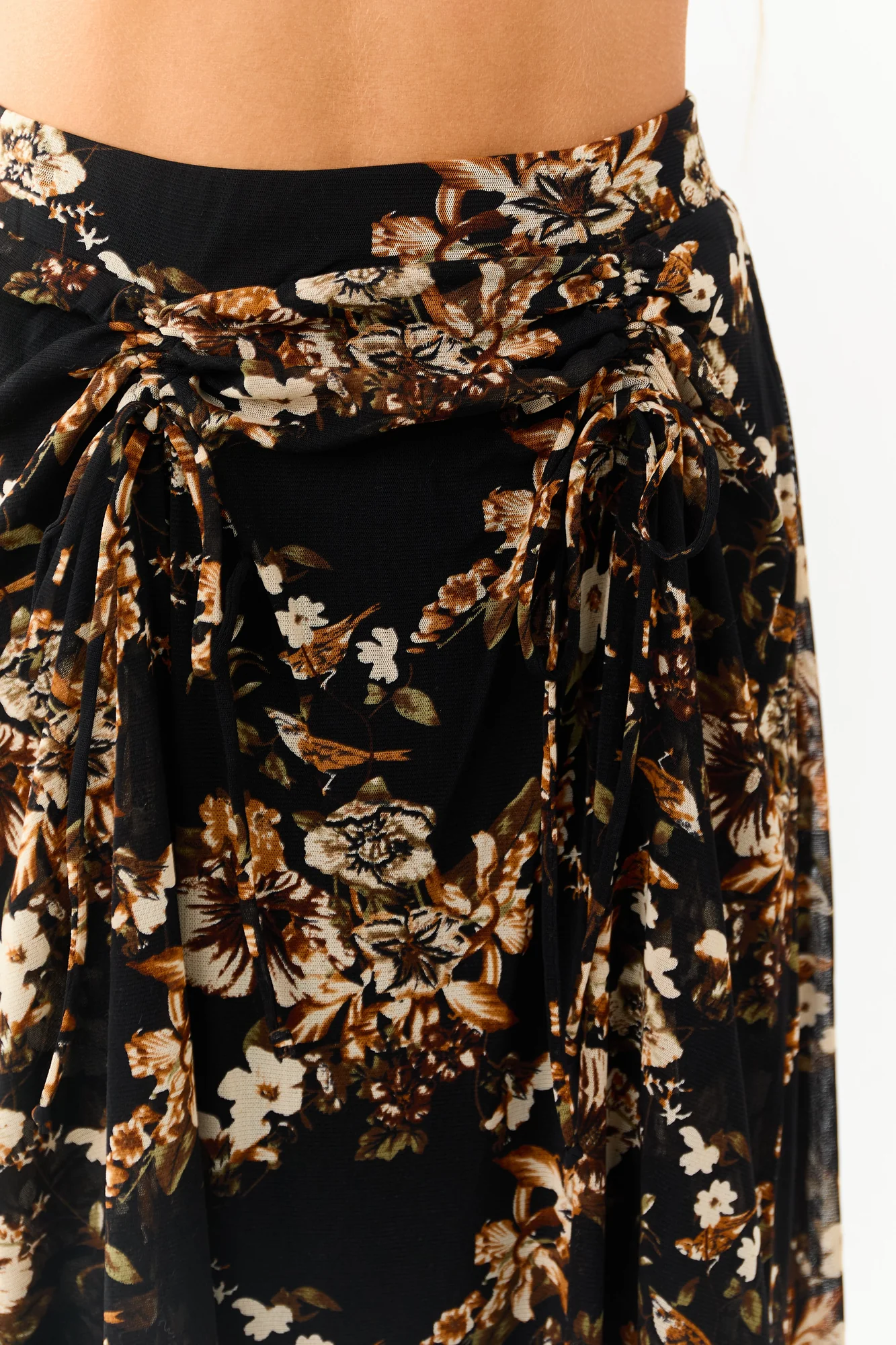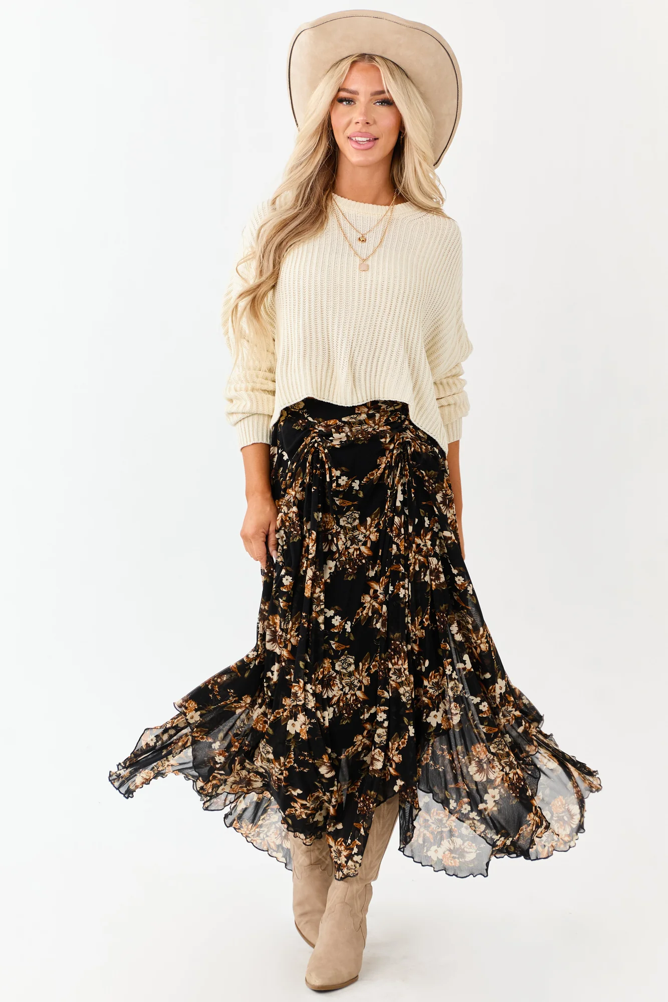 This gorgeous maxi skirt features warm-toned florals cascading over soft stretchy mesh, enhancing your style effortlessly. The elastic waistband and front cinched ties offer a comfortable fit. Made of 100% Nylon with a 100% Polyester lining, this skirt is perfect for any occasion. Pair it with the Cream Relaxed Rib Knit Crew Neck Cropped Sweater for a chic look. Garment specifications for size small: Waist – 26″, Length – 29.5″ to 40.5″. Imported.