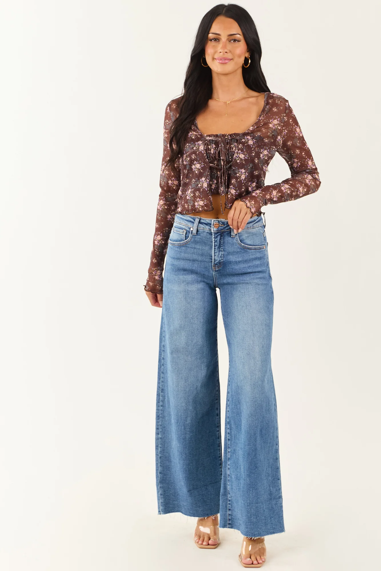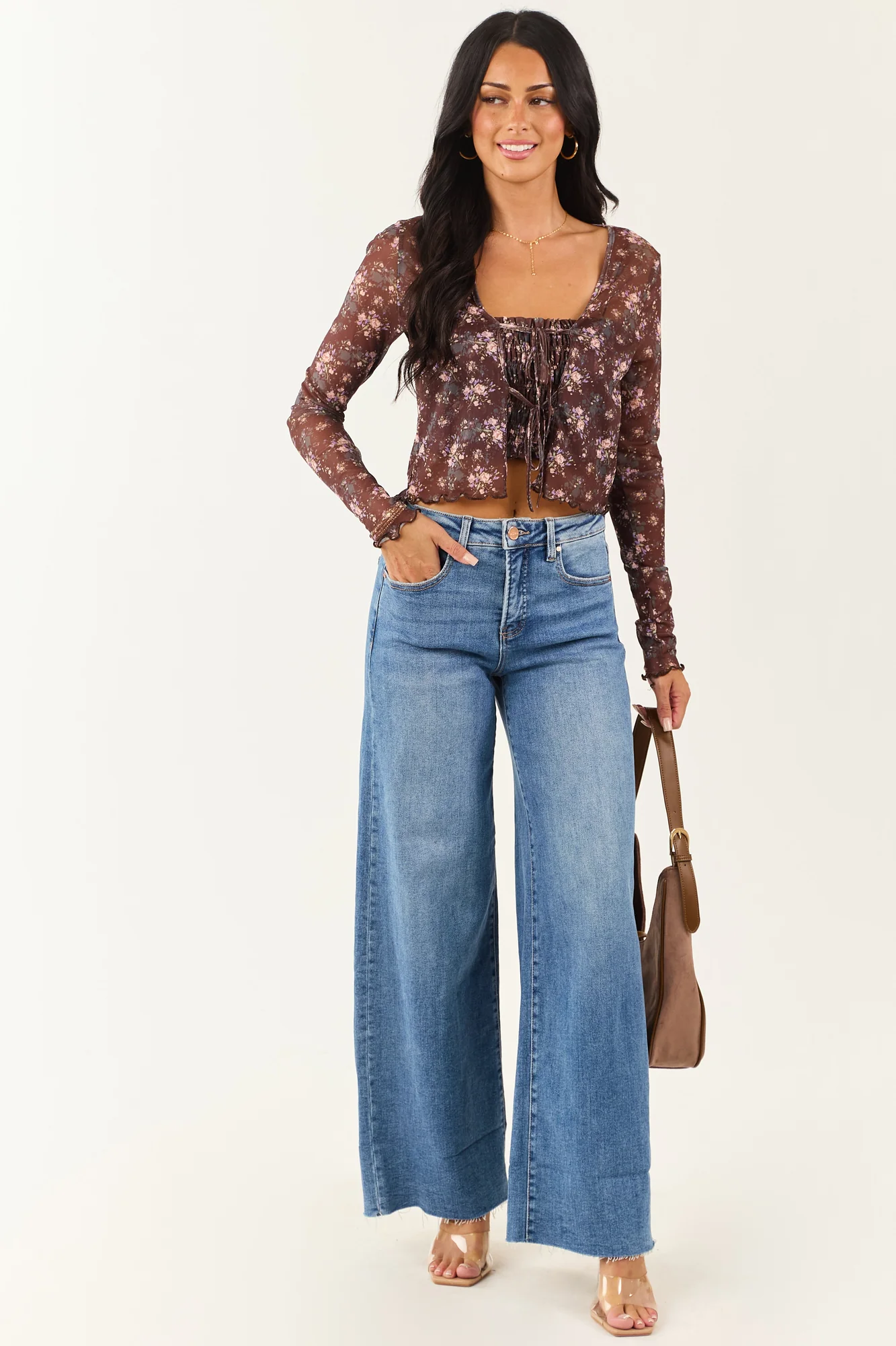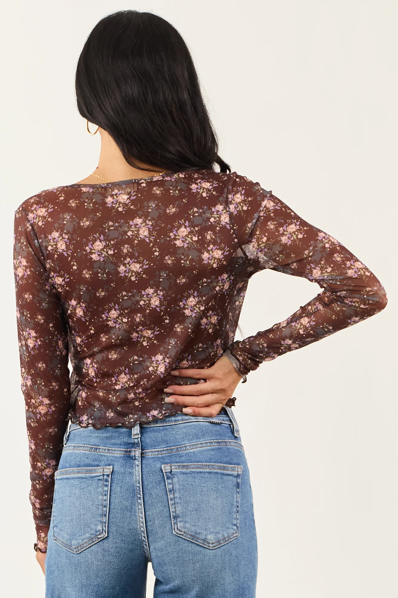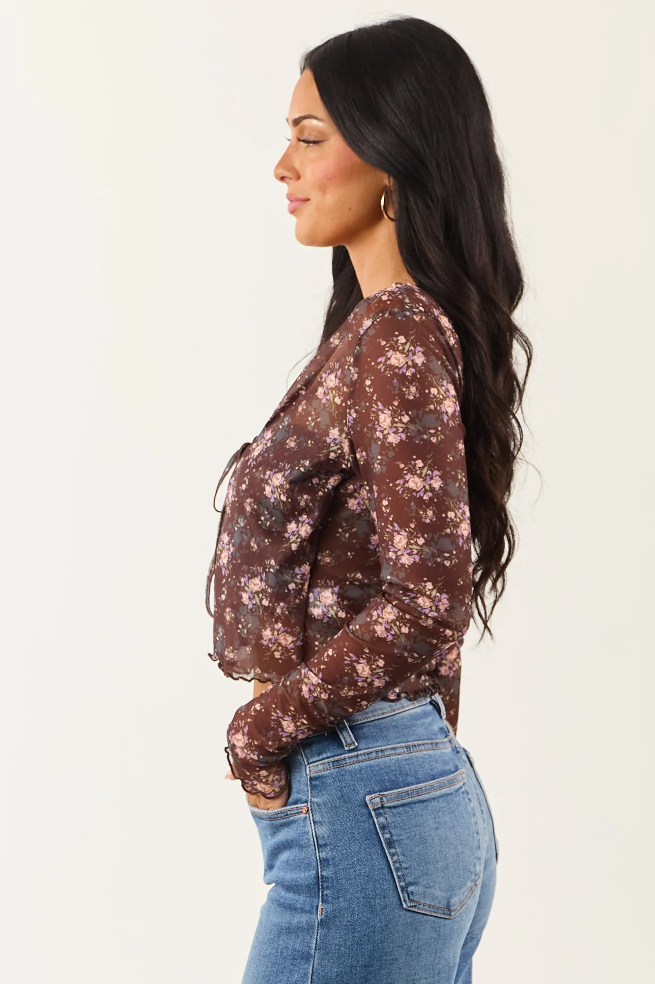 Embrace sheer romance in motion with this cocoa floral mesh top featuring layered detailing, a front tie, and a semi-cropped length for a flirty fun finish. The stretchy mesh fabric in Baby Pink, Lilac, and Sage hues offers a delicate appeal. Designed with adjustable front tie closures, smocked inside layering, lettuce trim, and a sheer lined bodice for a stylish look. Crafted from 95% Polyester and 5% Spandex, this top is both elegant and comfortable. Perfect for various occasions, from casual outings to special events. Imported. Model is wearing a size Small and has a bust of 34″, waist of 26″, and height of 59″.