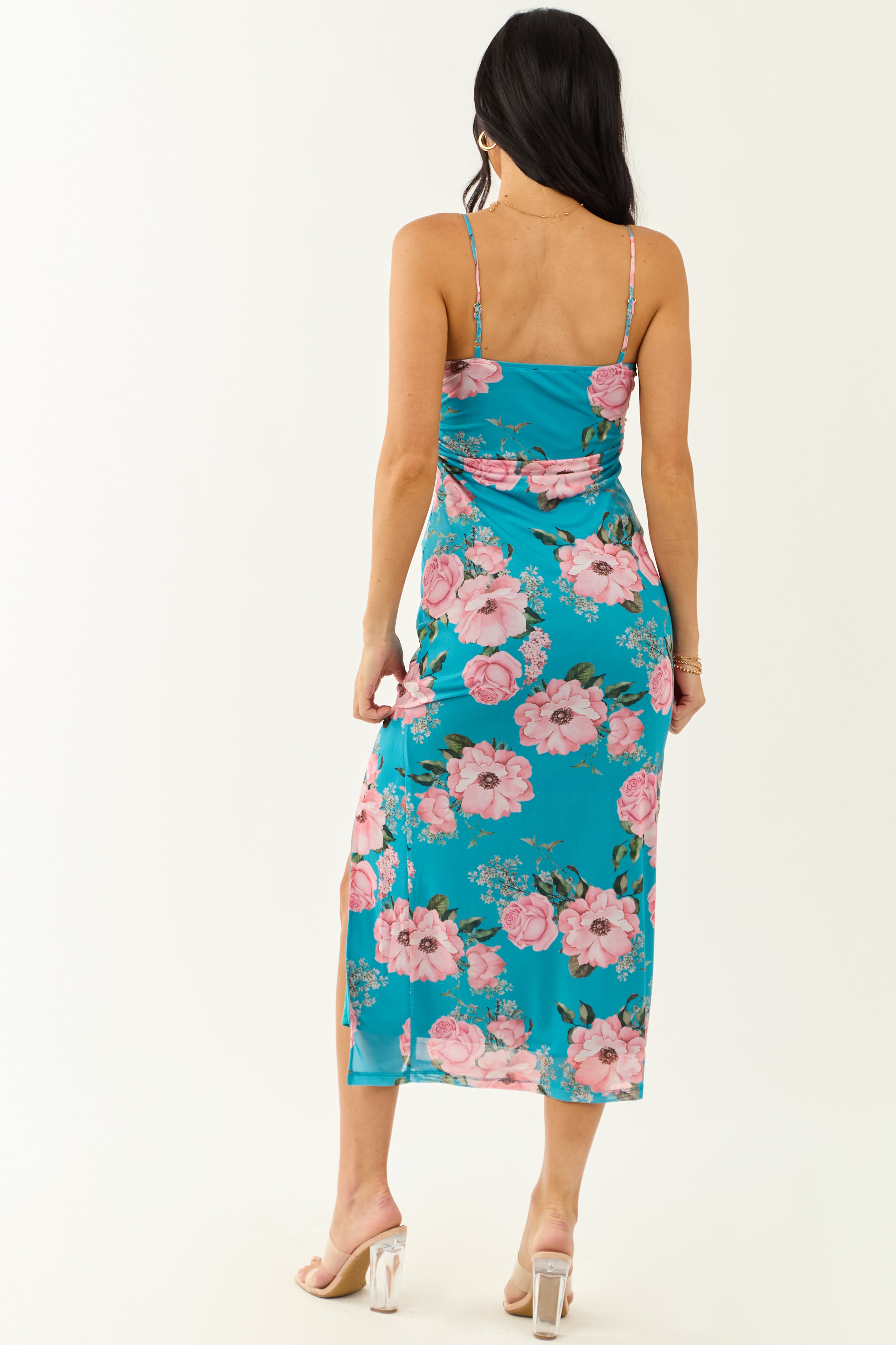 This floral mesh sleeveless midi dress in stunning shades of Azure, Carnation, and Ivory is a blend of bold blooms and breezy fabric. Designed for both sultriness and support, it features a very fitted bodice, adjustable spaghetti straps, ruched sides, a sweetheart neckline, a side hem slit, and a built-in wired bra for added comfort. Perfect for summer occasions, the dress is lined and made of 95% Polyester and 5% Spandex for a stretchy and flattering fit. Embrace elegance and comfort with this must-have piece . Please note that due to the unique fabric print, each item may vary slightly.