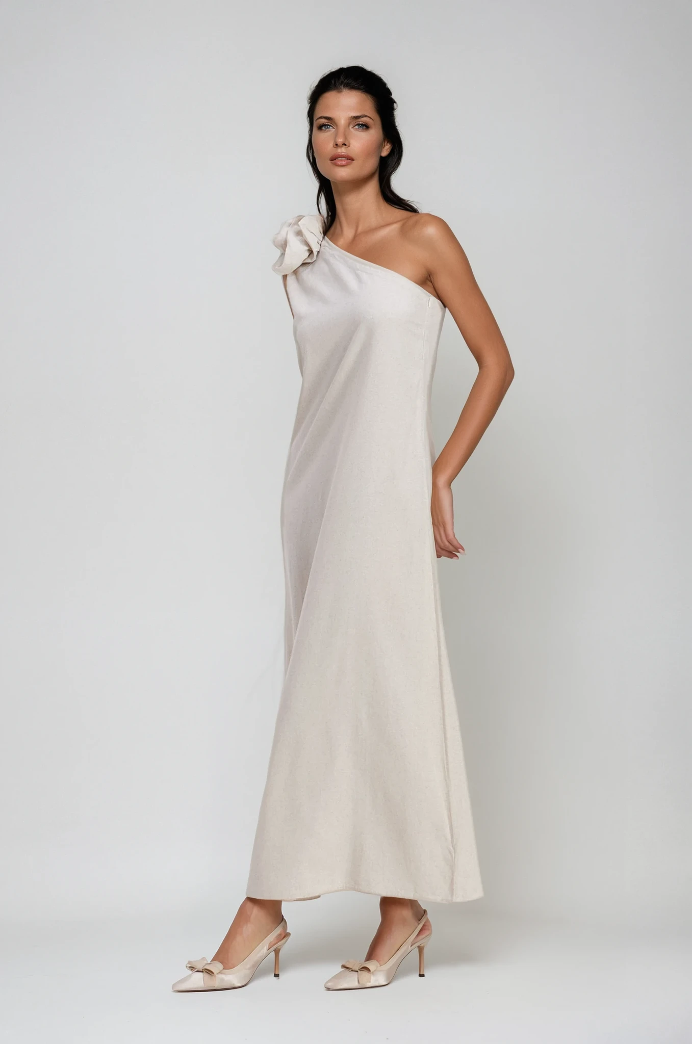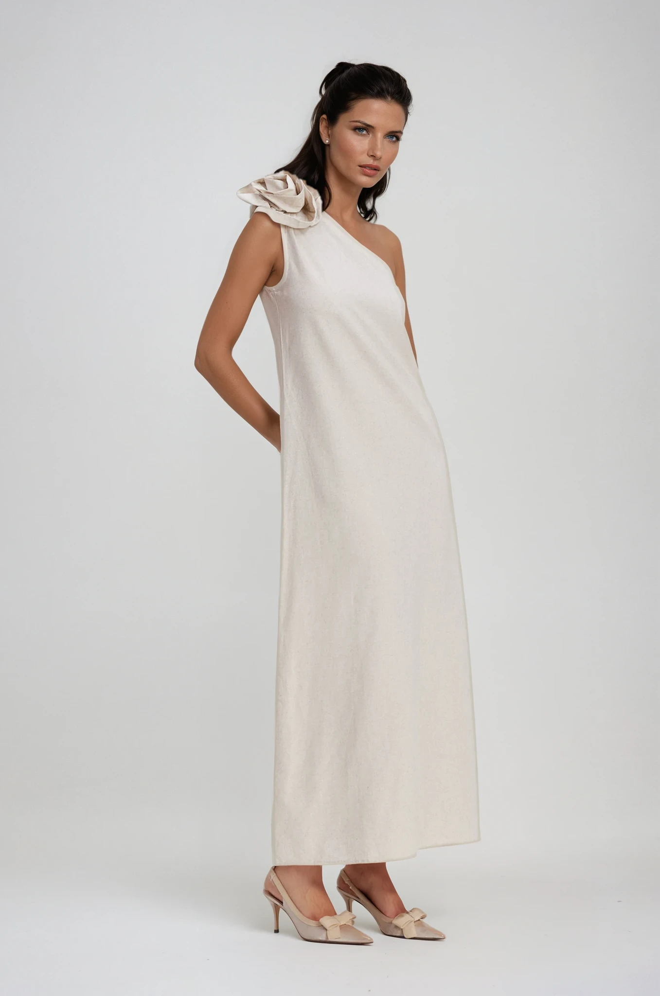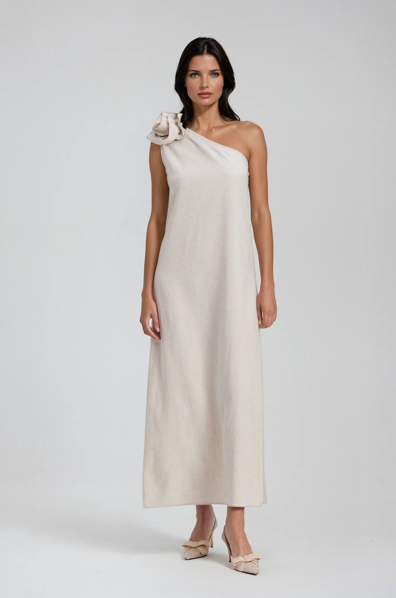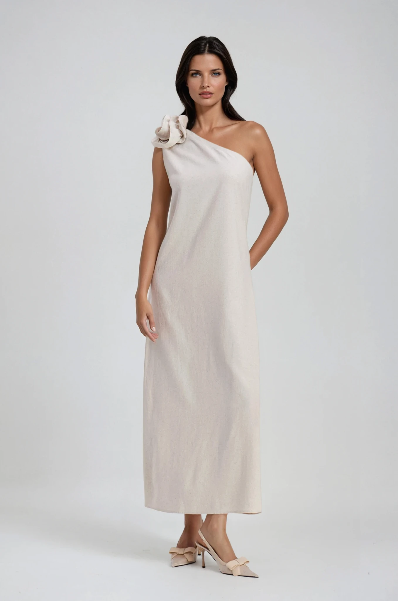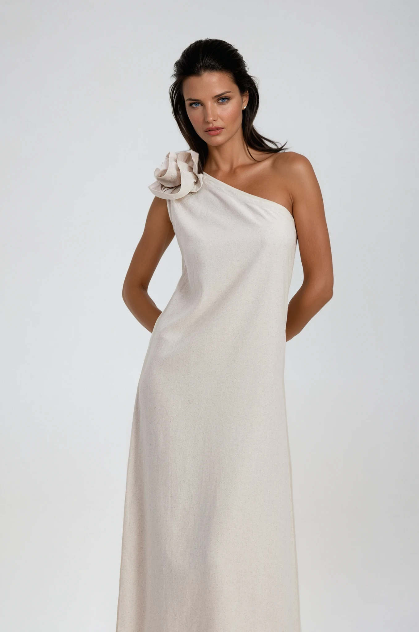 Elevate your style with the Floral One Shoulder Maxi Dress in White. This exquisite gown features a beautifully crafted floral pattern and a sleek one-shoulder design, combining classic charm with modern sophistication. The floor-length silhouette drapes gracefully, enhancing various body shapes, while the singular shoulder accent adds a touch of refined asymmetry. Designed for upscale events, this dress exudes timeless elegance and refined beauty. Non-Stretch Fabric. Care: Gentle Machine Wash. Please note that the color may slightly vary due to lighting during photography.