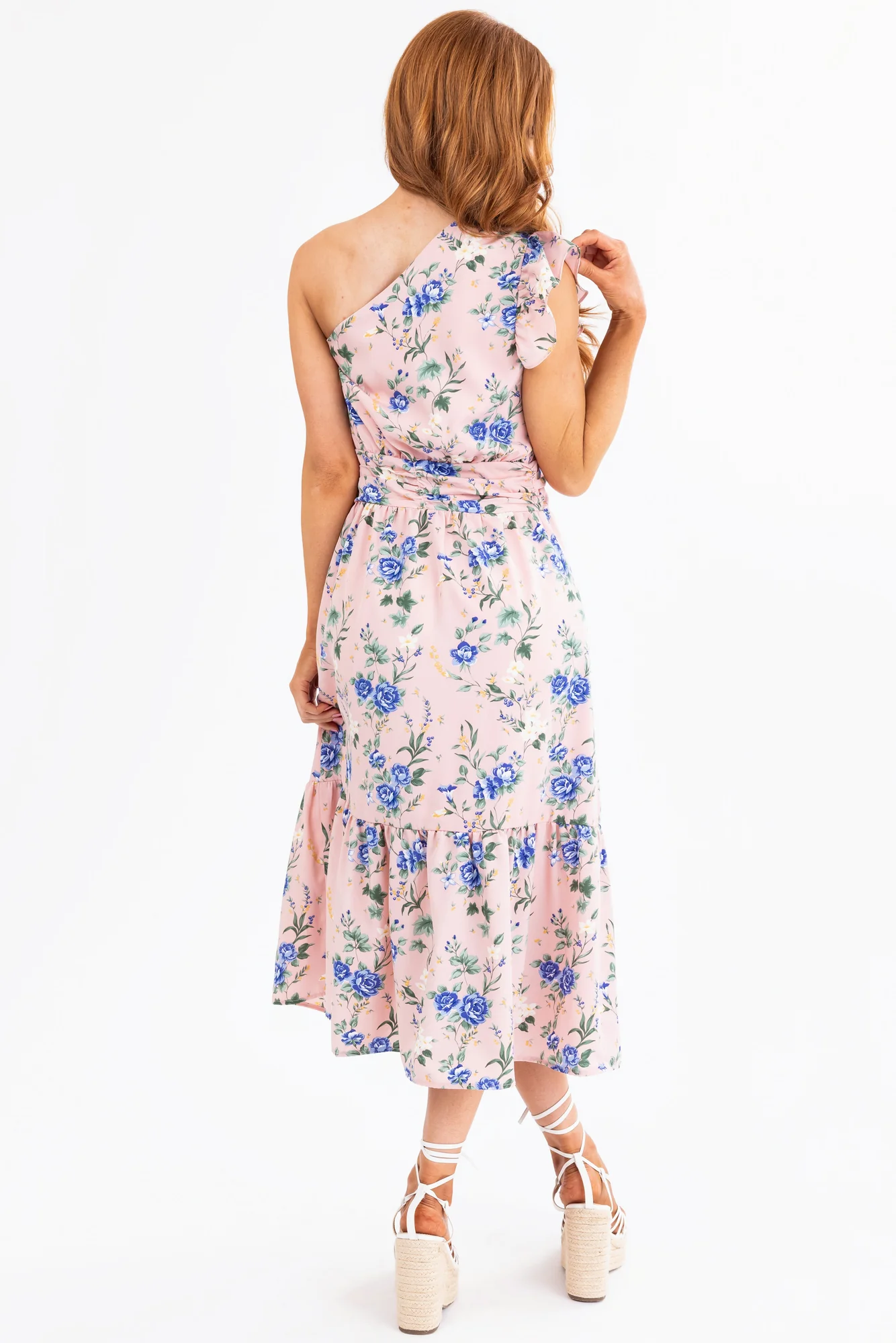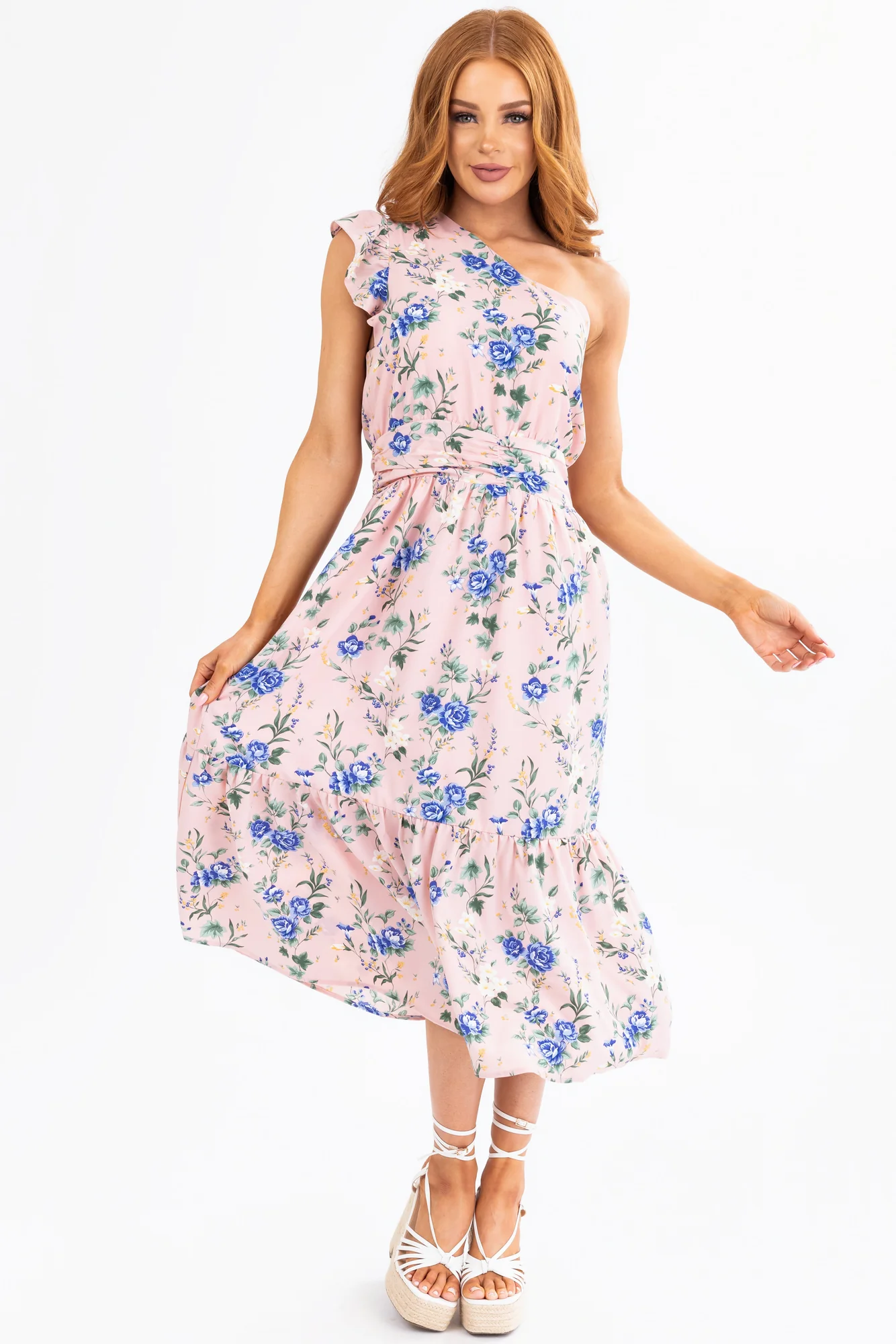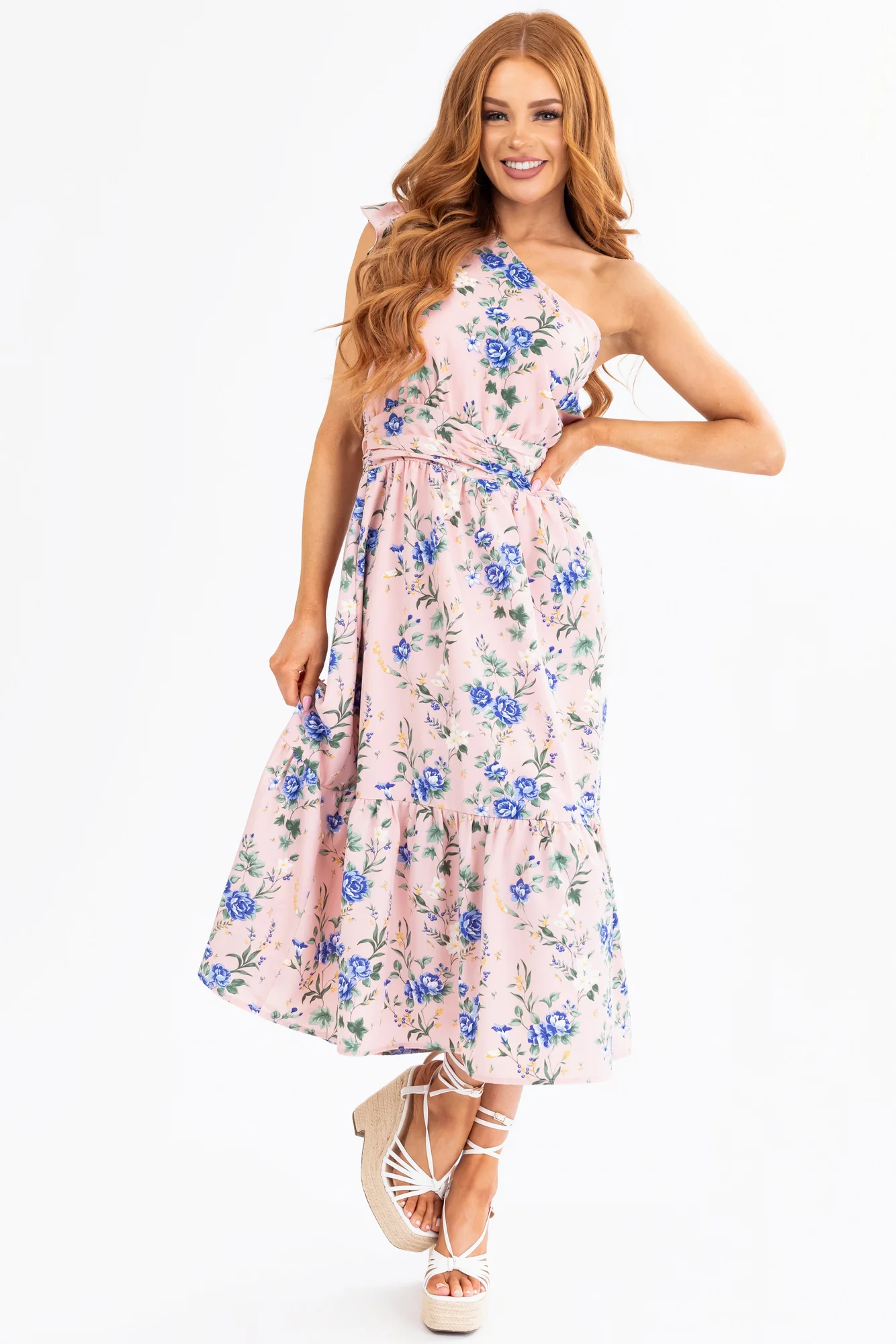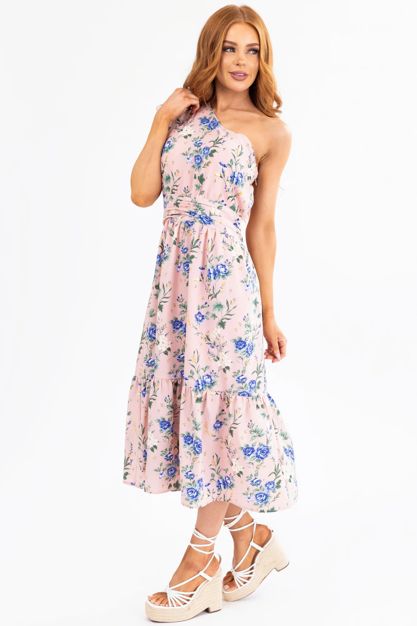 This stunning Floral One Shoulder Midi Dress in Cherry Blossom print offers a unique blend of style and elegance. With a single ruffled sleeve, pleated waist details, and a tiered bottom, this non-stretchy woven dress exudes grace. The dress features vibrant shades of Mustard, Forest Green, Sunshine, Cobalt, Ivory, and Sage, creating a perfect ensemble for various occasions. Made of 100% polyester with a 100% Rayon lining, this dress is both comfortable and fashionable, perfect for any event. Hand wash cold, do not bleach, line dry, iron at low heat. Model is wearing a size Small – Height: 55″, Bust: 31″, Waist 24″.