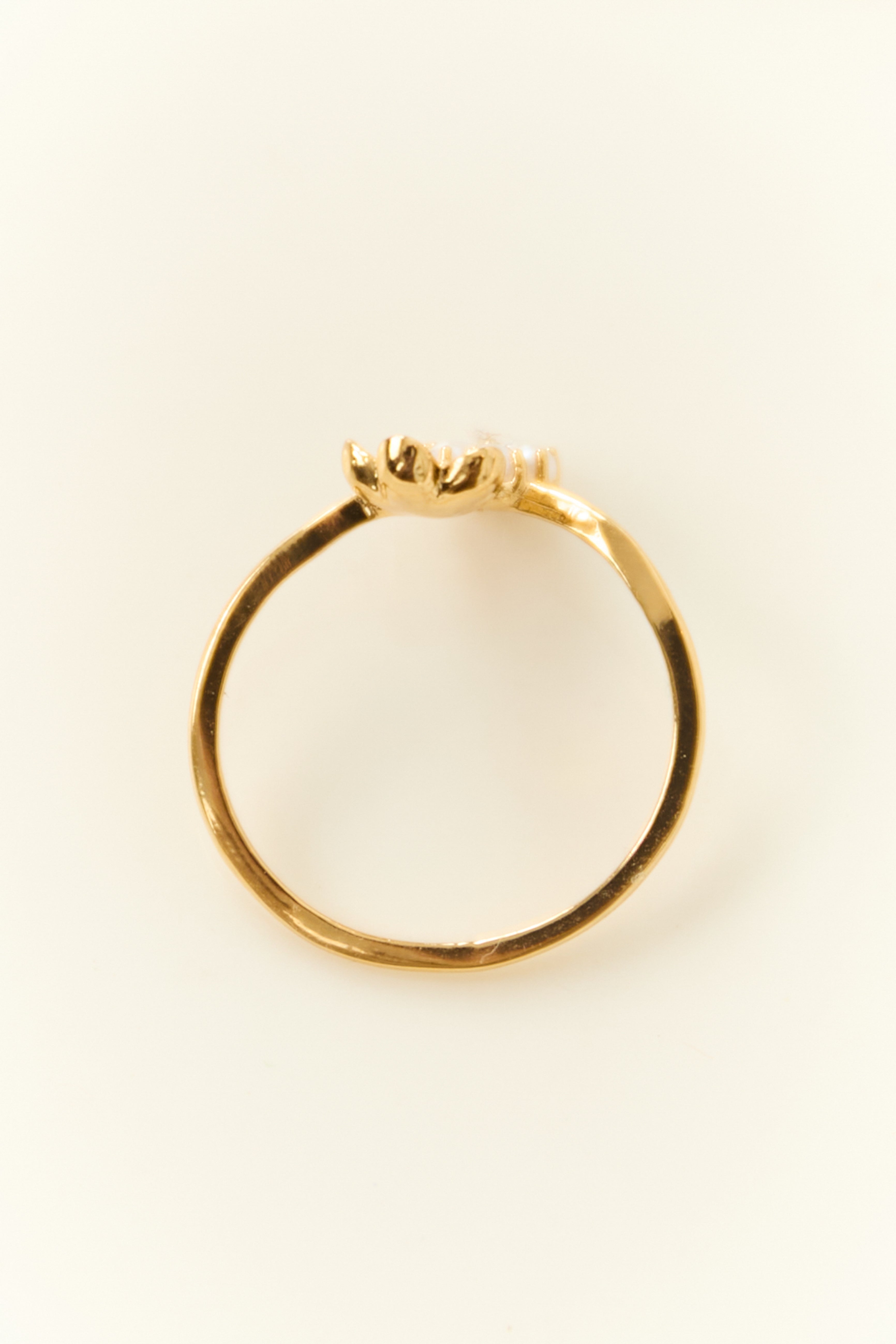 Experience sophistication with our Gold Floral Pearl Open Band Ring. Features a metallic flower design in off-white shade with rhinestone and pearl details. Imported with a circumference suitable for size 6. Elevate your style effortlessly.