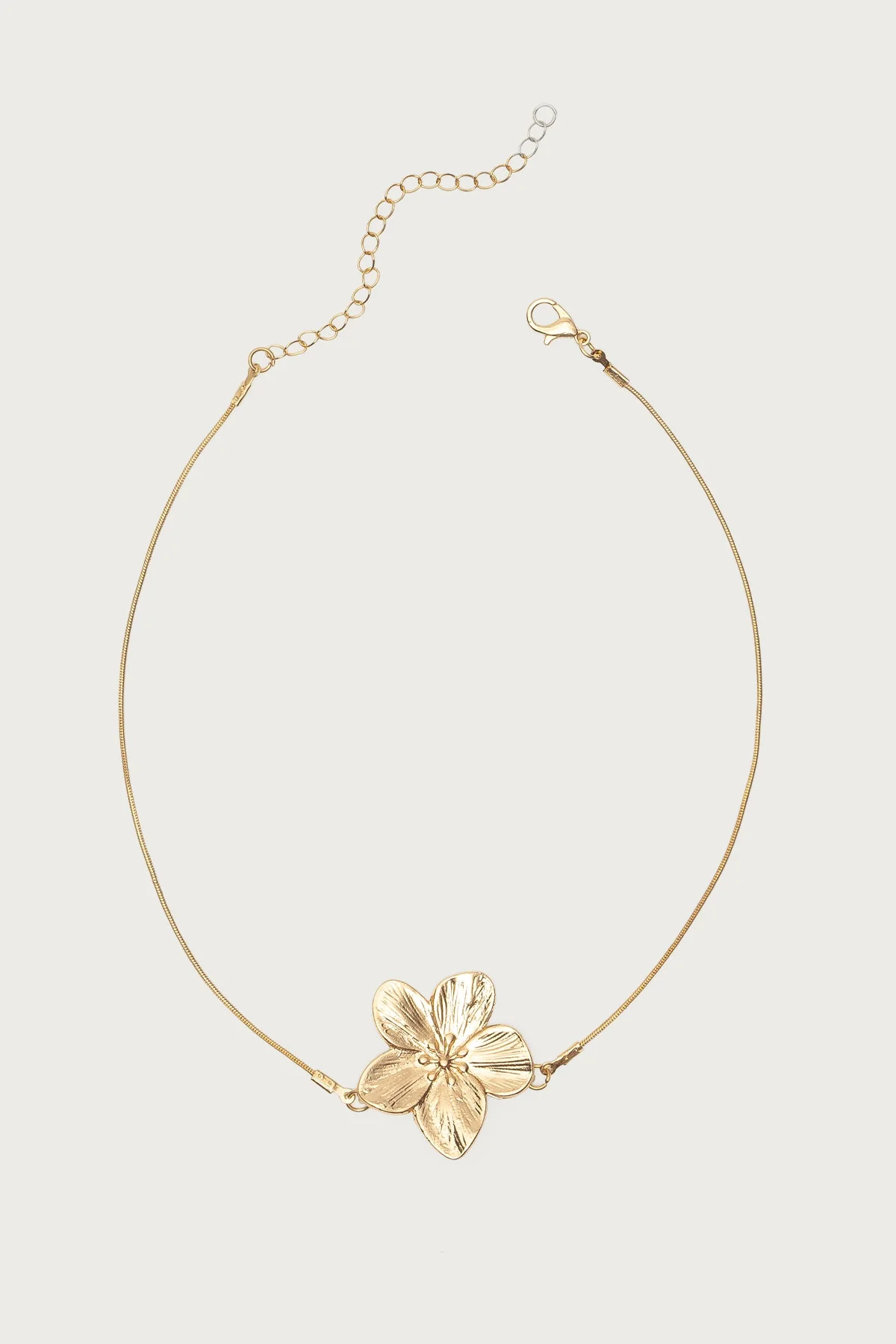 Elevate your style with our Botanical Babe Necklace featuring a large floral pendant crafted from high-quality gold tone metal. This exquisite piece measures 13.1 inches in length, adding a touch of elegance to your look. To maintain its beauty, avoid direct contact with perfume, soap, or creams. Discover the perfect blend of nature-inspired design and sophistication with this stunning necklace.