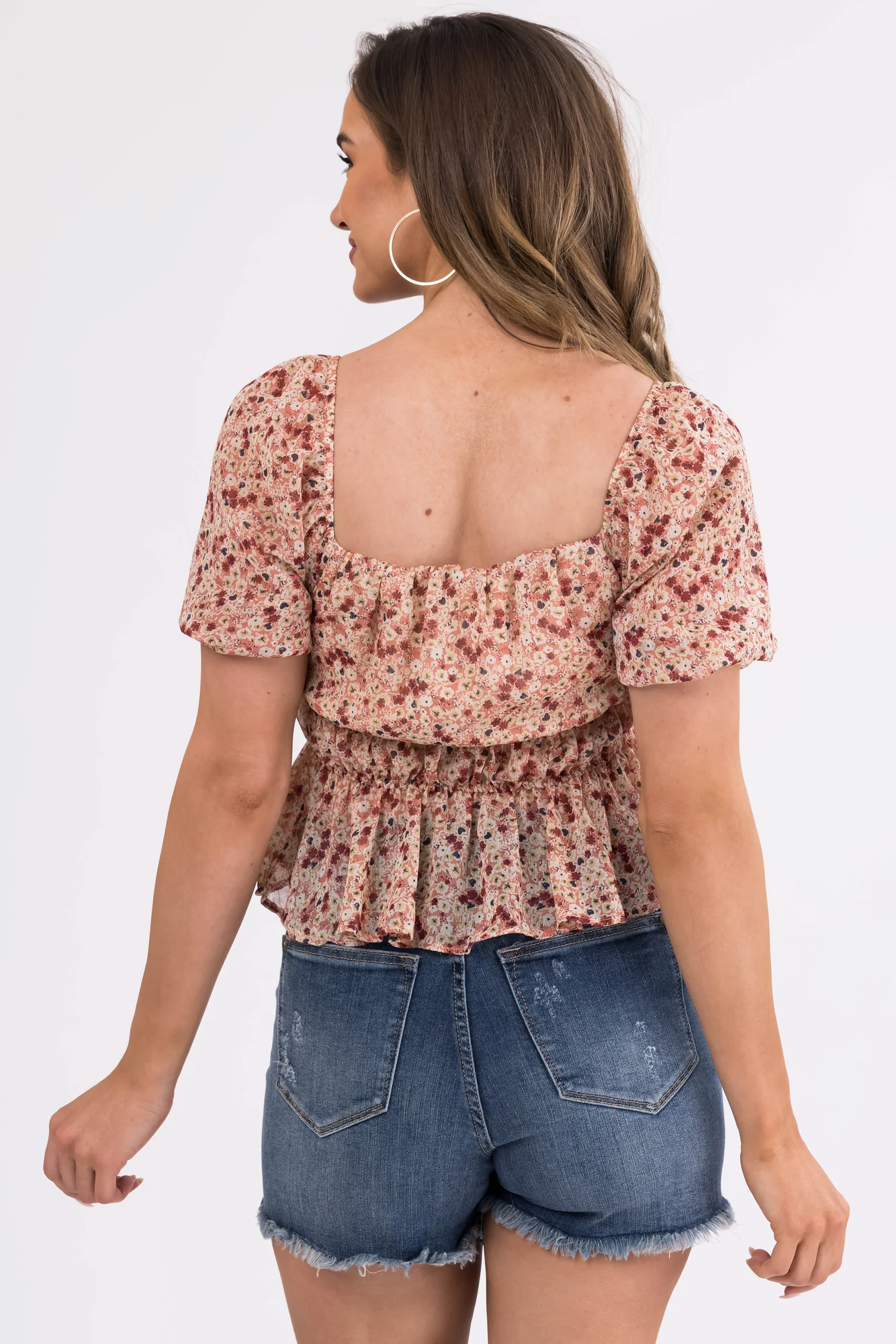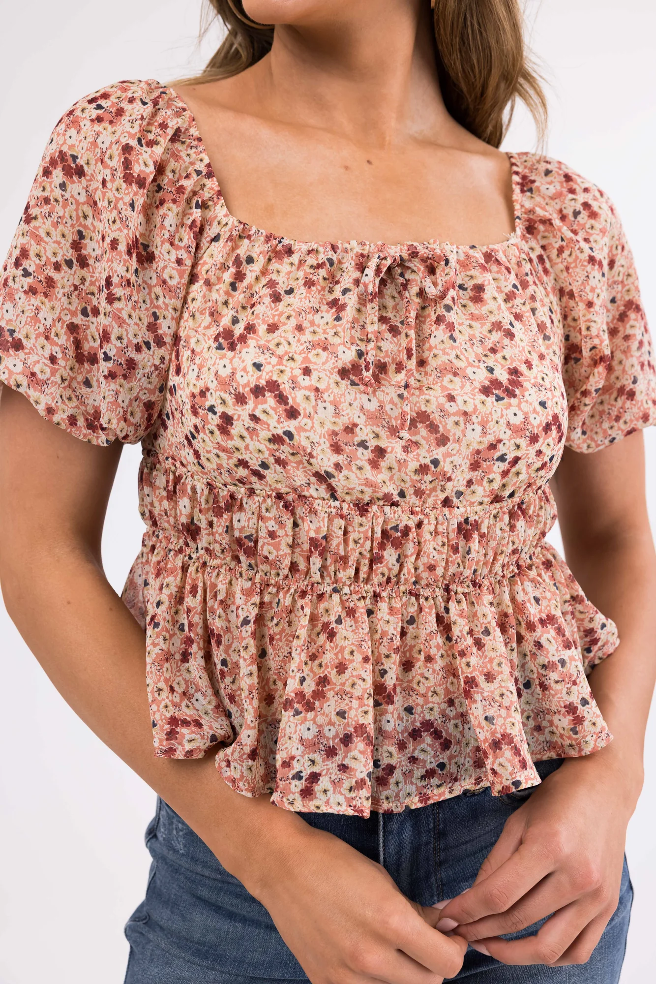 Stay trendy with our Floral Peplum Sleeve Top in beautiful shades of Wine, Ivory, Light Mustard, and Black. This chic top features puff sleeves, elastic cuffs, square neckline, double elastic waist, and ruffle peplum hem for a stylish look. Made from 100% Polyester, this non-stretchy woven top is perfect for various occasions and pairs well with different bottom wear. Hand wash cold, avoid bleach, and hang or line dry for long-lasting wear. Available in sizes S, M, and L.