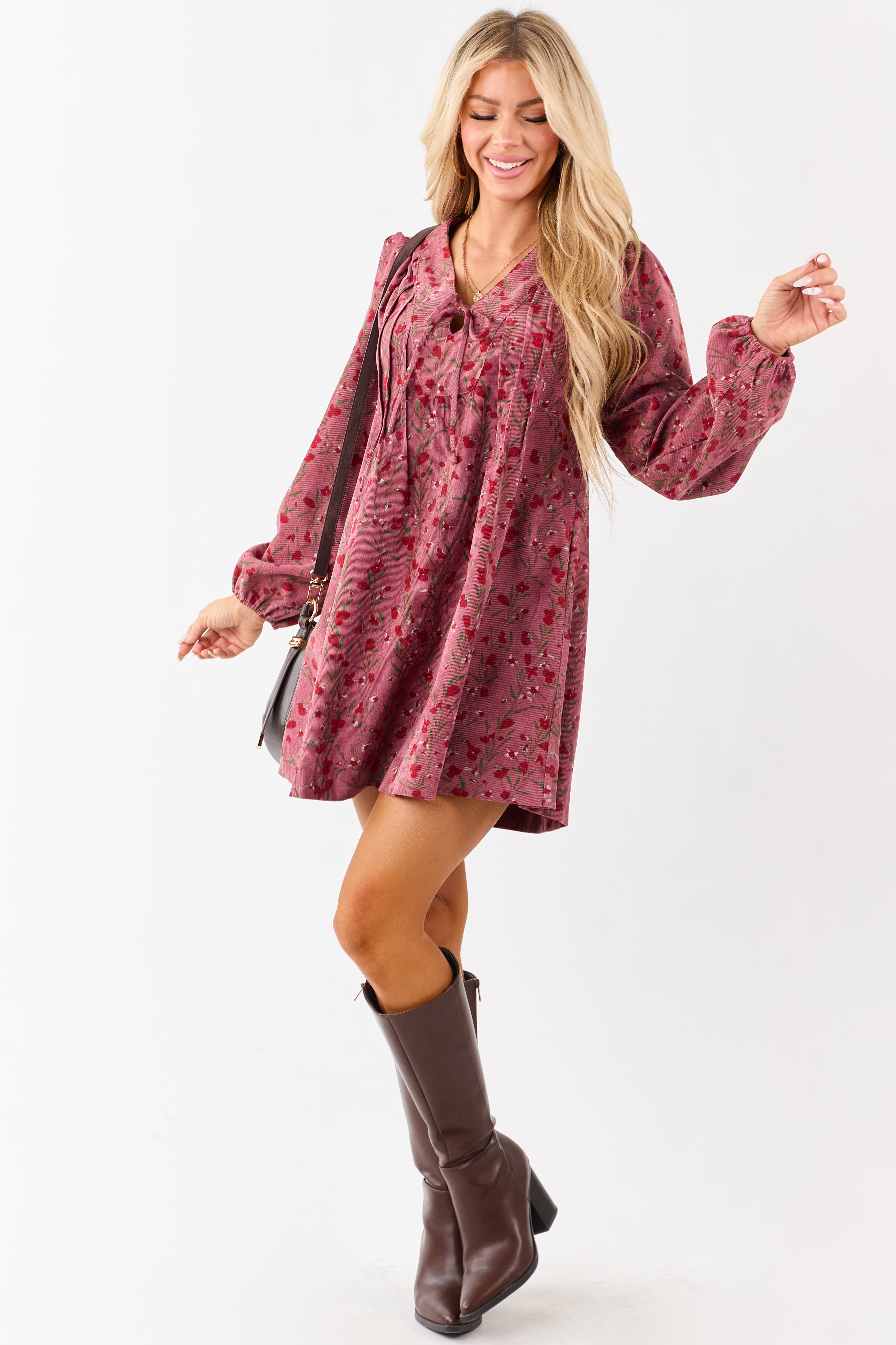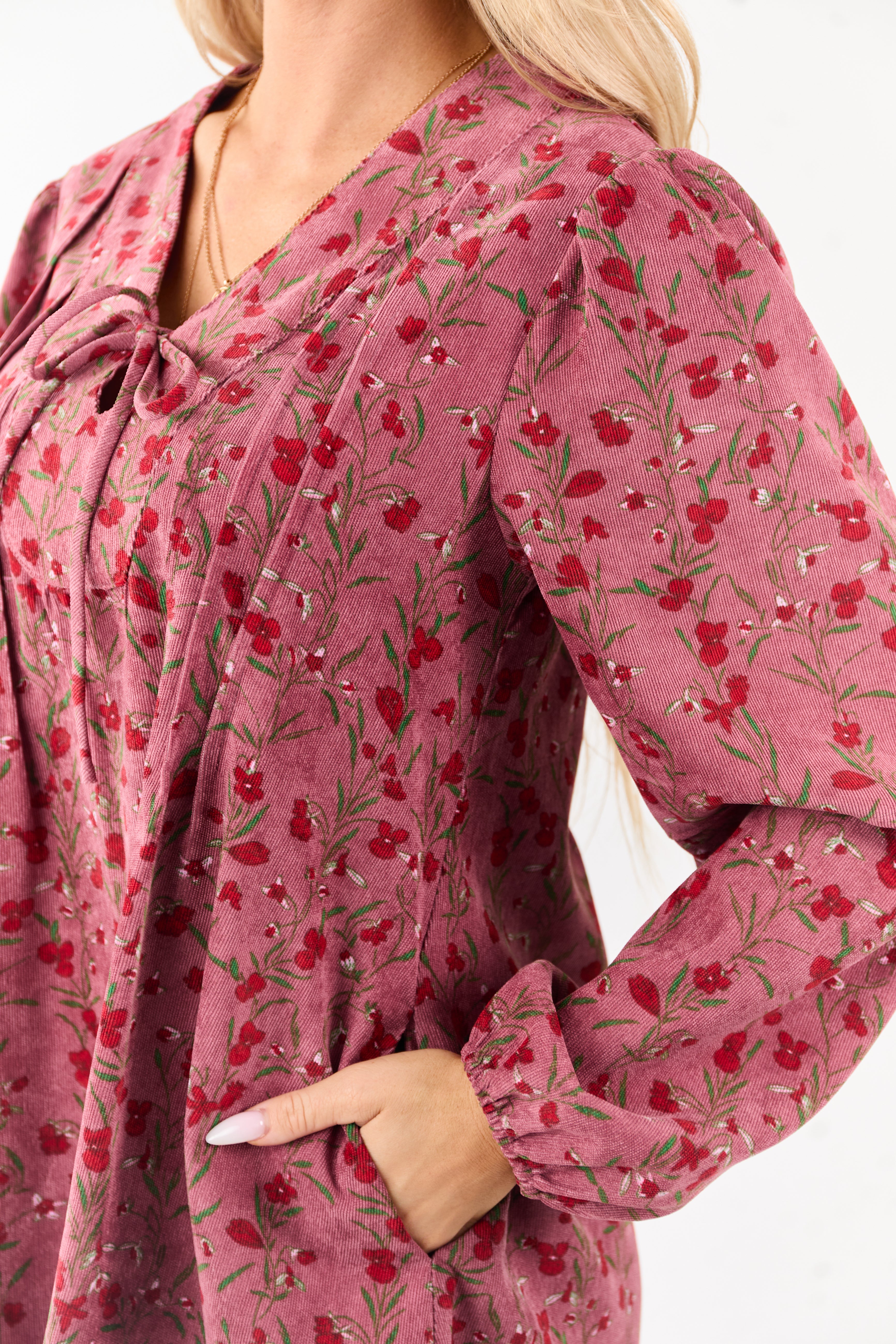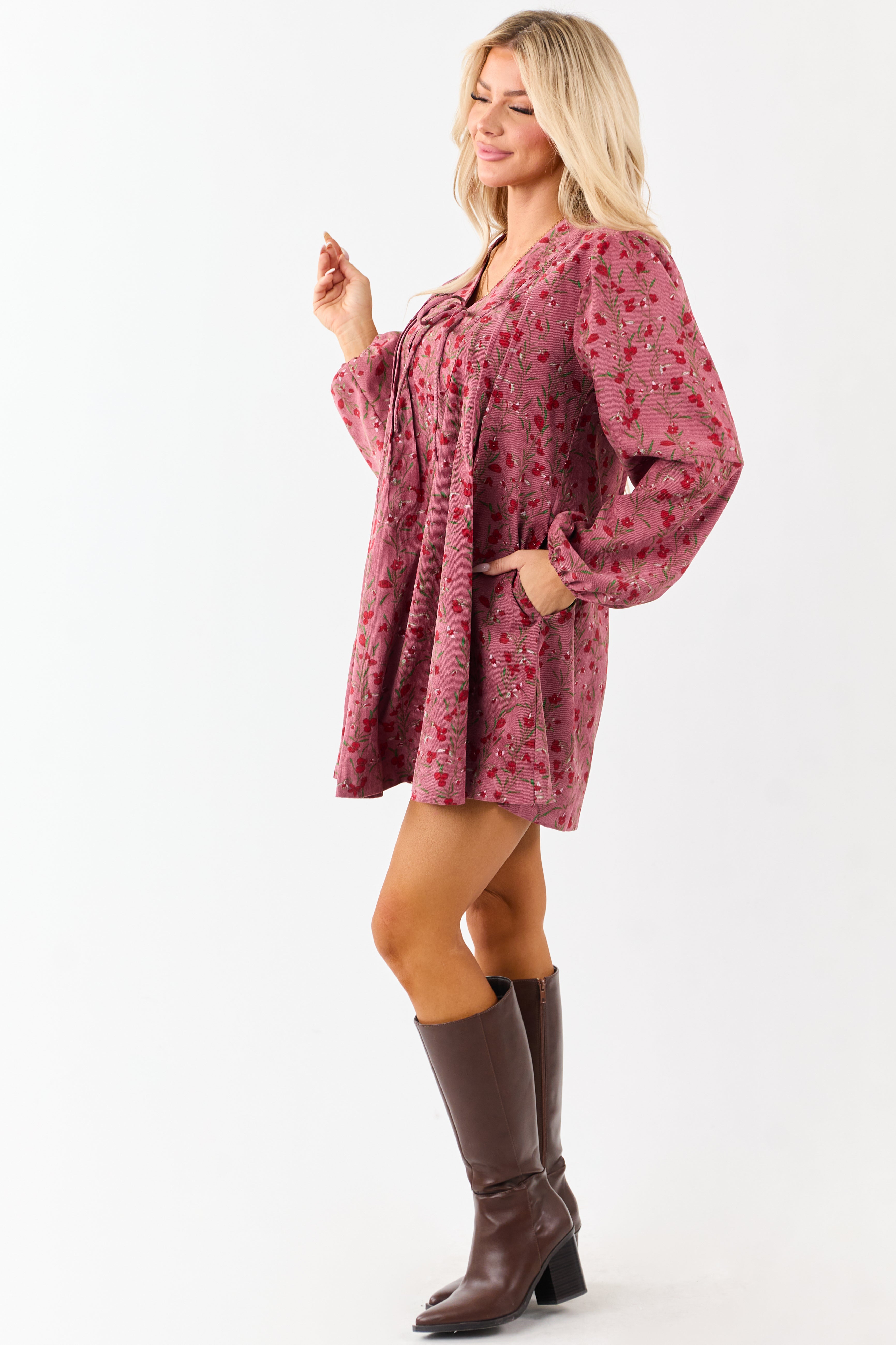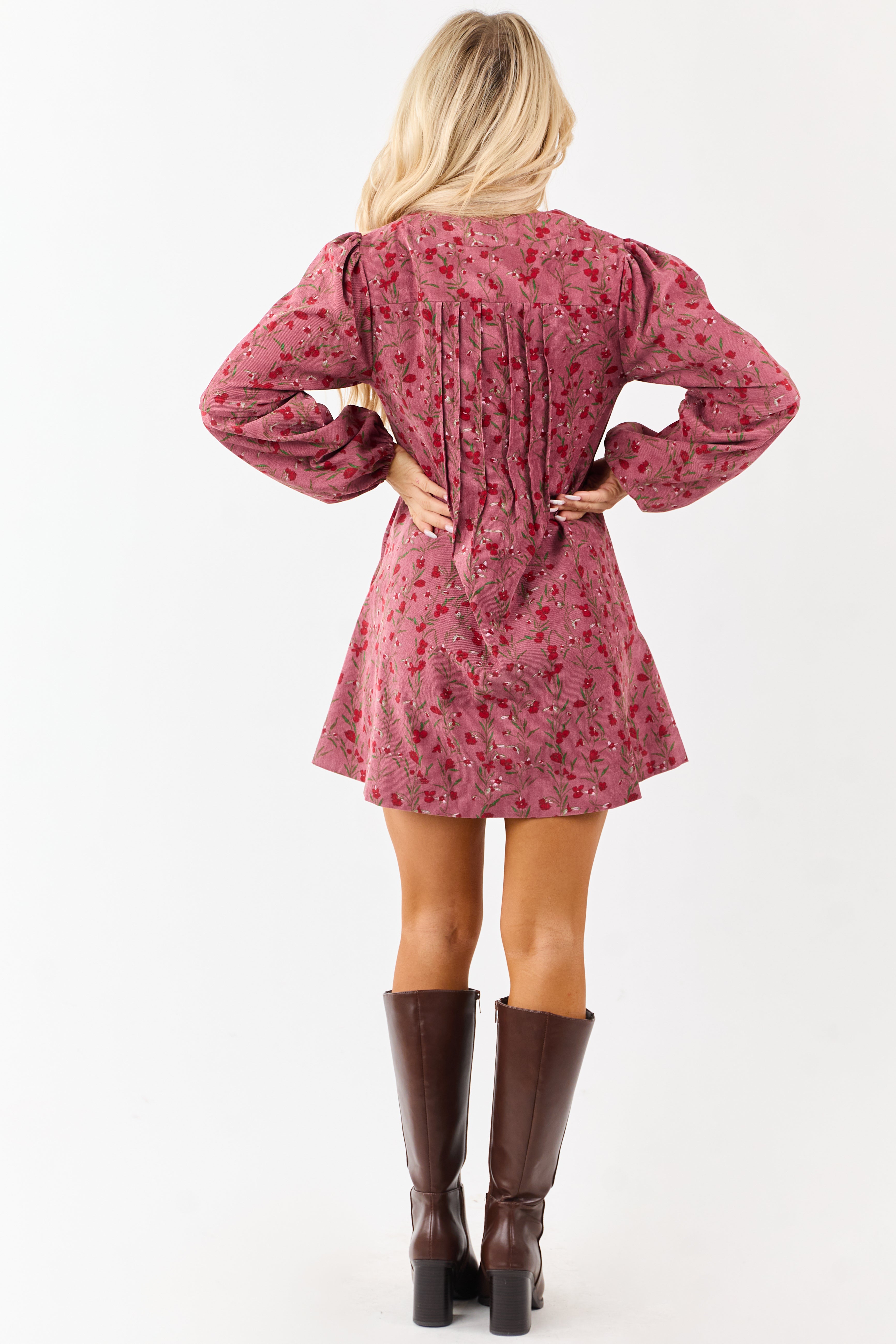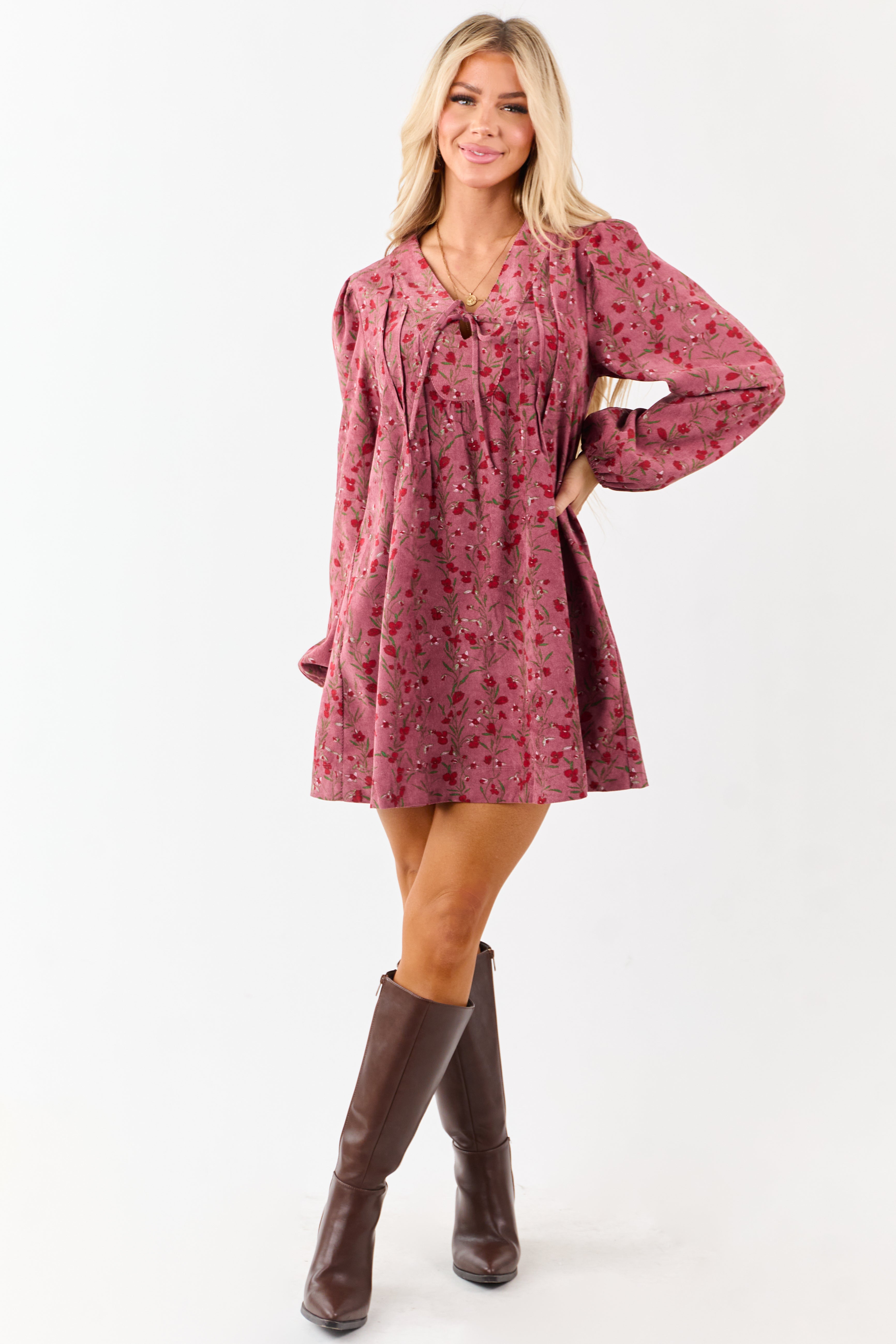 Elevate your style with this elegant Floral Pintuck Corduroy Mini Dress. This vintage-inspired dress features pintuck bodice detailing, puff sleeves, and a flattering tent silhouette. Made from non-stretchy corduroy with a deep V neckline and adjustable tie. Complete your look with an ensemble that effortlessly combines sophistication and charm. Available in Candy Apple Red, Kelly Green, and Carnation floral prints. Size Small: Bust 37″, Length 33.5″. 99% Polyester, 1% Spandex. Exude timeless femininity with every step in this gorgeous dress.