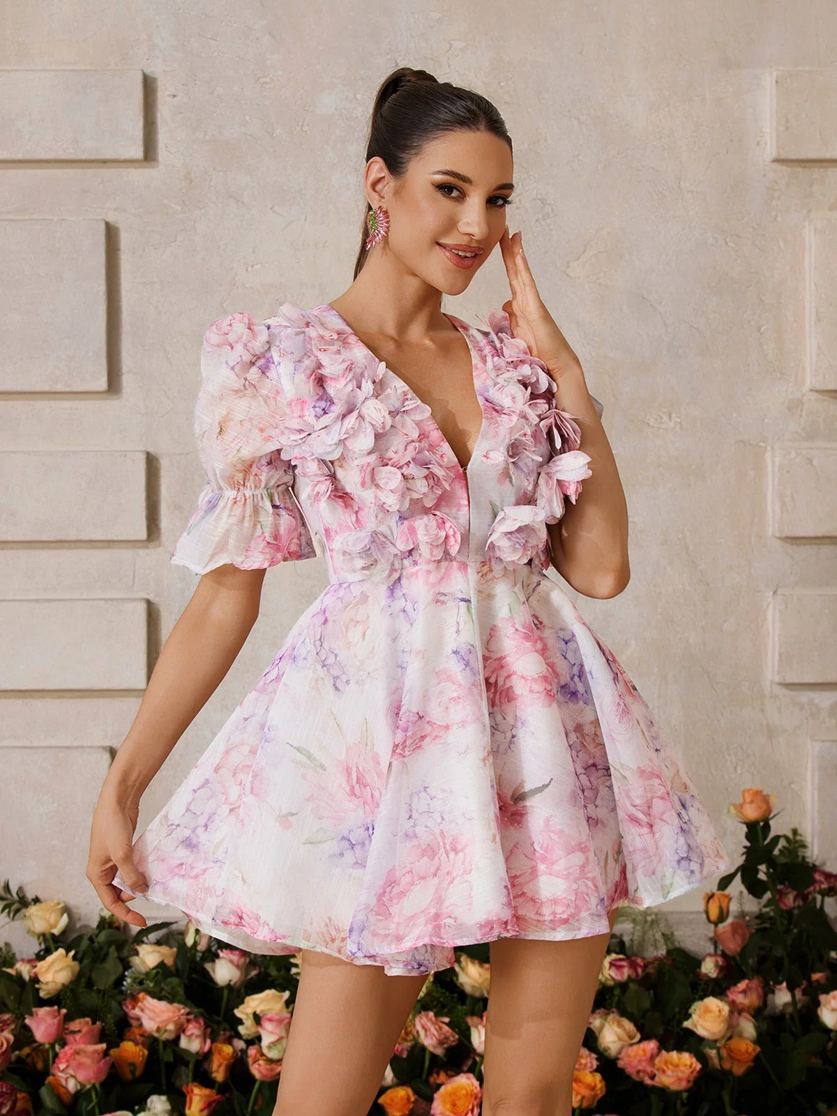 Elevate your style with our Floral Plunge Neck Mini Dress, designed to effortlessly turn heads at any event. This exquisite dress features a flattering plunge neckline and a vibrant floral pattern that perfectly balances elegance with playfulness. Crafted from 100% Polyester with a slight stretch factor for comfort and confidence, this dress is ideal for both warm days and special occasions. Stand out and celebrate your unique charm with this stunning piece. Available in three sizes: S, M, L.