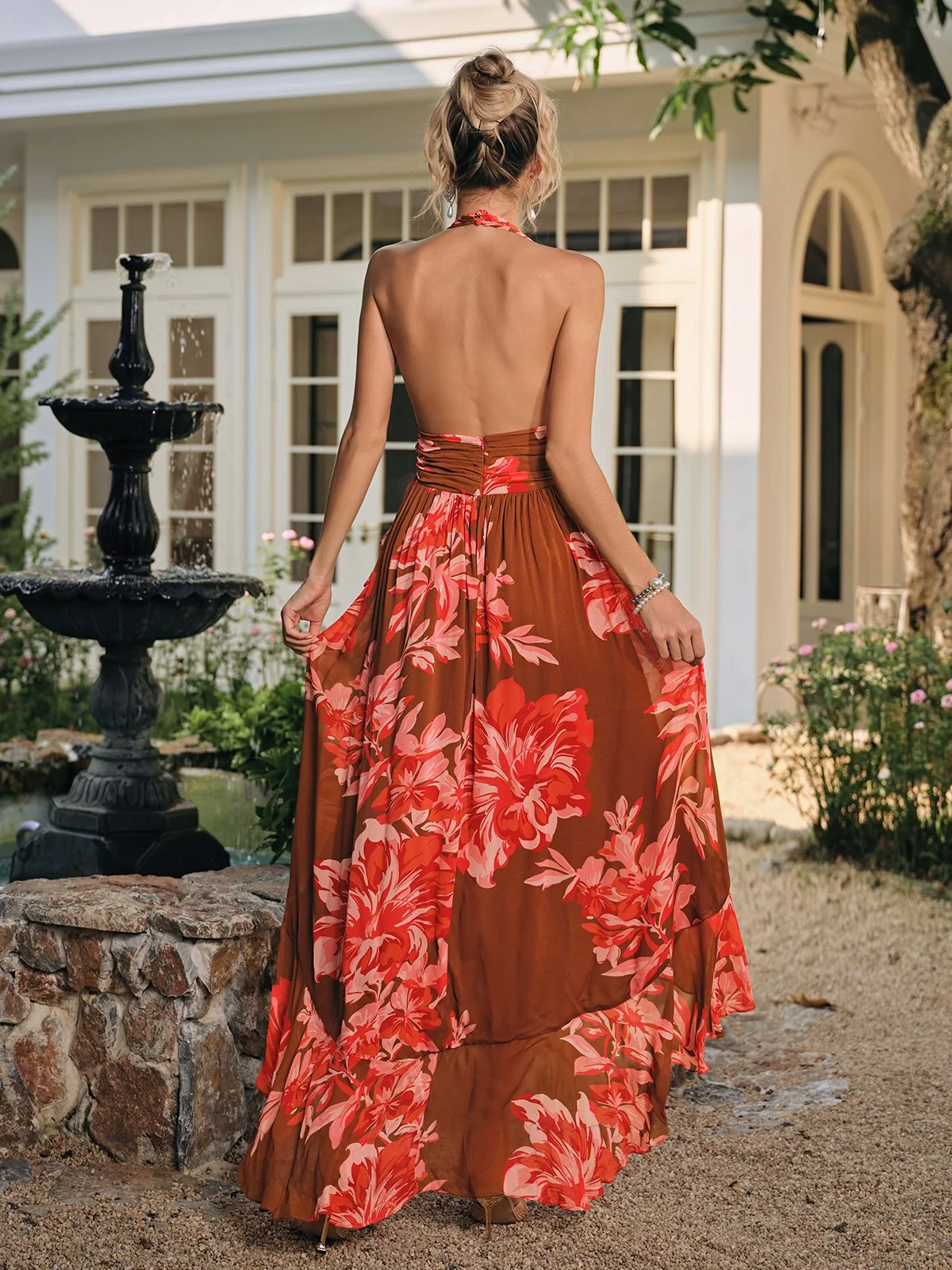 The Floral Print Backless Maxi Dress combines elegance and allure in a captivating silhouette, perfect for summer events or evening occasions. This dress features a backless design, vibrant floral print, comfortable flowing fabric, and invisible zipper closure. Ideal for making a stylish statement with a touch of boldness. Crafted from 100% Polyester material with slight stretch for a flattering fit. Dry clean only. Please note that color may vary due to lighting. Model is wearing size S.