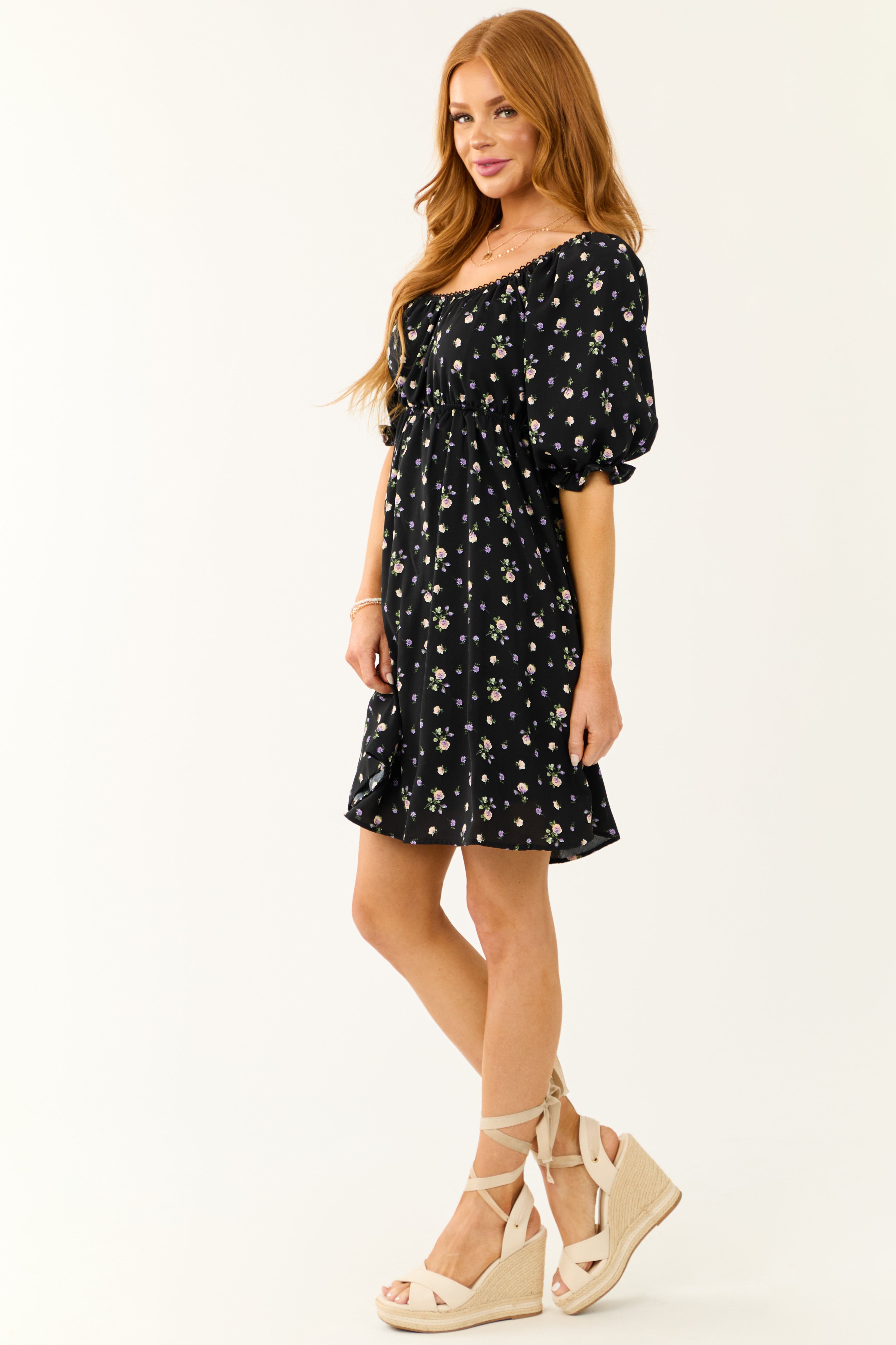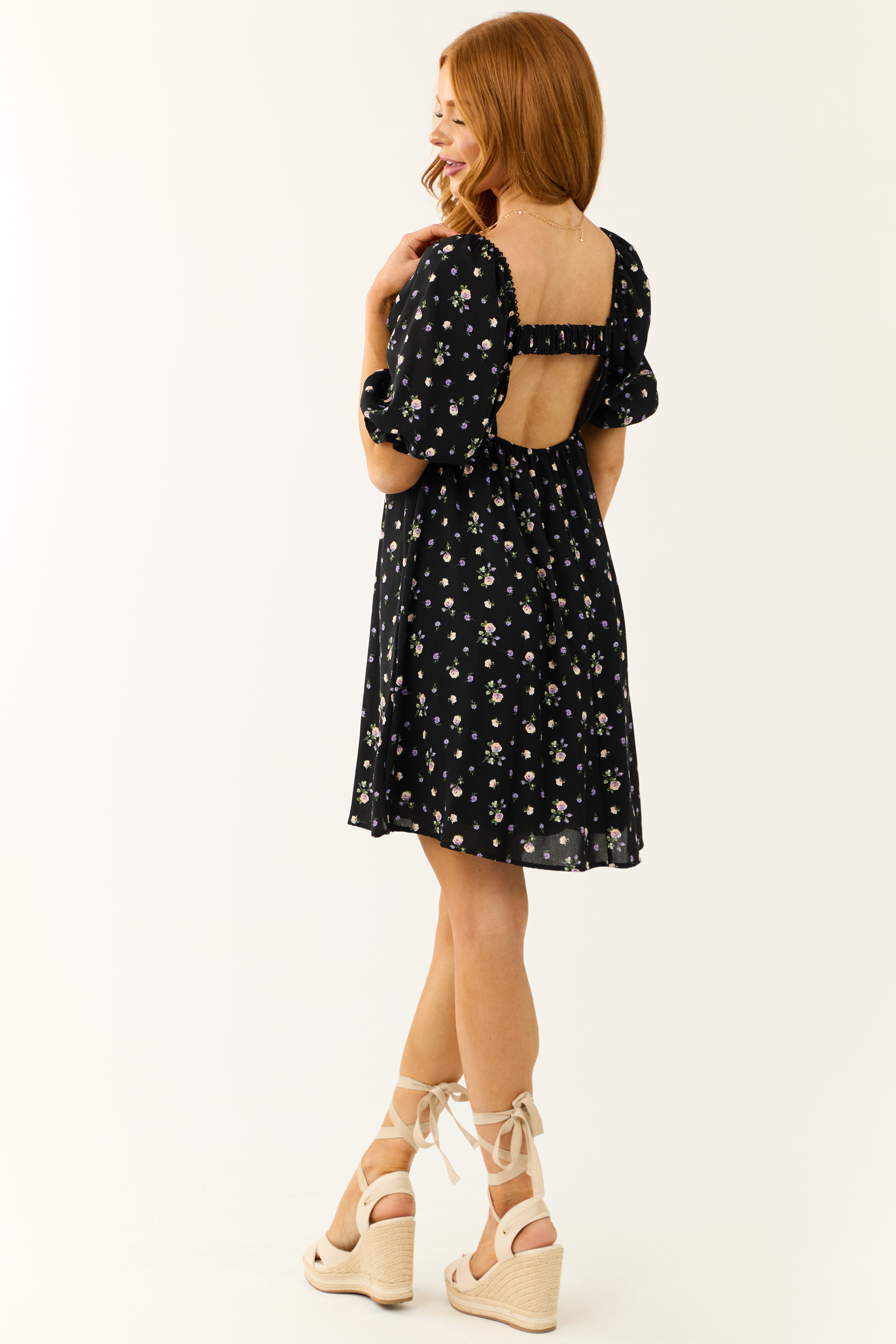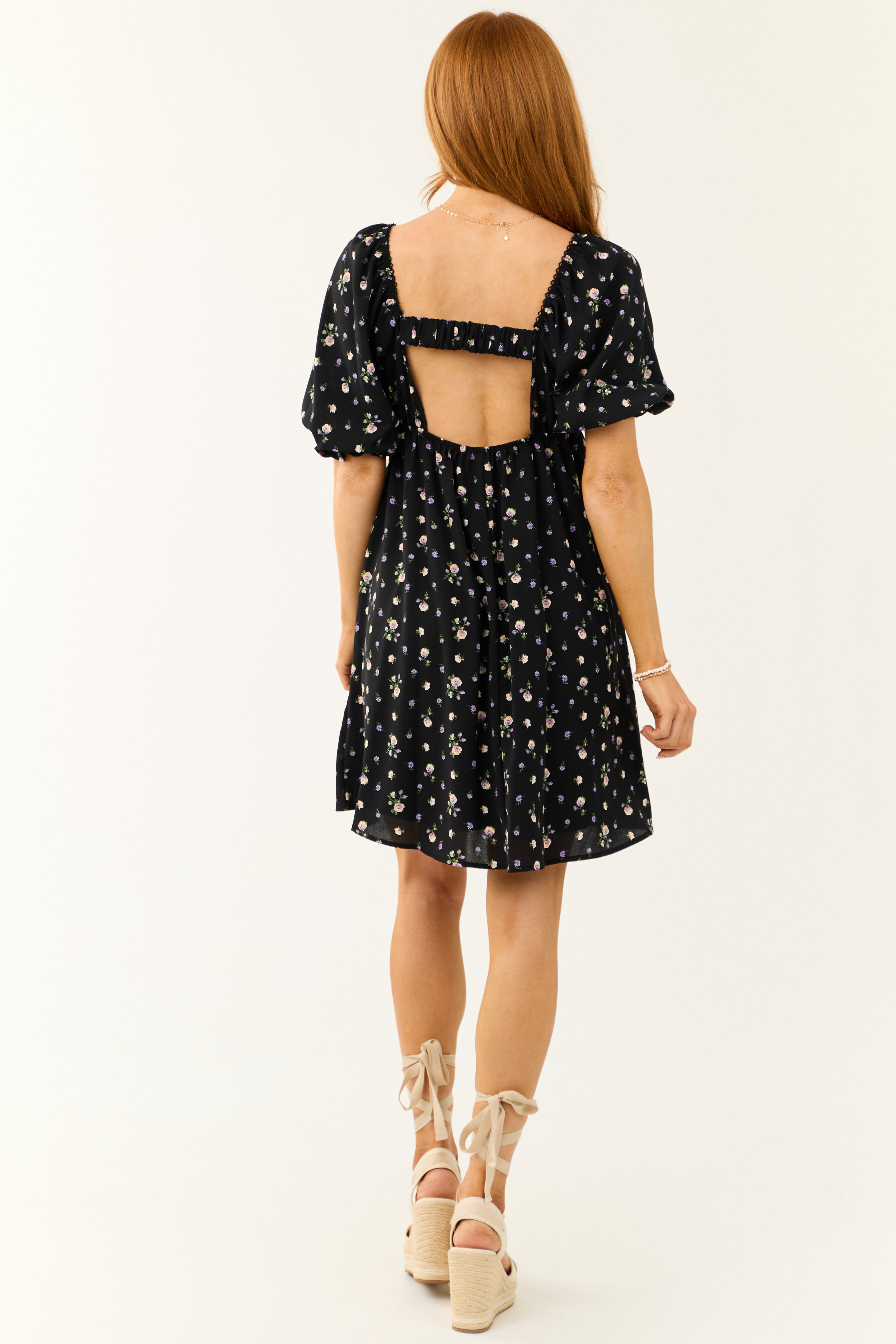 This stunning Floral Print Black Cut-Out Mini Dress is a must-have for your wardrobe. Made in the USA with 100% Polyester, it features short puff sleeves, an elastic neckline, and waistband for a comfortable fit. The back cut-out detail and ruffle cuffs add a touch of elegance. Perfect for casual or daytime wear, this dress is lined and versatile. Hand wash cold for best care.