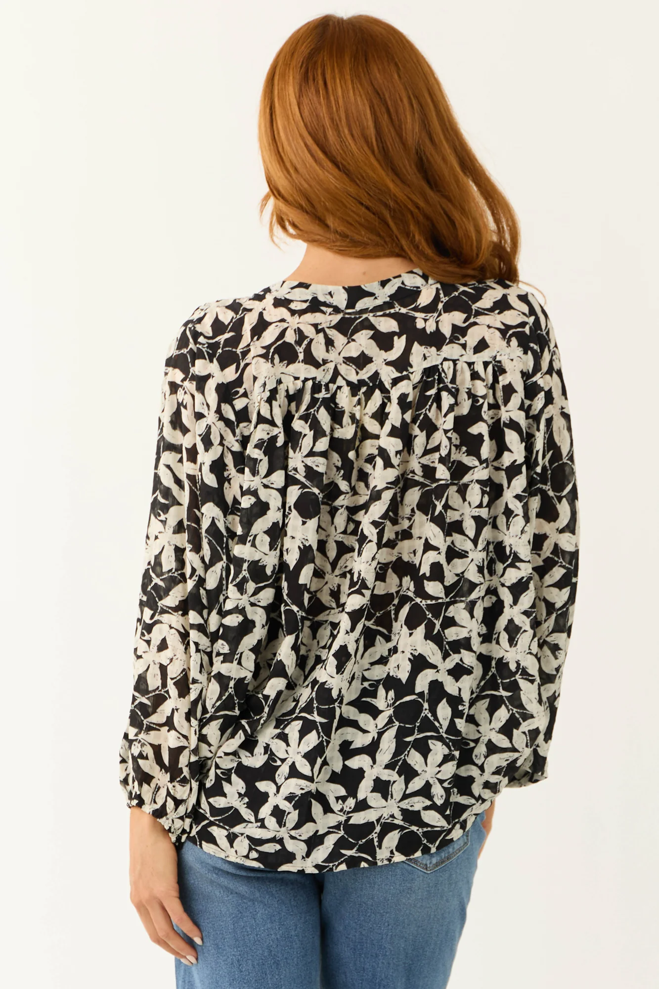 Look effortlessly stylish in this Floral Print Buttoned Top in Black . Made of non-stretchy woven fabric with elastic cuffs, side slits, and long sleeves. This lightweight and sheer top features an unlined design for a chic look. Crafted from 100% Polyester, it offers a comfortable fit and easy care. Hand wash cold for best results. Perfect for daytime or date night outfits. Available in sizes S, M, L, XL.