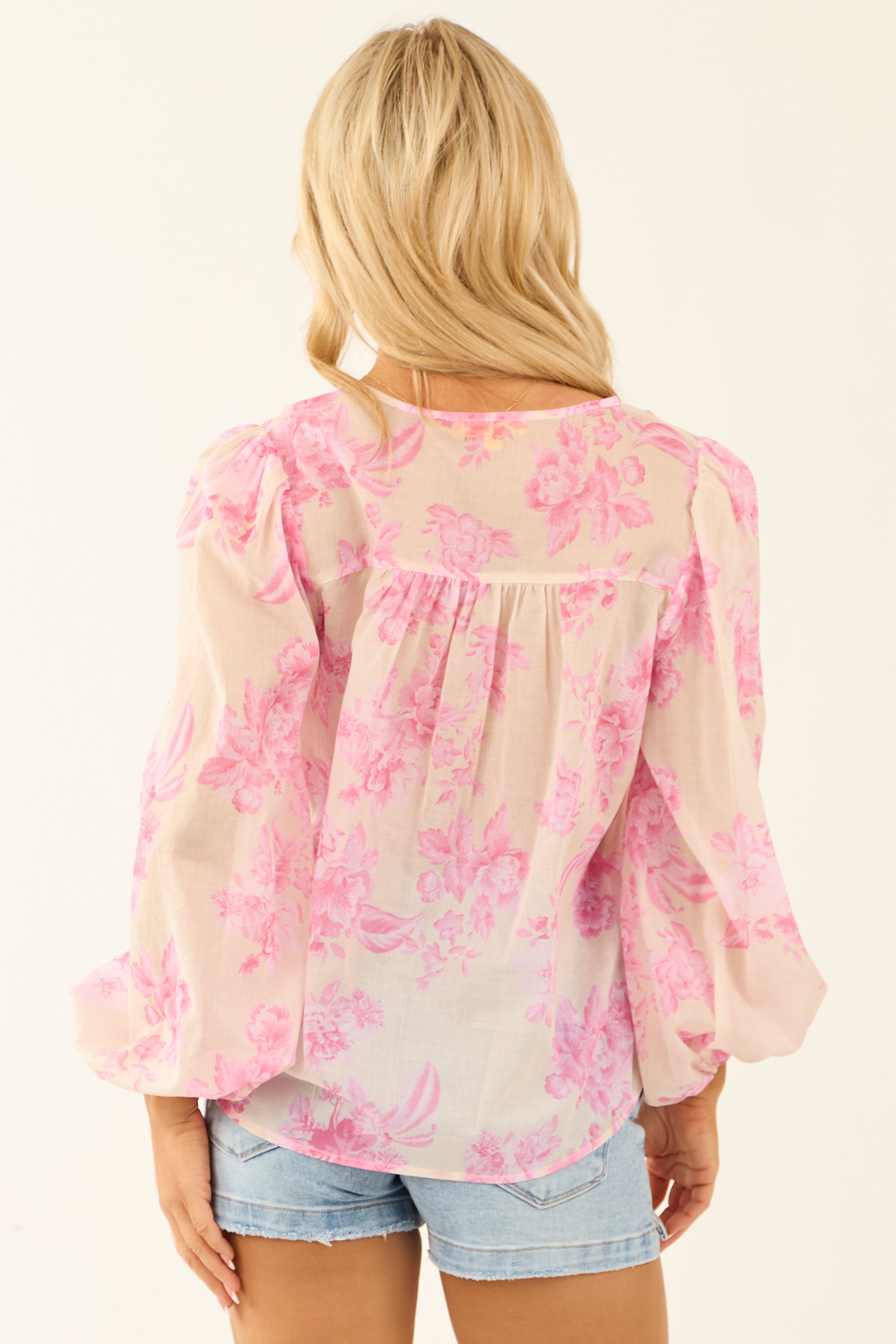 This Floral Print Cotton Top in Punch, Cream, Carnation, and Blush is a stylish addition to your wardrobe. Made from non-stretchy woven cotton, it features elastic cuffs, long puff sleeves, front tie with tassel ends, and lace detail. Perfect for spring and summer, hand wash with cold water for care. Embrace the unique variations due to the cutting and sewing process. Model is wearing a size Small. Size options: S, M, L.