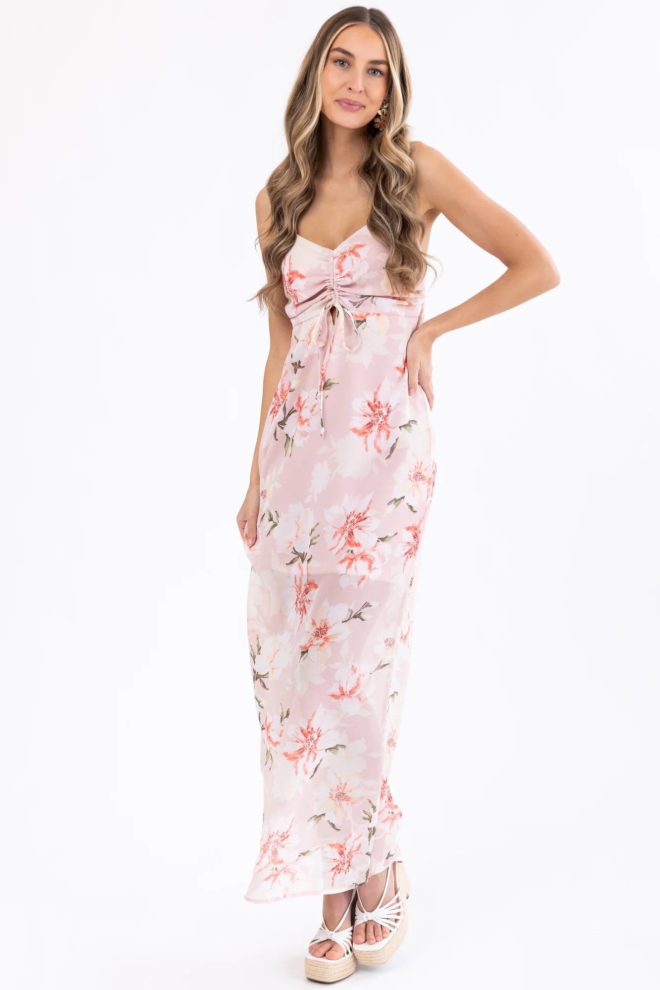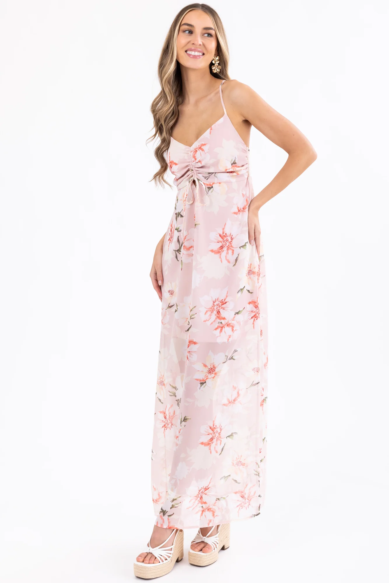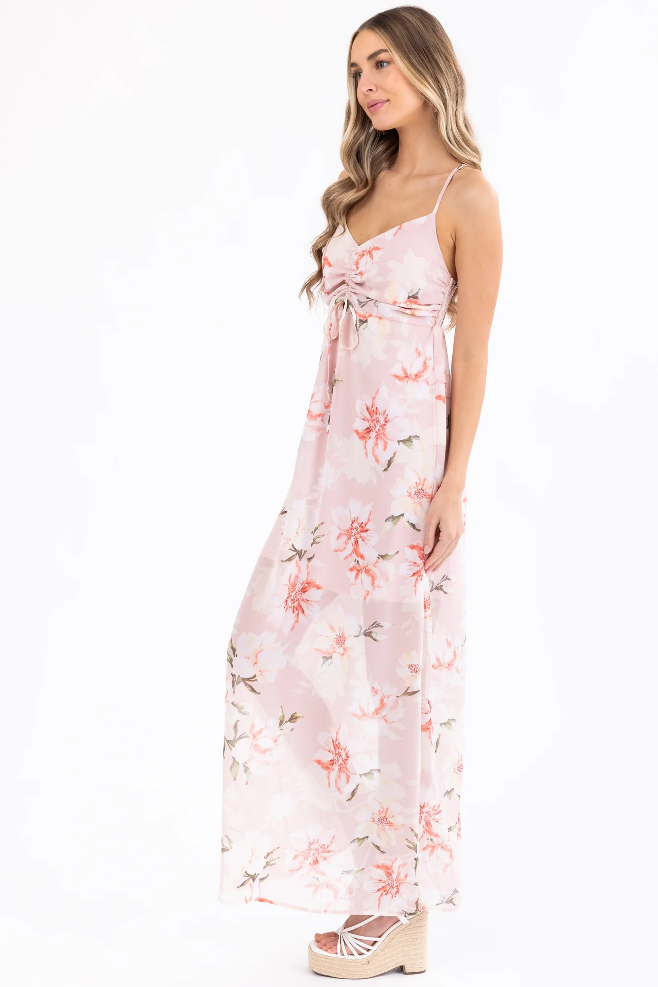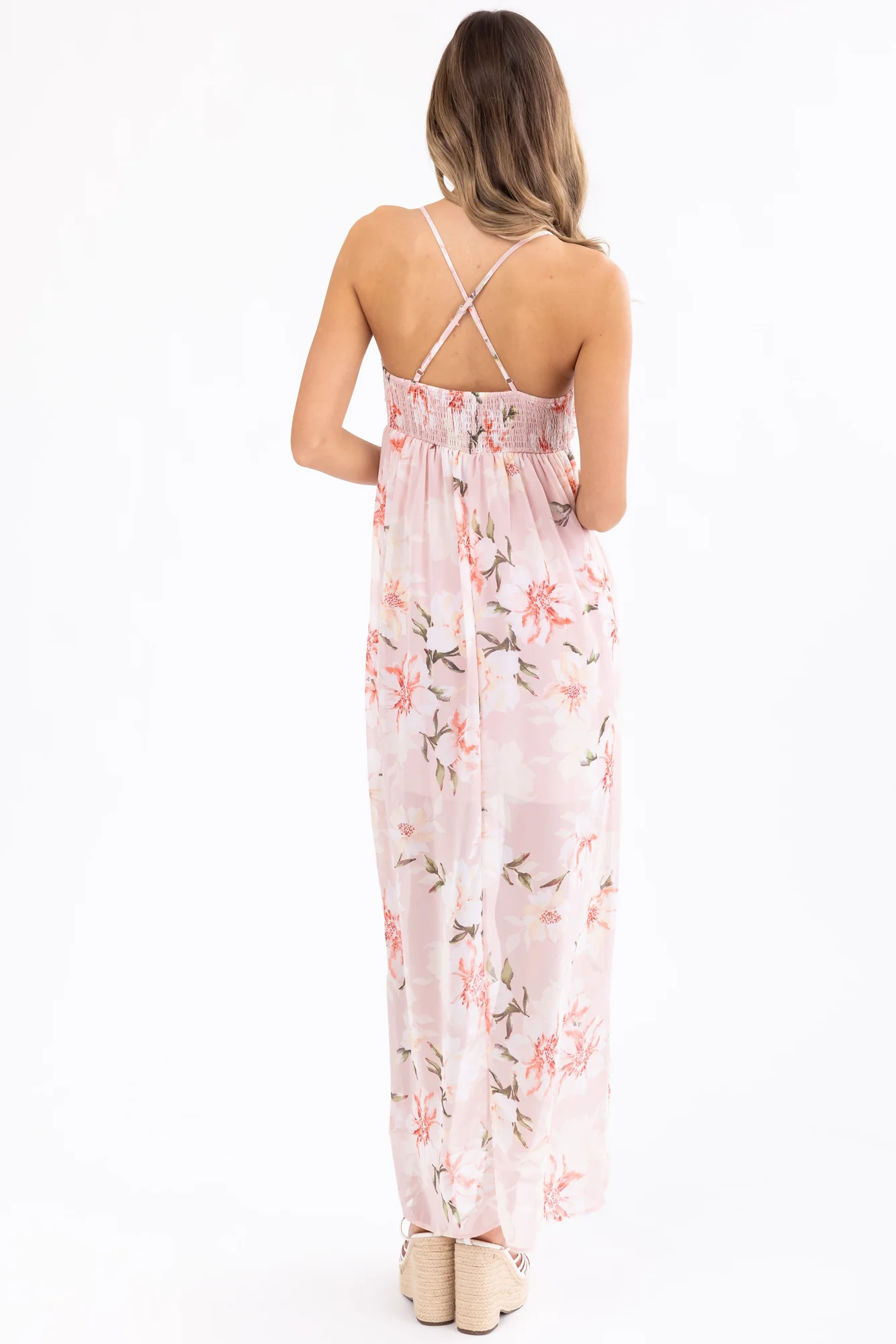 Indulge in the charm of our Floral Print Cross Back Maxi Dress in lovely Tea Rose, Cream, Ivory, and more. Embrace style and comfort with adjustable straps, V neckline, and ruched back design. This non-stretchy woven polyester dress features a drawstring bust for a perfect fit. Ideal for various occasions, from weddings to parties, this fully lined dress exudes elegance while staying easy to care for. Hand wash, do not bleach, iron at low heat, and dry flat. Make a statement with this enchanting piece!