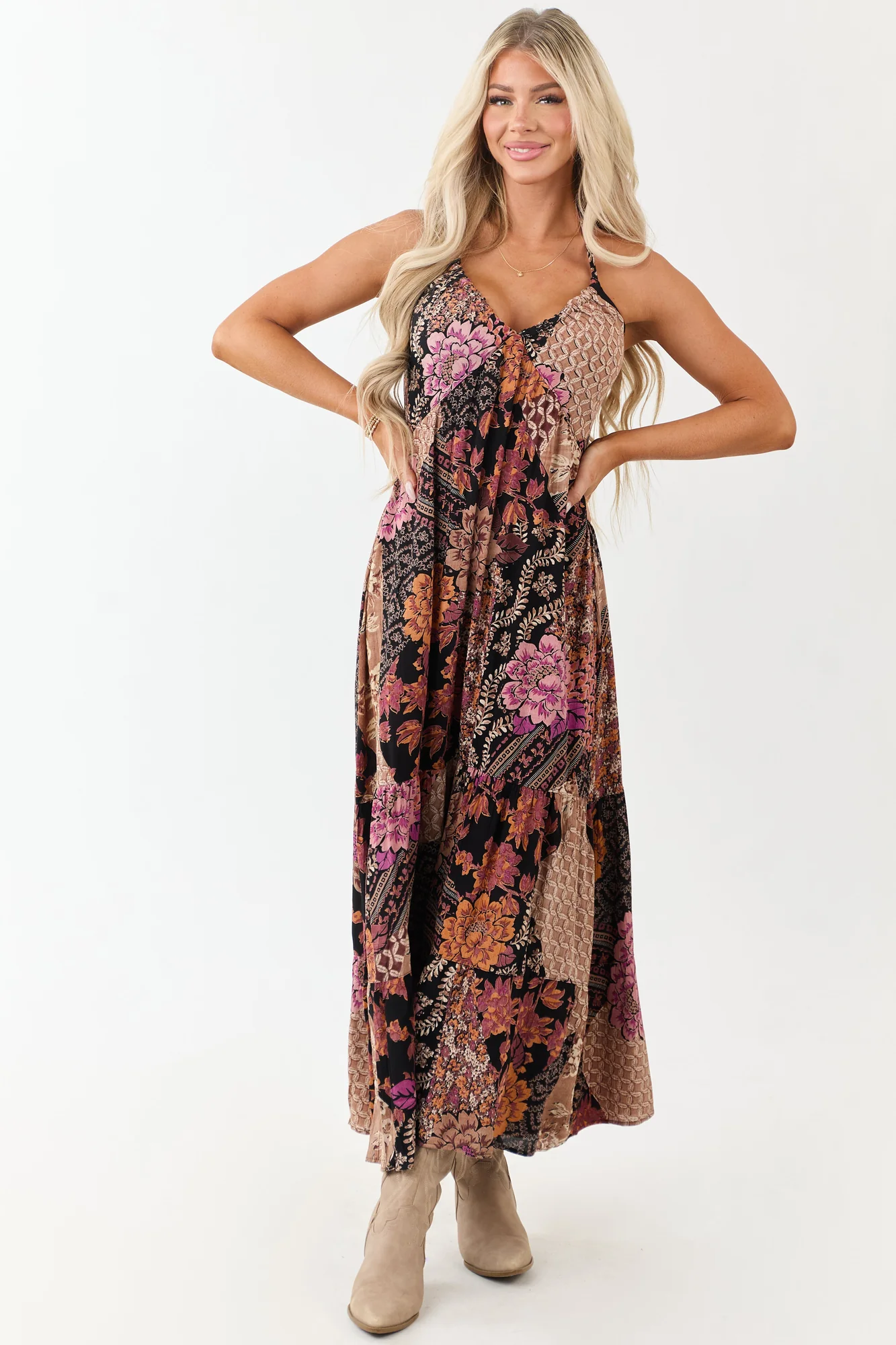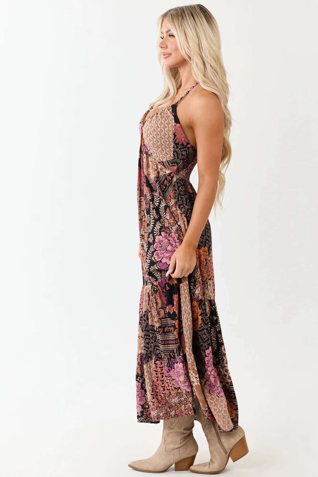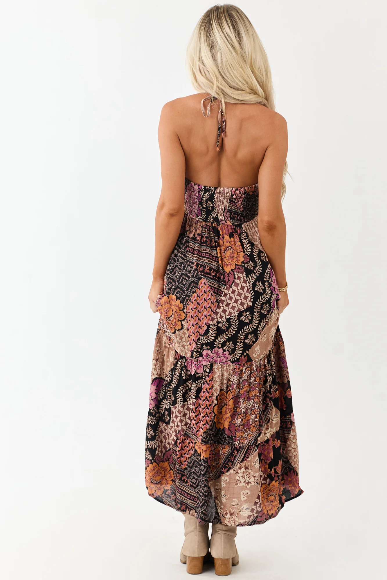 This eclectic and free-spirited maxi dress features a bold patchwork-inspired floral print with a halter neckline and tiered skirt. Made of 100% Rayon, it offers a stretchy smocked back, halter tie spaghetti straps, and an open back design. Lined for comfort and style, this dress is perfect for various occasions. Please refer to the size chart for precise measurements. Update your wardrobe with this unique and vibrant floral maxi dress in shades of Tangerine, Camel, Rust, Hibiscus, Ivory, Mauve, and Coffee. Note: Each piece may vary slightly due to the cutting and sewing process.