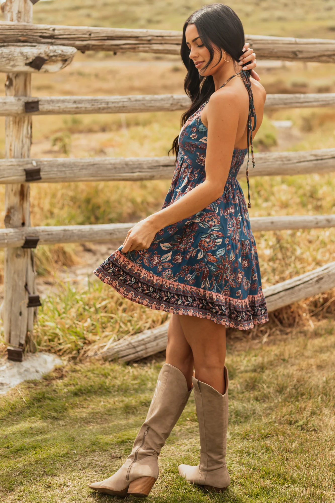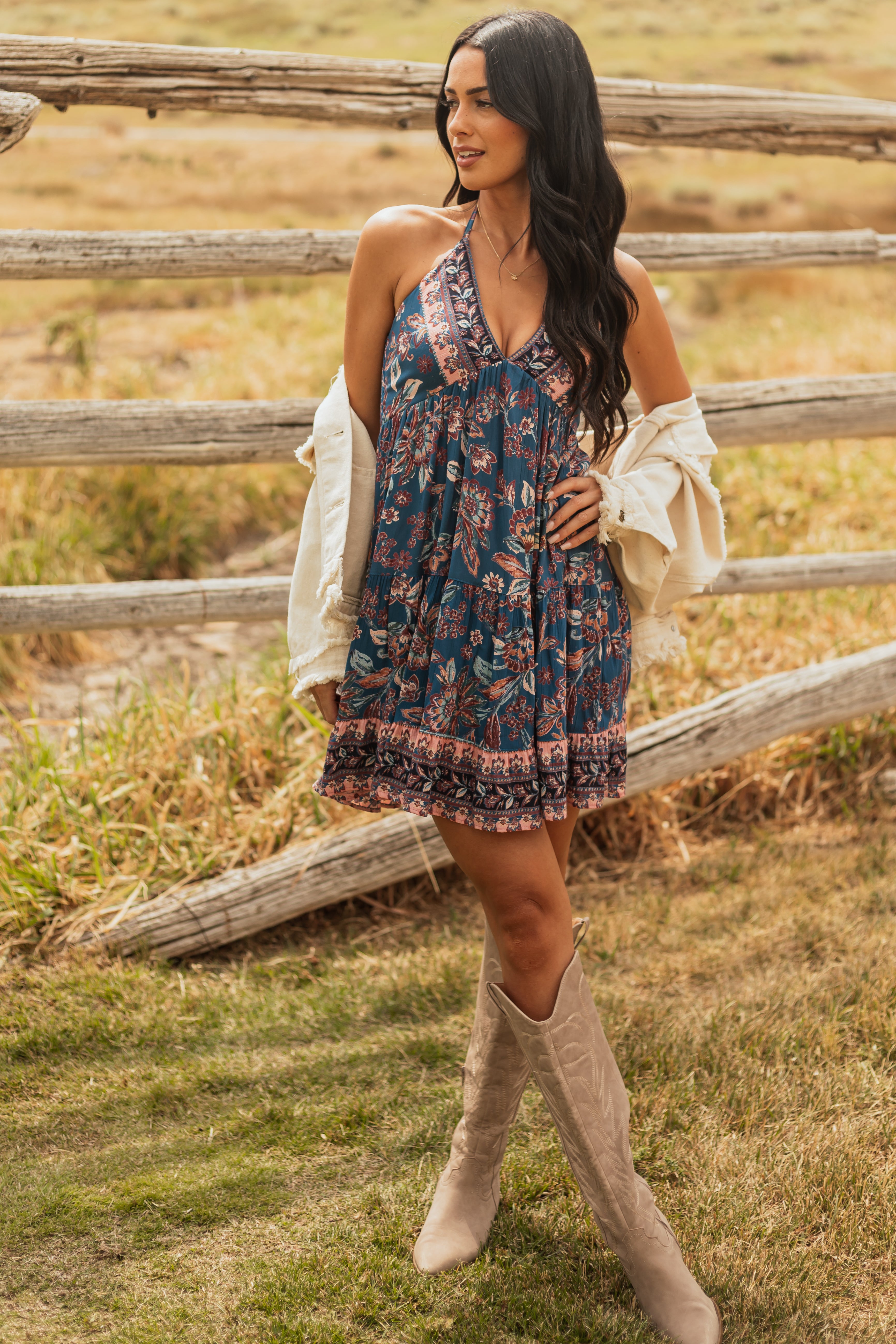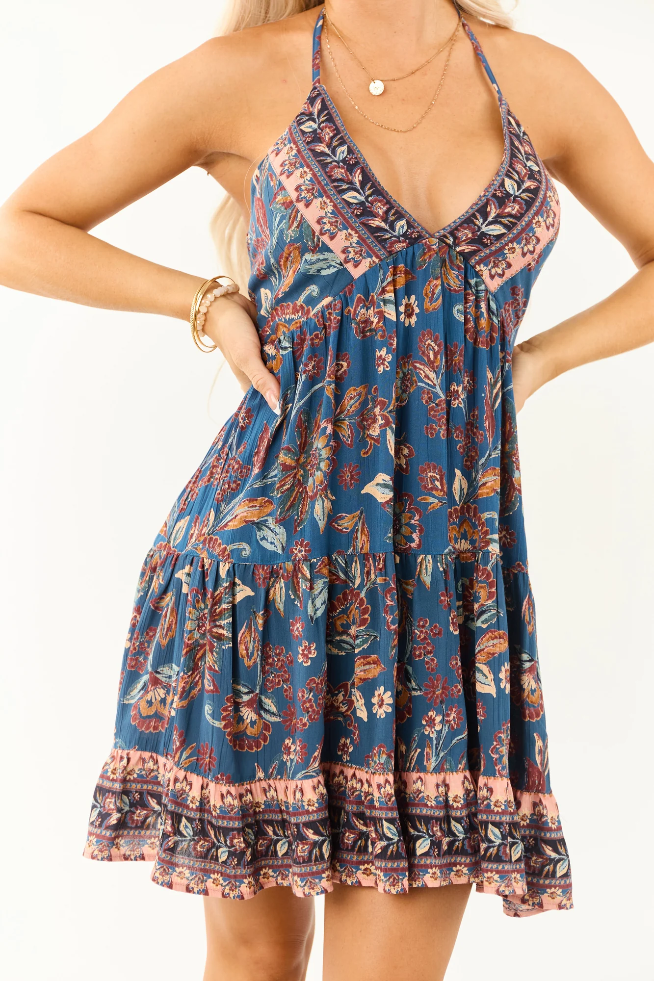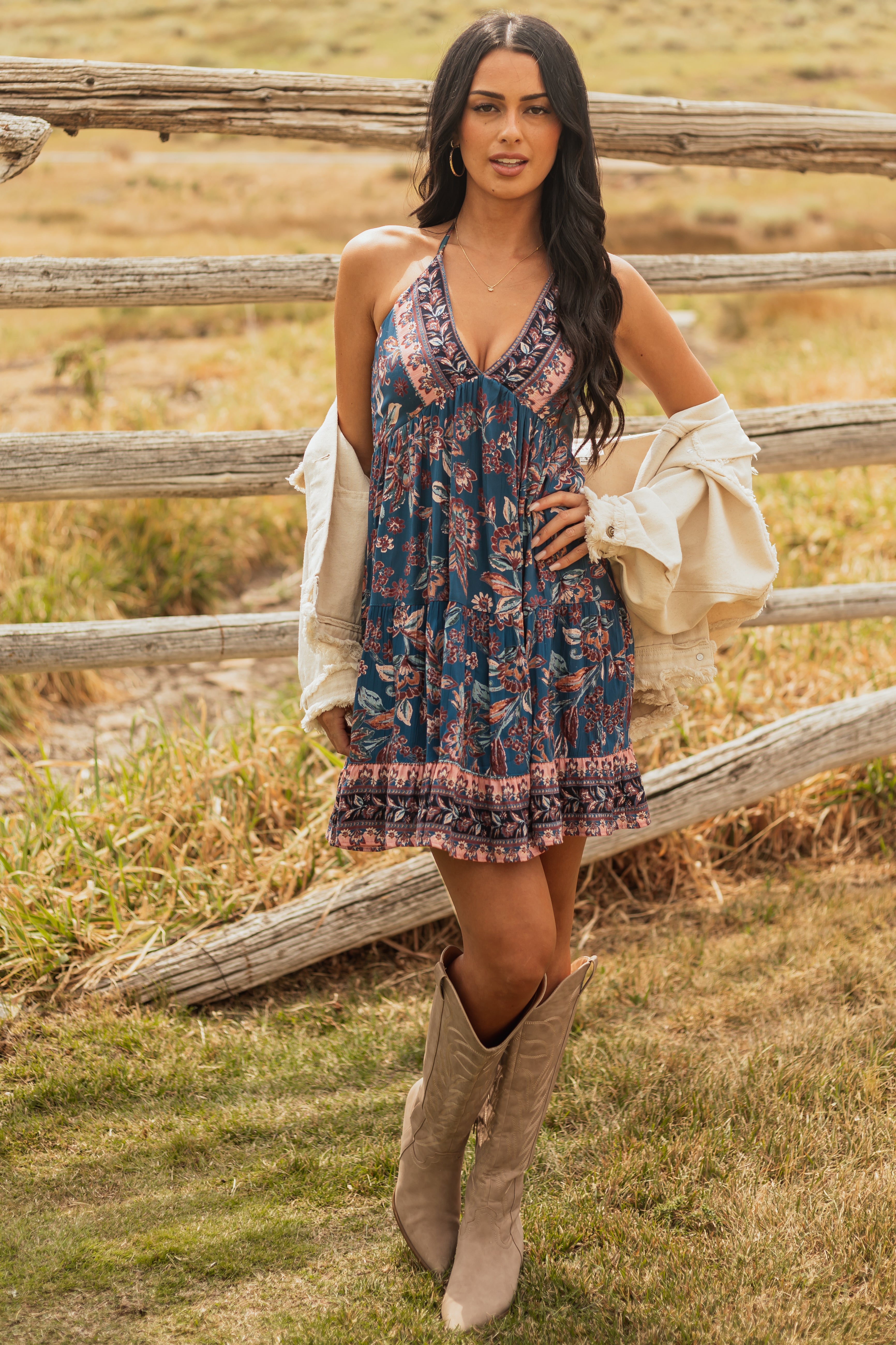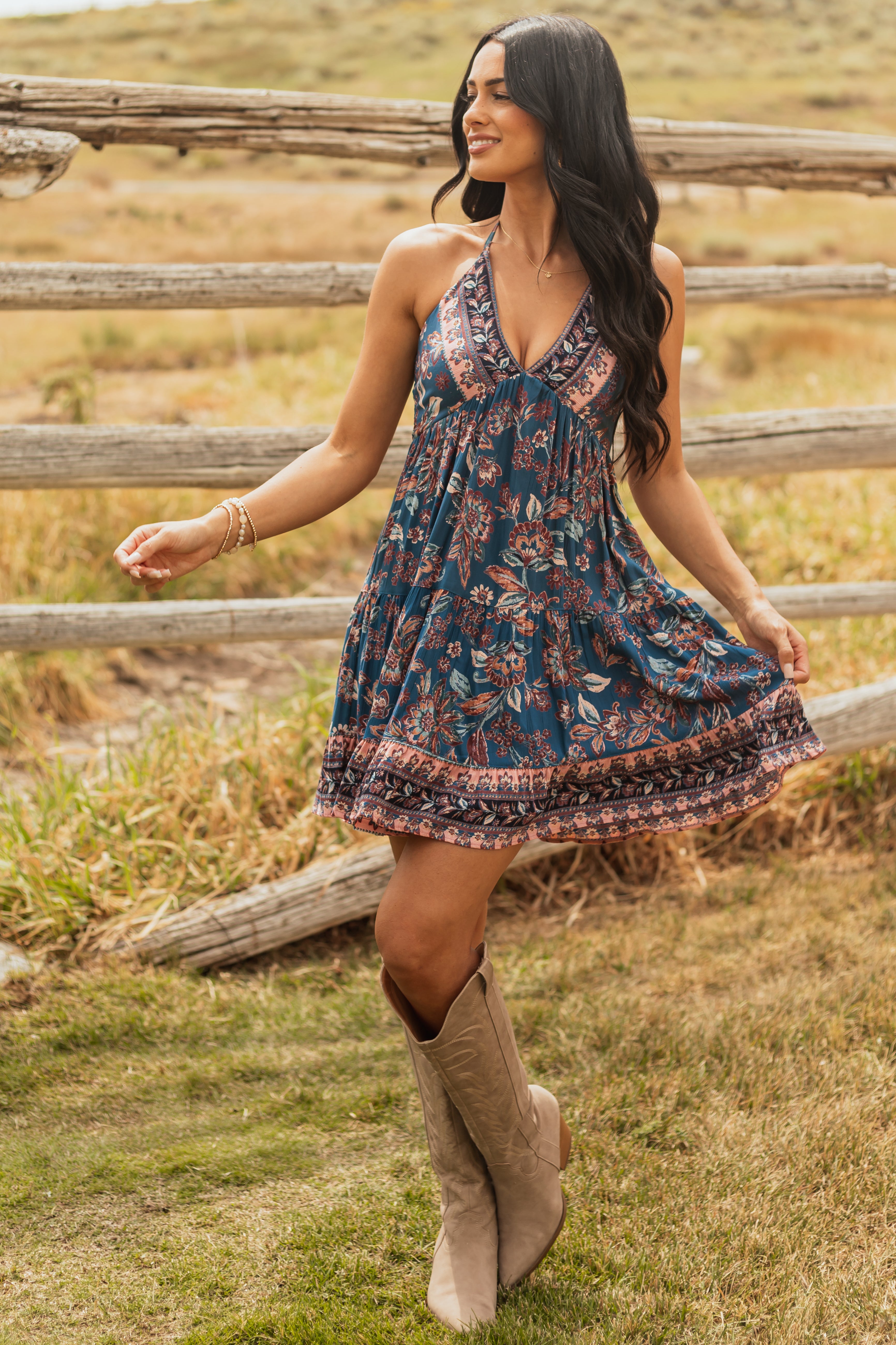 Embrace the boho chic trend with our stunning floral print halter neck mini dress. This mosaic printed dress features a smocked back, deep v neckline, and halter tie for a stylish and flattering look. Designed with stretchy fabric for comfort, it comes in shades of Coral, Mahogany, Melon, and Sunrise. Perfect for any summer occasion! Sizes: XS (0/2) – XL (16/18). For size small, Bust: 33″, Waist: 25″, Length: 35″. Stay trendy and comfortable in this 100% Rayon dress.
