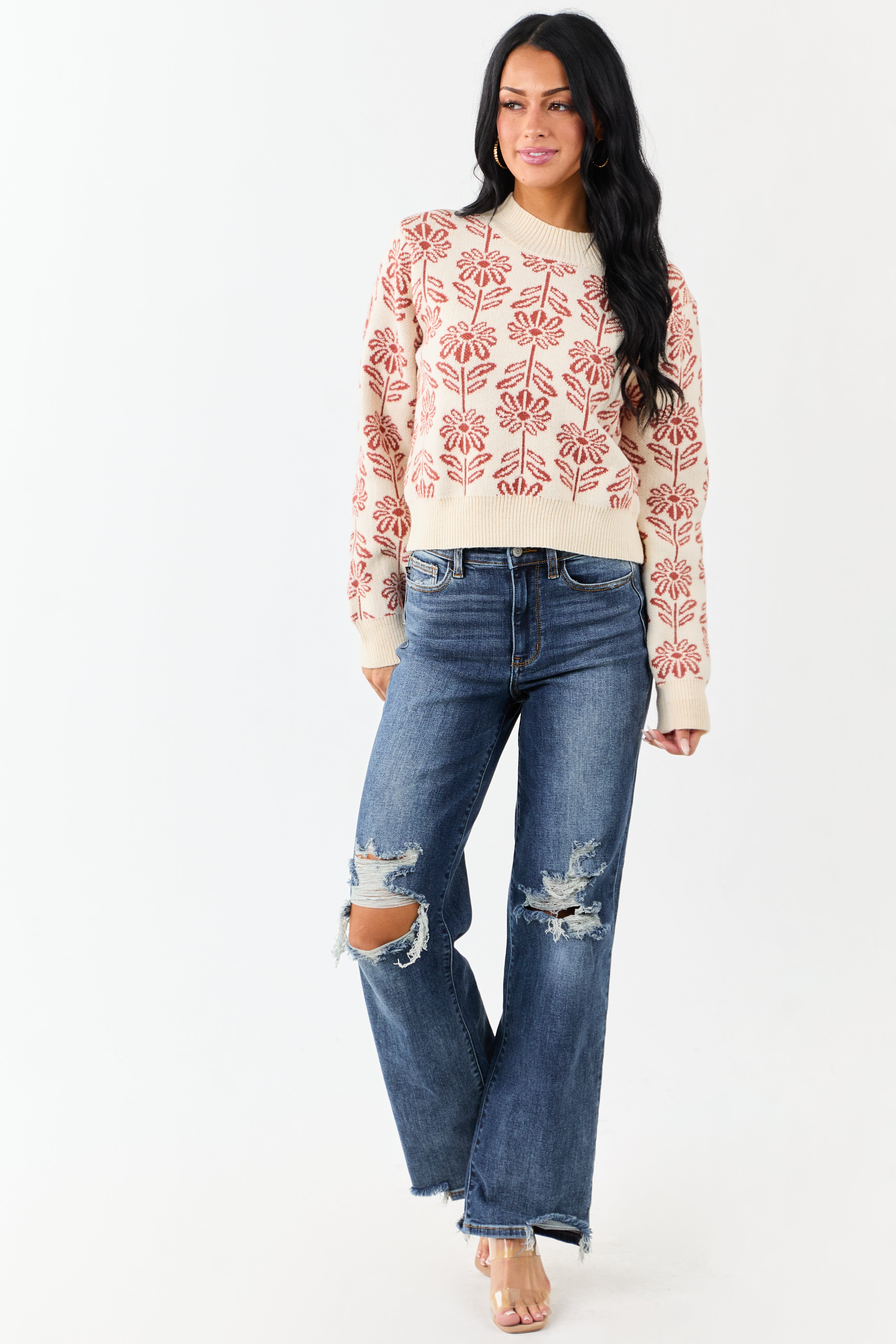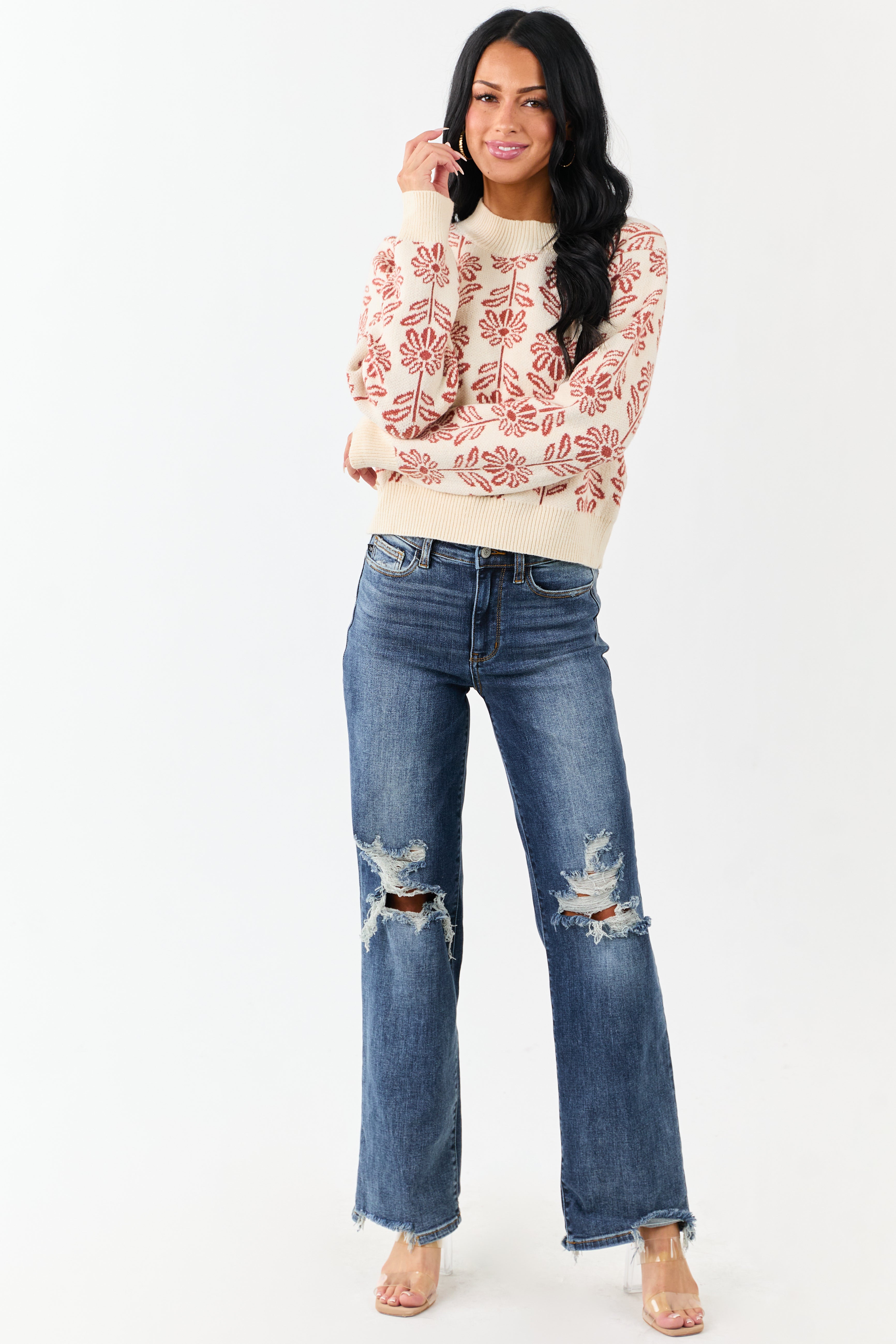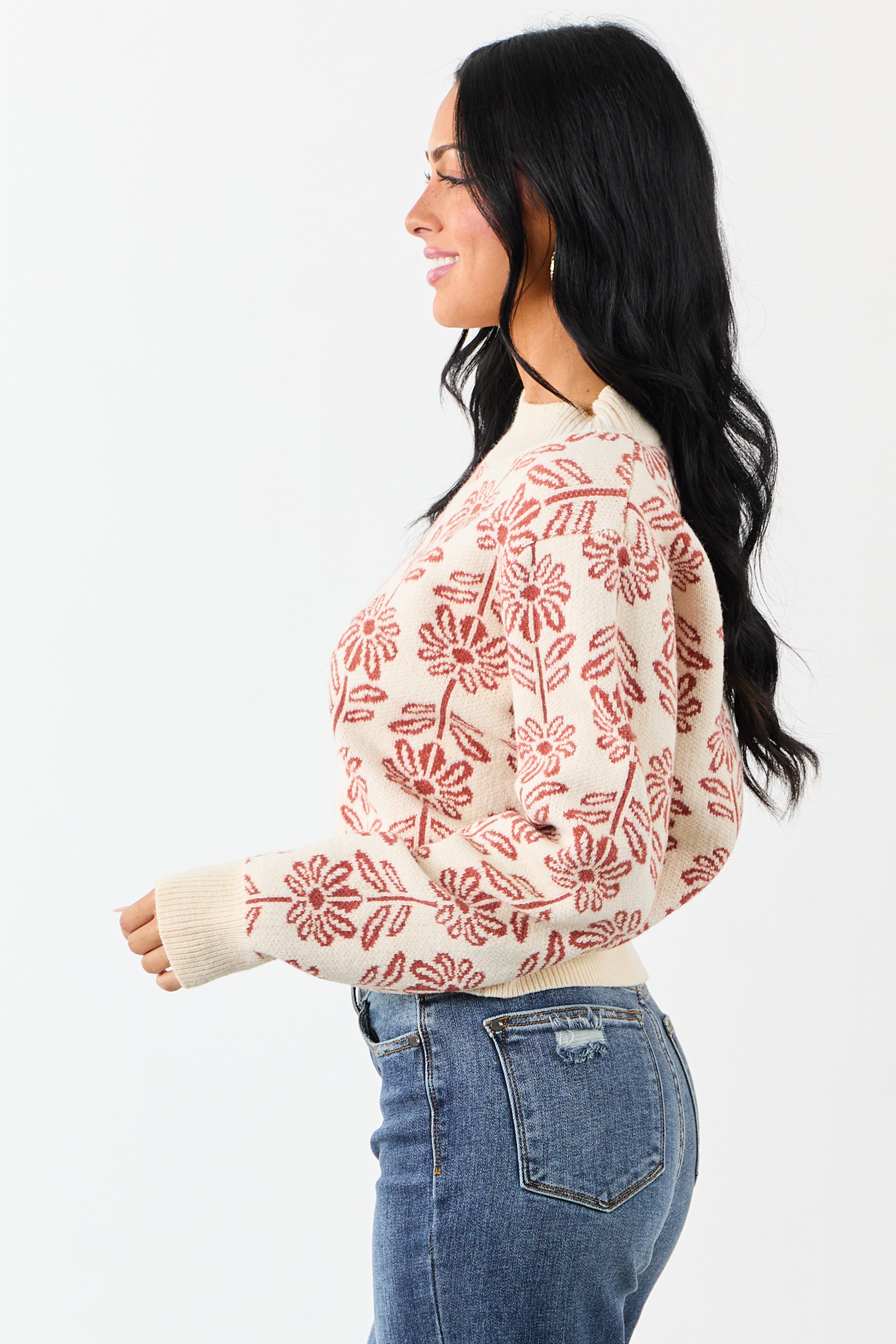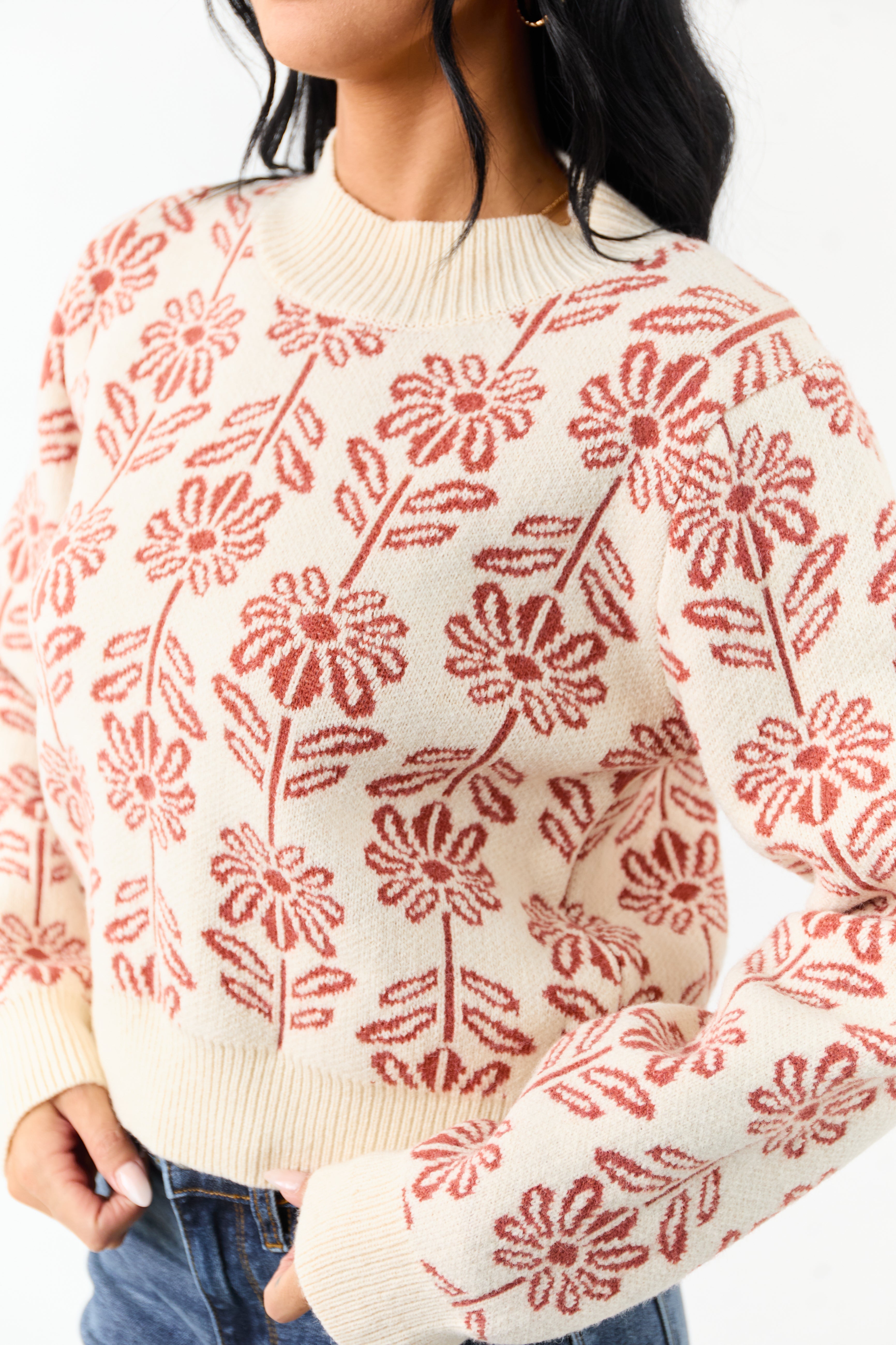 Embrace timeless charm with this floral print mock neck sweater. Made from stretchy soft knit fabric with banded ribbed trim for a comfortable fit. Perfect for all occasions, this sweater is a blend of 52% acrylic, 35% cotton, and 13% polyester. Available in sizes S, M, and L, with bust measurements of 40″, 42″, and 44″, lengths of 22″, 22.5″, and 23″, and sleeve lengths of 24″, 24.5″, and 25″. Imported. Model is wearing a size Small.