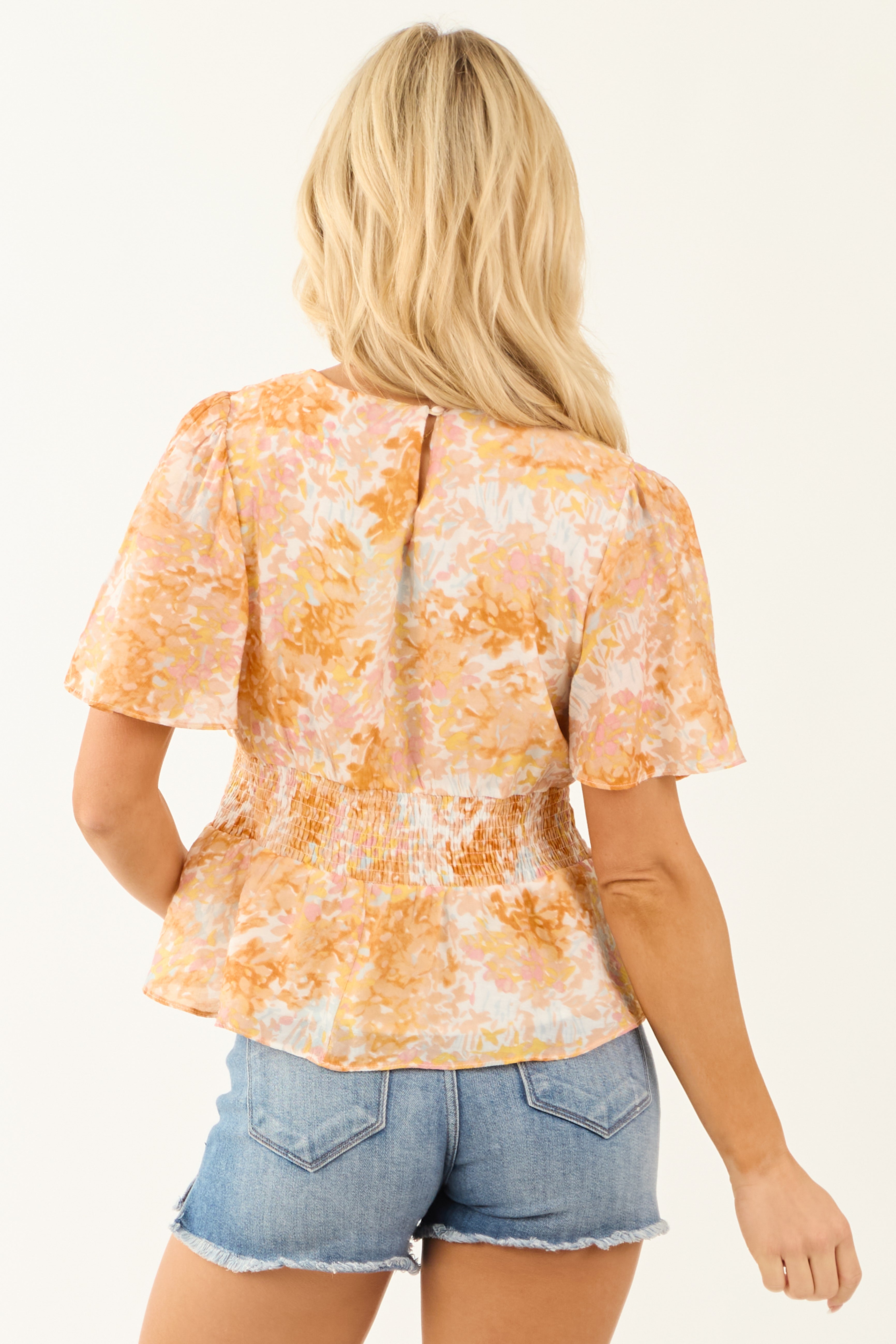 Indulge in the vibrant charm of our Tangerine Floral Print Peplum Top. Crafted from a non-stretchy woven fabric with shades of Mango, Amber, Ivory, Punch, and Baby Blue, this top features short flutter sleeves, a V neckline, and an elastic smocked waist for a flattering fit. The back keyhole with button closure adds a sophisticated touch. With partial lining for comfort, this top is perfect for both casual and dressy occasions. Care instructions: Hand wash cold, hang dry.
