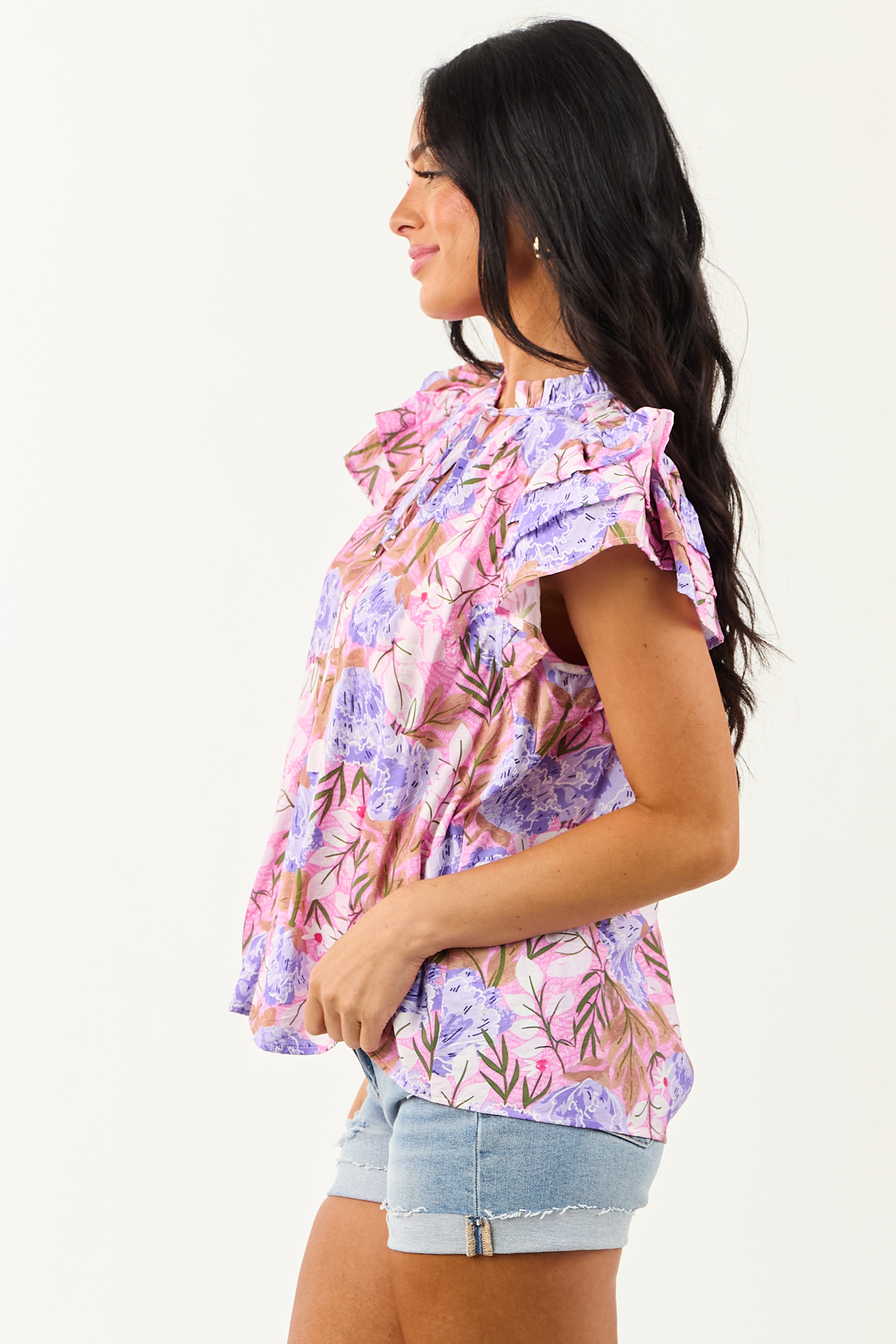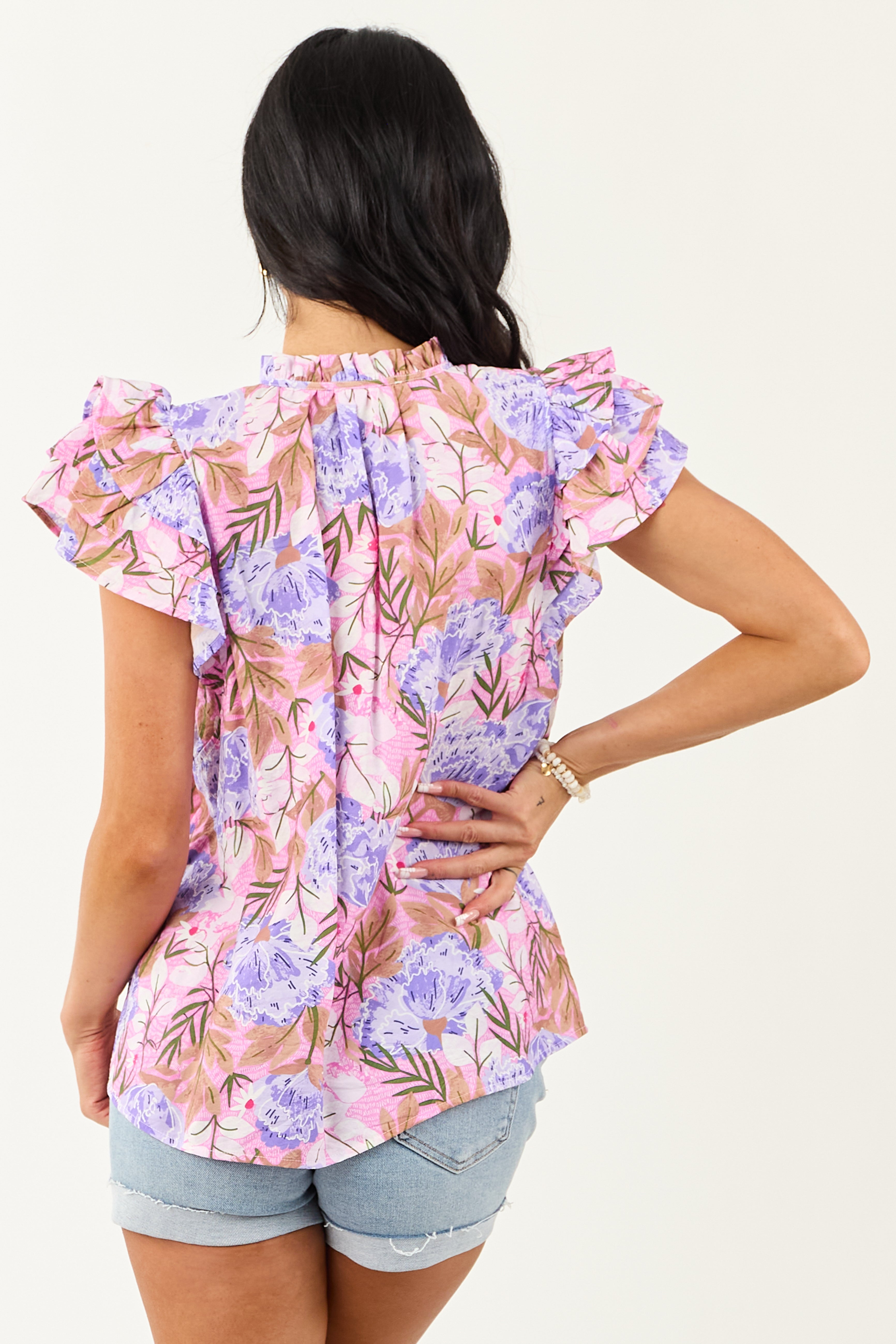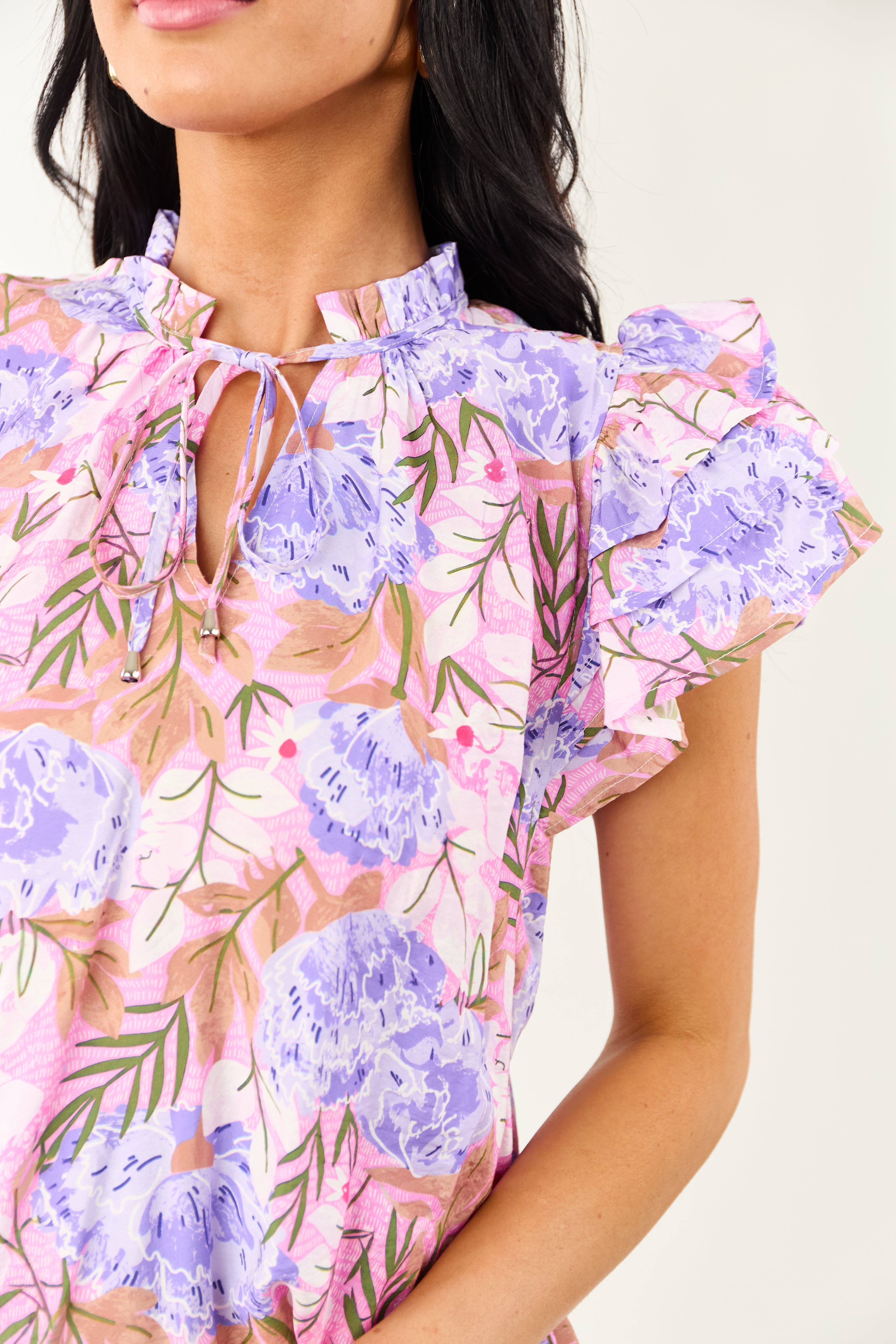 Embrace spring and summer in style with this charming Floral Print Ruffle Sleeve V-Neck Top in shades of Peanut, Camel, Lilac, Lavender, Off White, and Pine. This non-stretchy woven top features a high frill notch neckline with tie closure, tiered ruffle sleeves, and comes in sizes S, M, L. Handcrafted from 80% Rayon and 20% Nylon, this top exudes elegance. Please note that due to the nature of the fabric and unique manufacturing process, slight variations may occur. Step out confidently in a piece that celebrates individuality and comfort. Model is wearing size Small. Models measurements: Size 1, Height 59″, Bust 34″, Waist 26″.