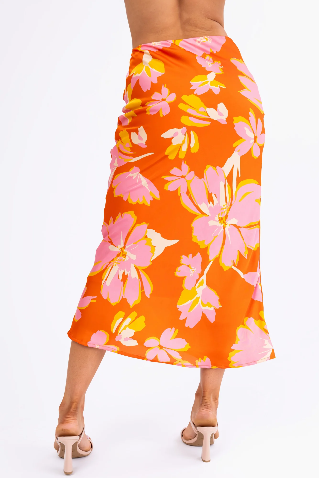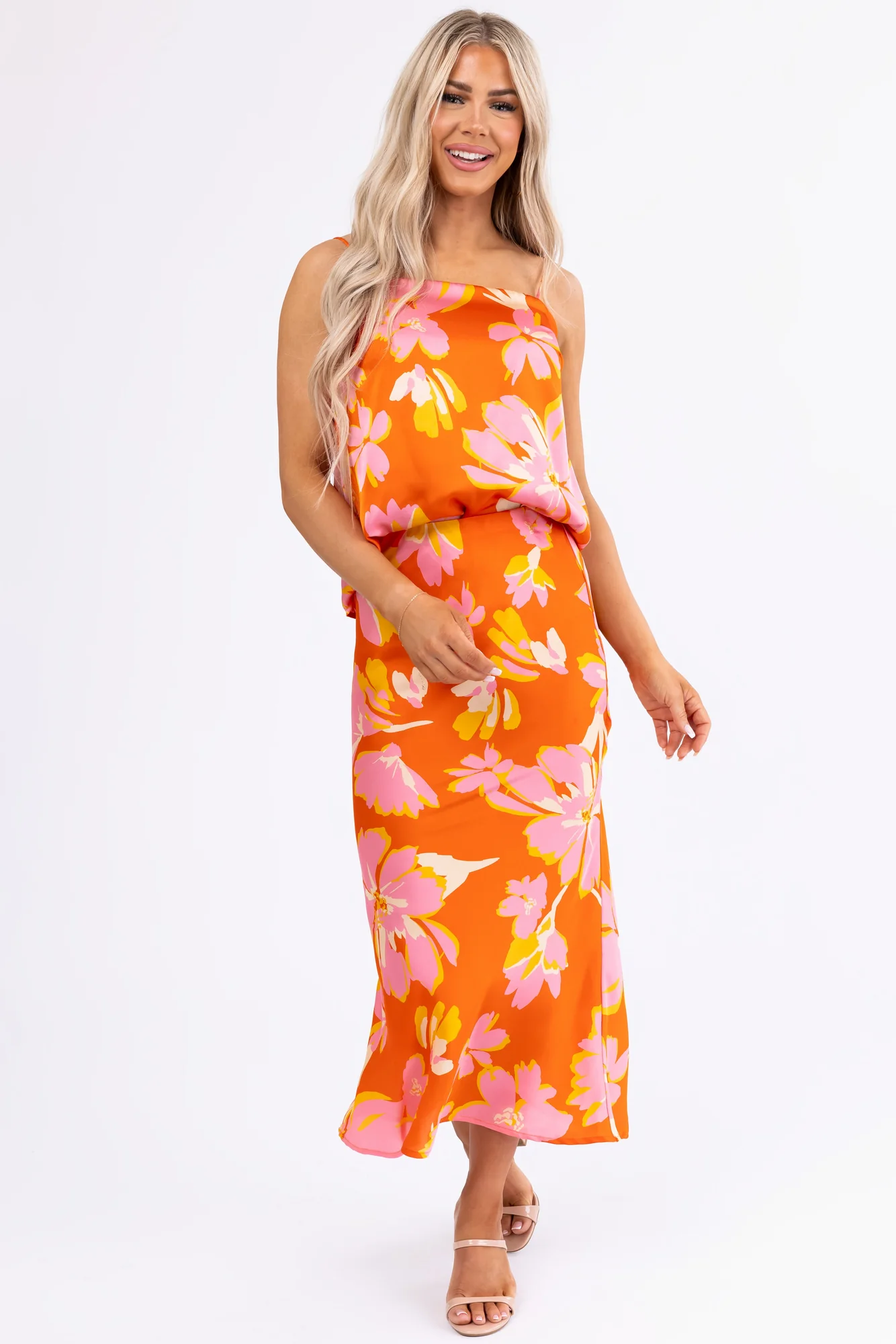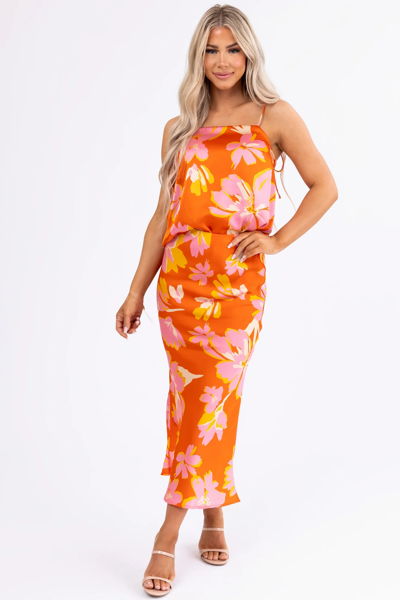 Elevate your style with our stunning Floral Print Satin Maxi Skirt in Baby Pink, Amber, and Cream. Crafted from non-stretchy satin with an elastic waist and bias flounce hem for a graceful touch. Pair with our matching Tie Strap Satin Tank Top. Available in sizes S, M, and L. Hand wash cold for care. Embrace unique variations due to the cutting and sewing process.