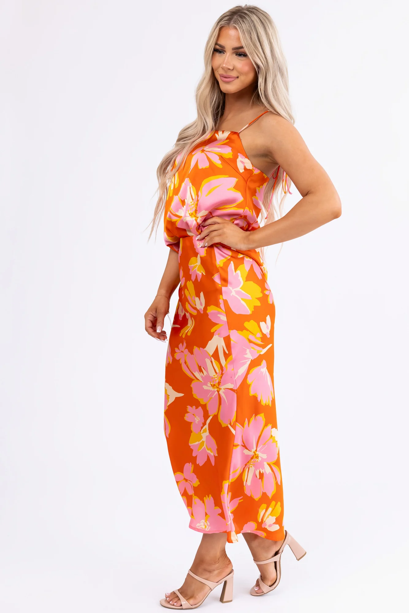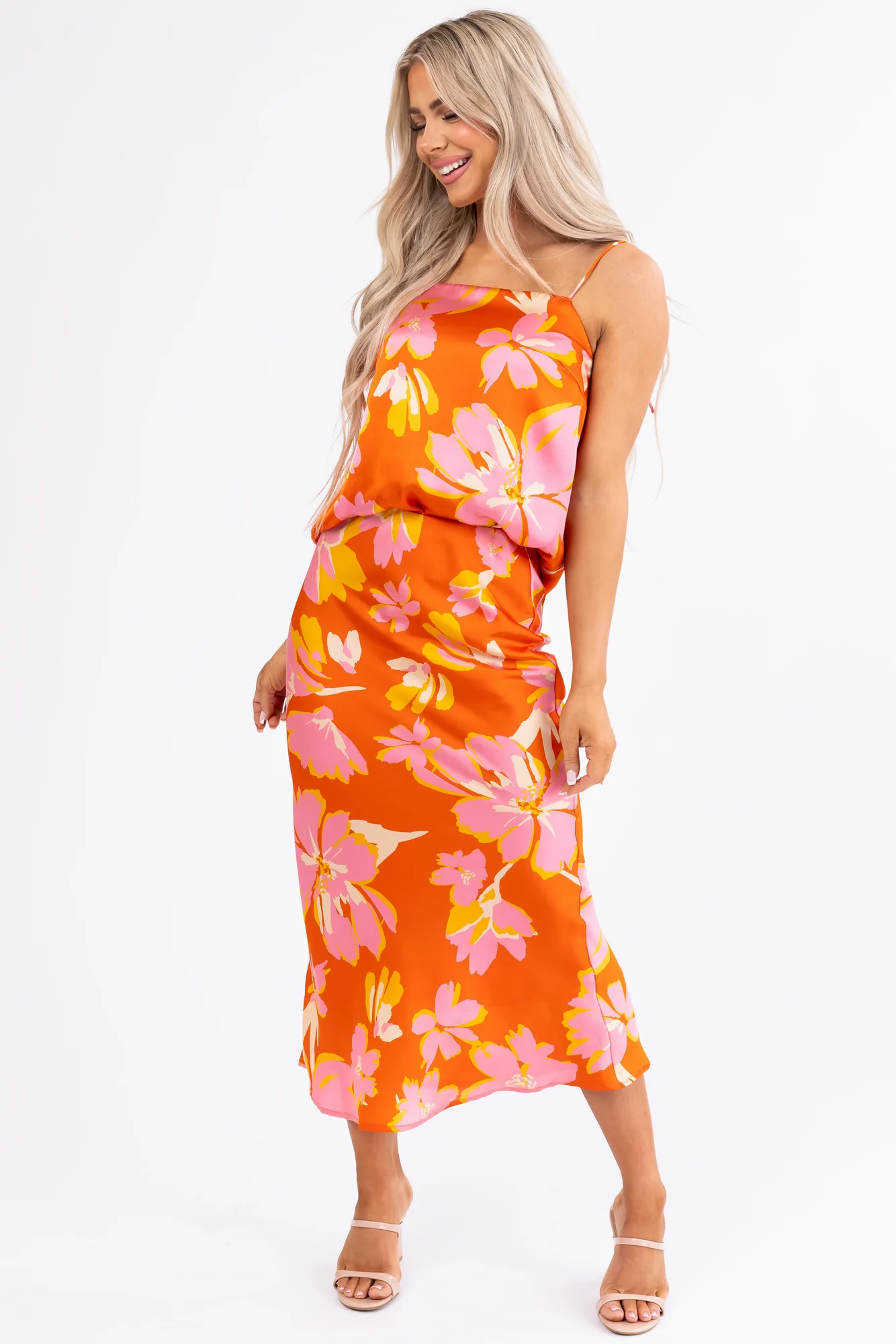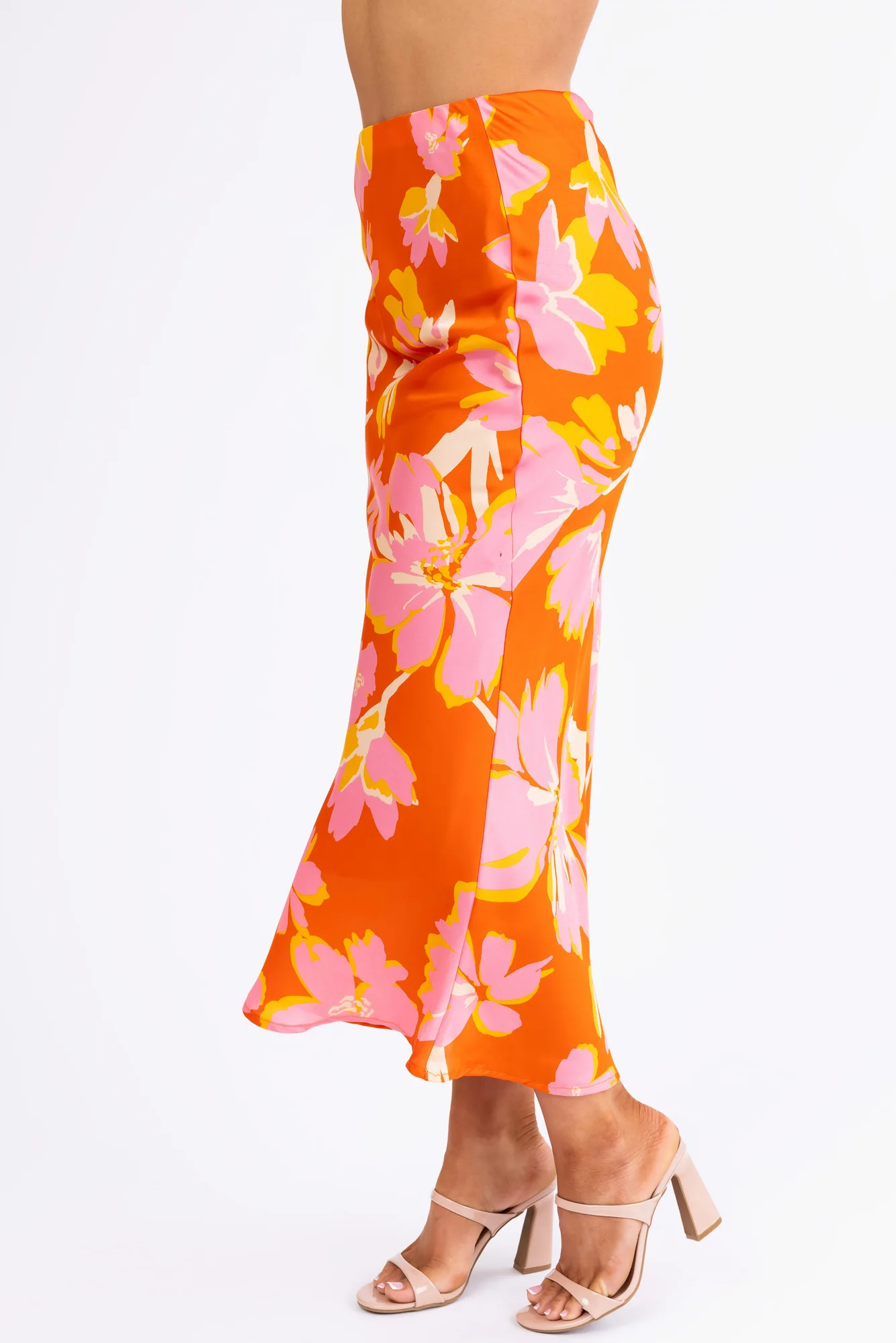 Elevate your style with our stunning Floral Print Satin Maxi Skirt in Baby Pink, Amber, and Cream. Crafted from non-stretchy satin with an elastic waist and bias flounce hem for a graceful touch. Pair with our matching Tie Strap Satin Tank Top. Available in sizes S, M, and L. Hand wash cold for care. Embrace unique variations due to the cutting and sewing process.