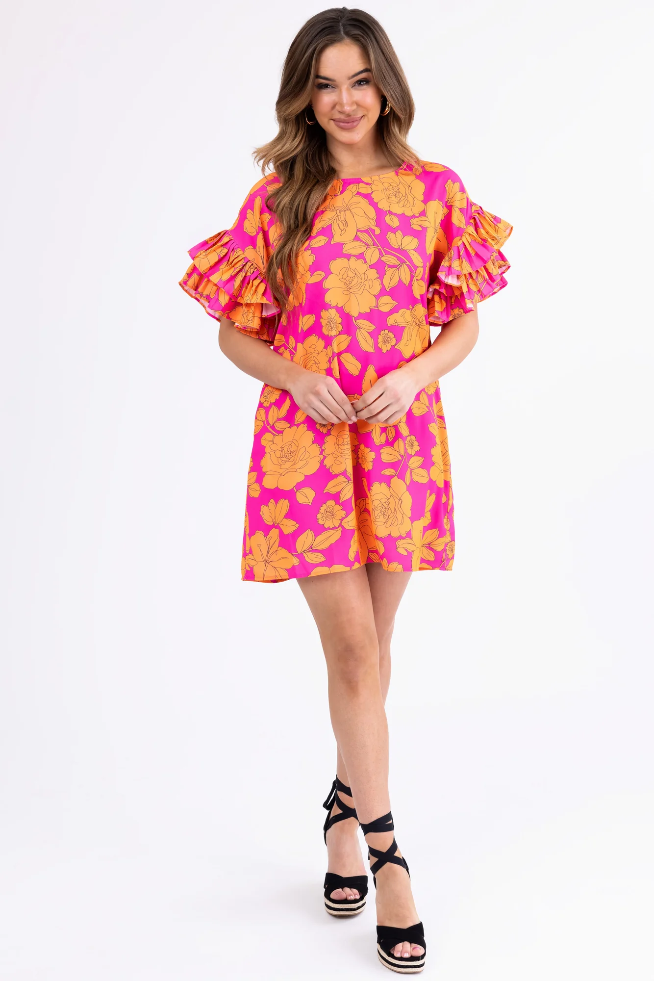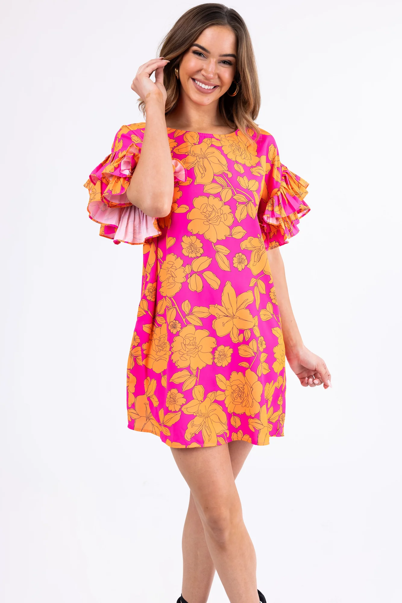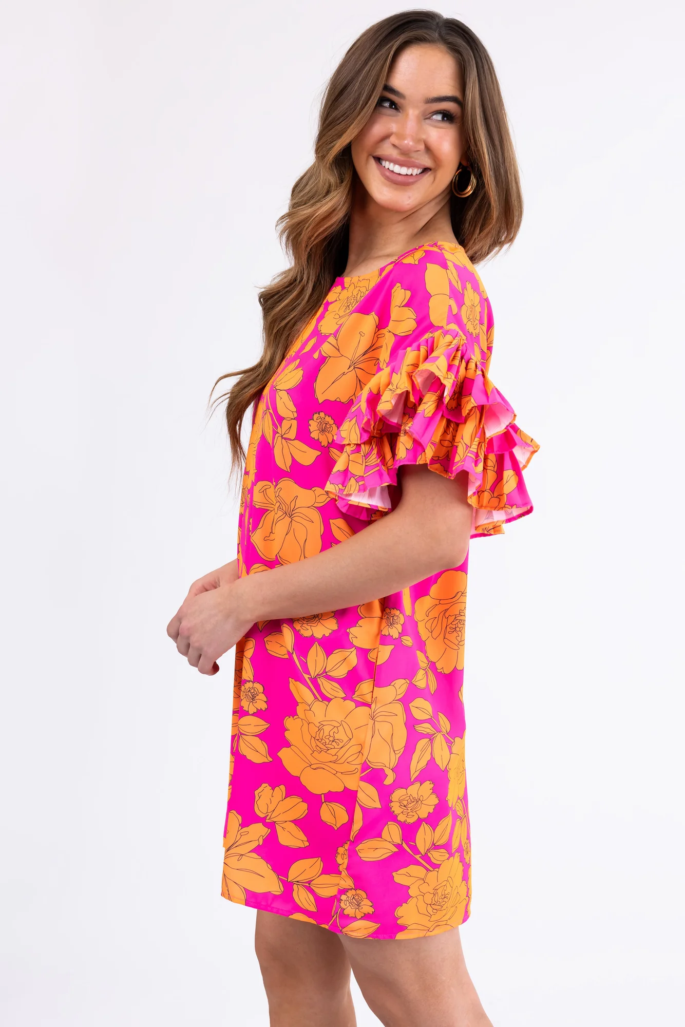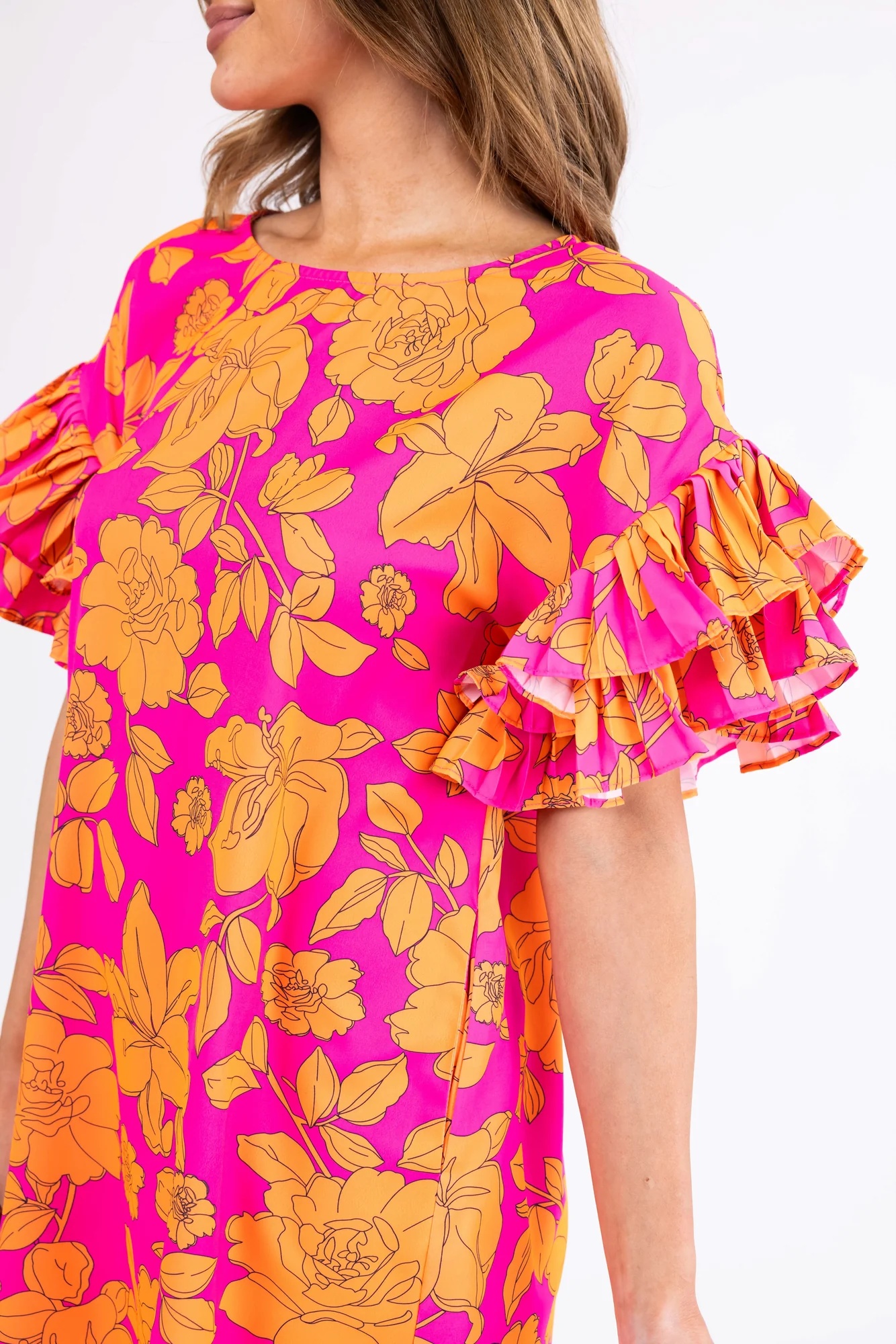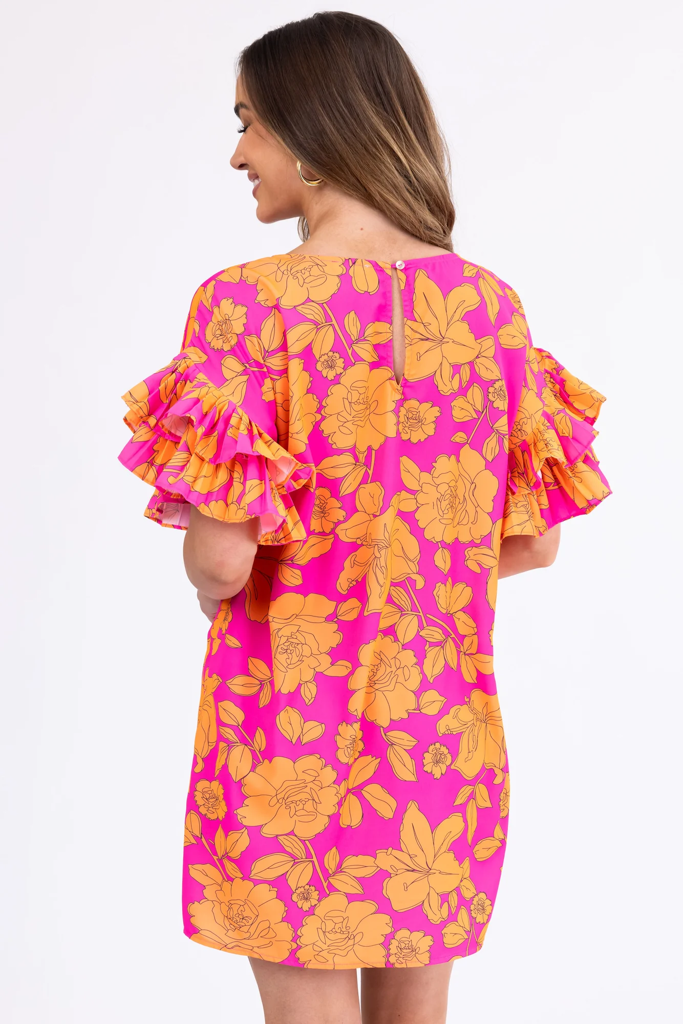 This beautiful short dress in Magenta and Tangerine features ruffled half sleeves, a round neckline, and pockets. Made of 100% Polyester, it has a loose fit that fits true to size. Perfect for casual or daytime occasions, the dress has a floral print, a keyhole back with a button closure, and is unlined. Ideal for spring and summer, this non-stretchy woven dress with a drop shoulder is a must-have for your wardrobe. Hand wash cold and line dry for best care. Variations may occur due to the cutting and sewing process. Model featured is wearing a size Small.