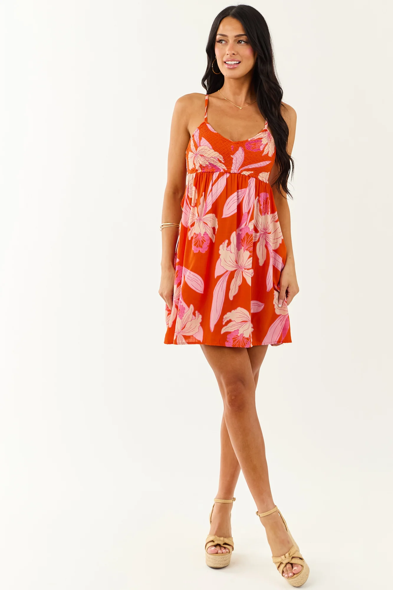 Embrace your flirty side with this fiery twist in our Floral Print Sleeveless Babydoll Mini Dress. Featuring side cutouts for a touch of sass, this dress fits true to size and is perfect for a summer day out. The stretchy smocked bust, adjustable spaghetti straps, and vibrant Mulberry, Orchid, and Cream shades make it a standout piece. Please note that due to the unique printing and sewing process, each piece may vary slightly. Unleash your playful yet chic vibe with this ensemble. Model is wearing a size Small. Models Profile: Size 1, Height 59″, Bust 34″, Waist 26″.