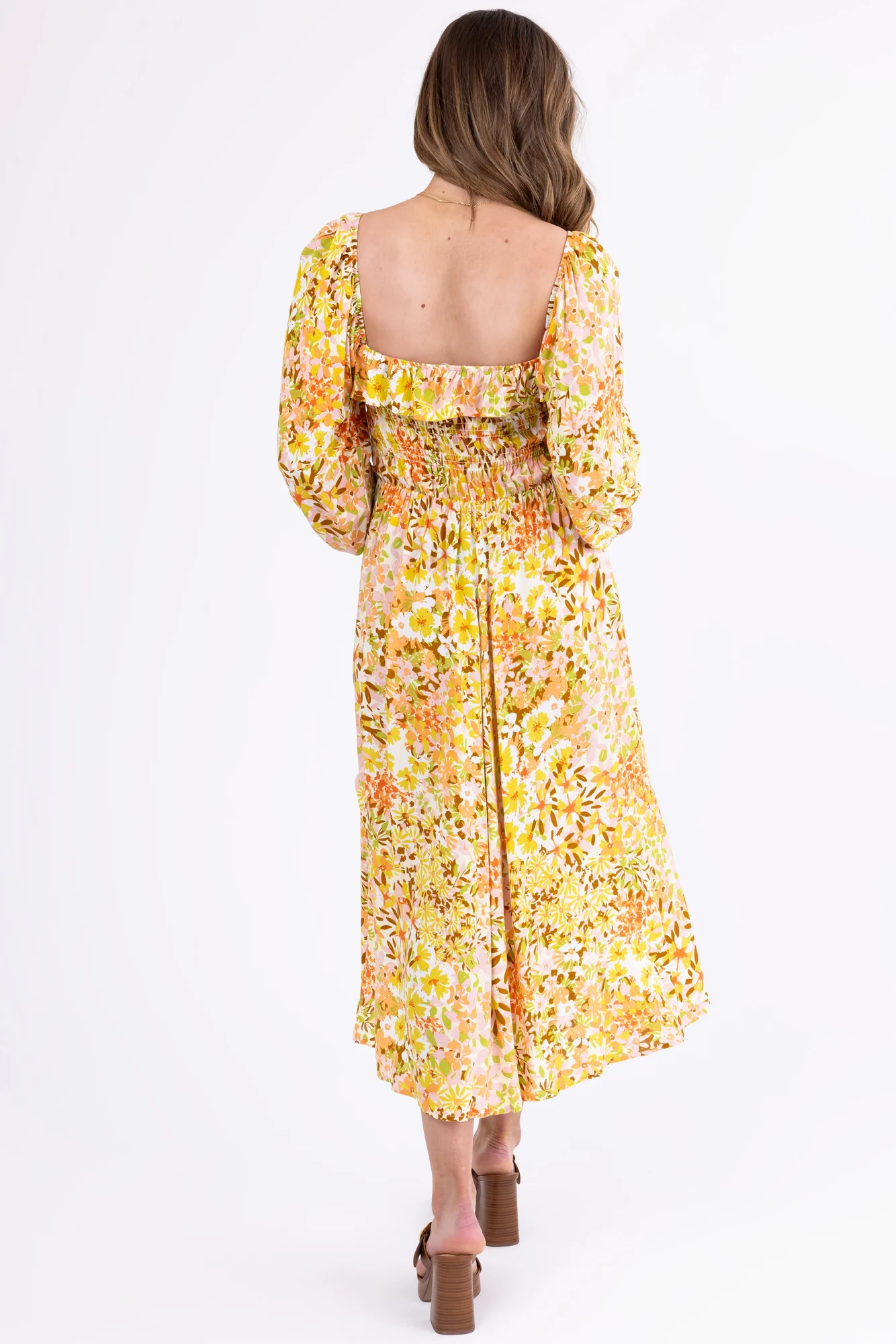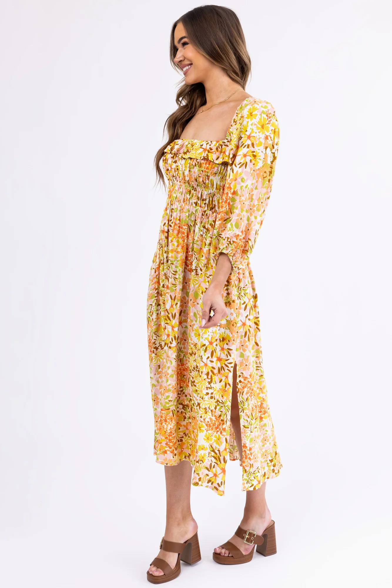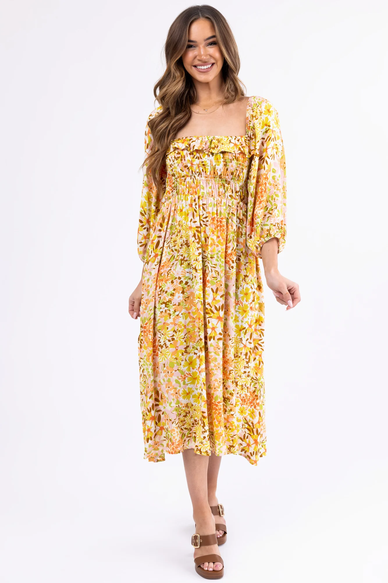 Enjoy effortless style with our Floral Print Smocked Midi Dress in Buttercream. Crafted from 100% Rayon, this dress features a ruffled neckline, elastic waistband, cuffs, and 3/4 sleeves. Perfect for various occasions like date nights or daytime outings. The dress comes in shades of Buttercream, Off White, Melon, Carnation, Kiwi, Poppy Red, Sepia, and Light Lime. Please note that each piece may vary slightly due to the unique cutting and sewing process. Hand wash only. Model is wearing a size Small.