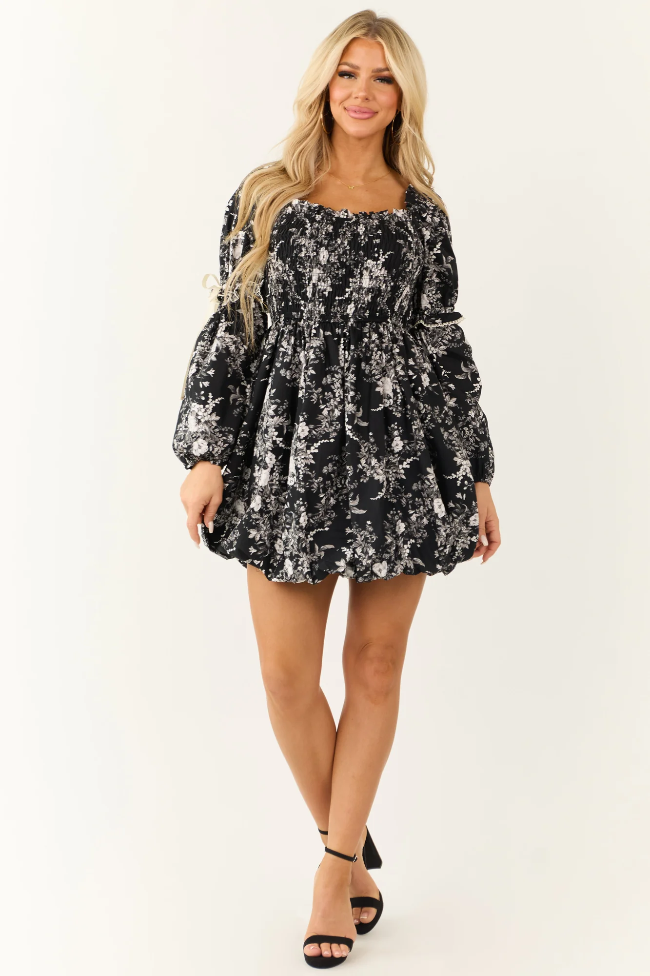 This Floral Print Smocked Mini Dress is a charming addition to your wardrobe. Crafted from 100% Cotton with a stylish square neck and long sleeves, this dress features a delightful floral pattern in shades of White, Charcoal, and Heather Grey. The elastic shoulder and cuffs, along with the pleated elastic bubble skirt, offer a flattering fit. Complete with ribbon sleeve detail, side pockets, and a lined interior for added comfort. Perfect for any occasion, this dress is ideal for those who appreciate chic fashion with a touch of whimsy.