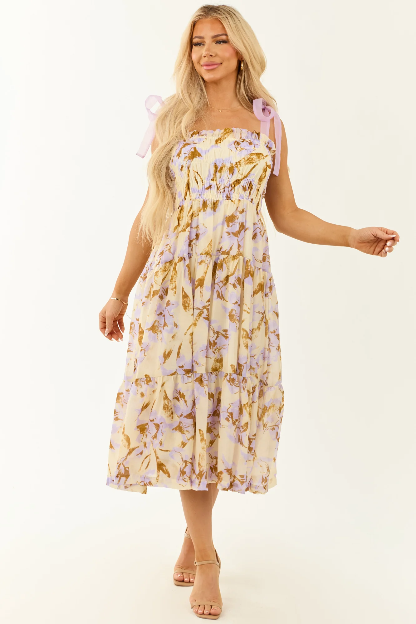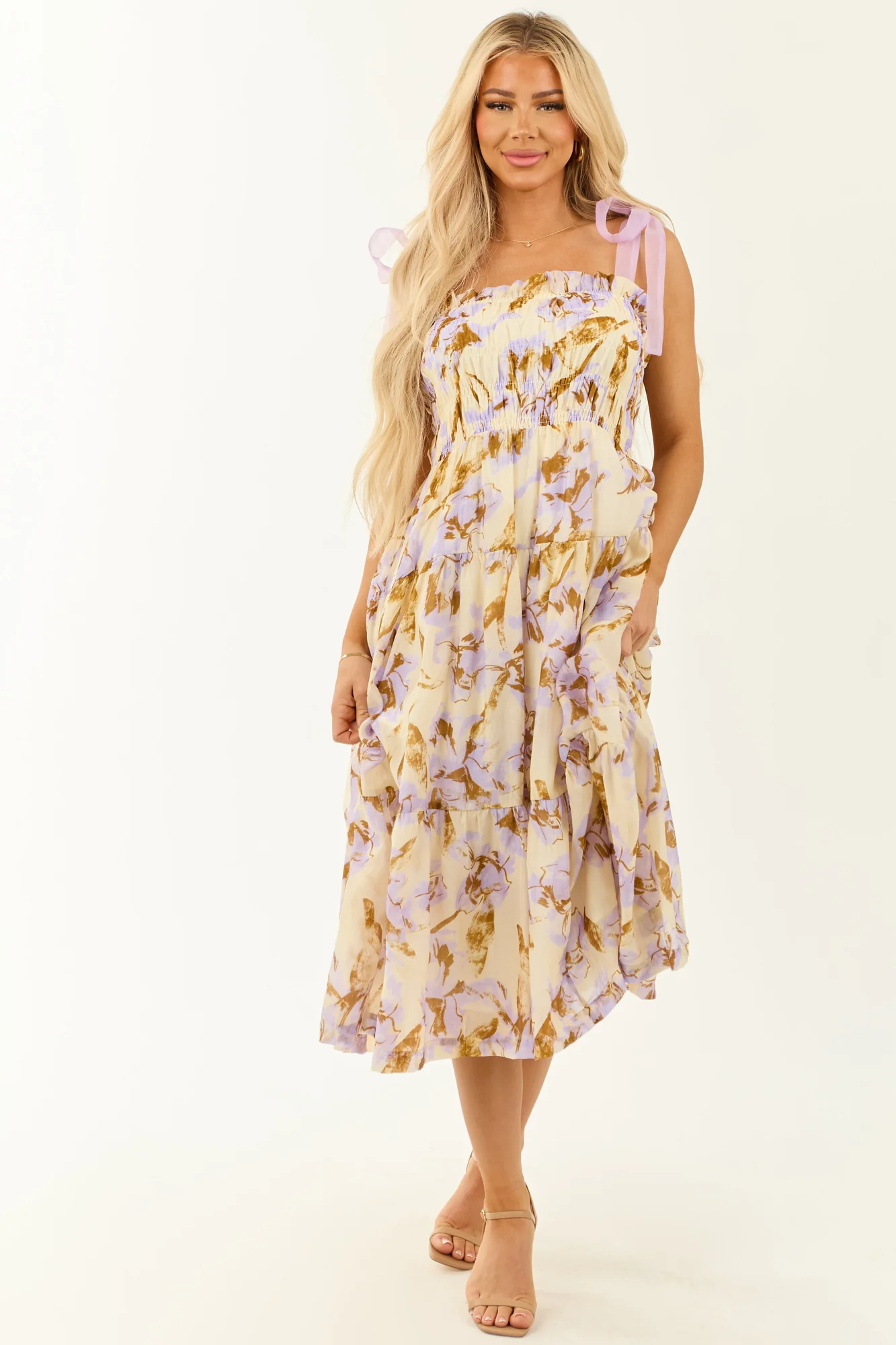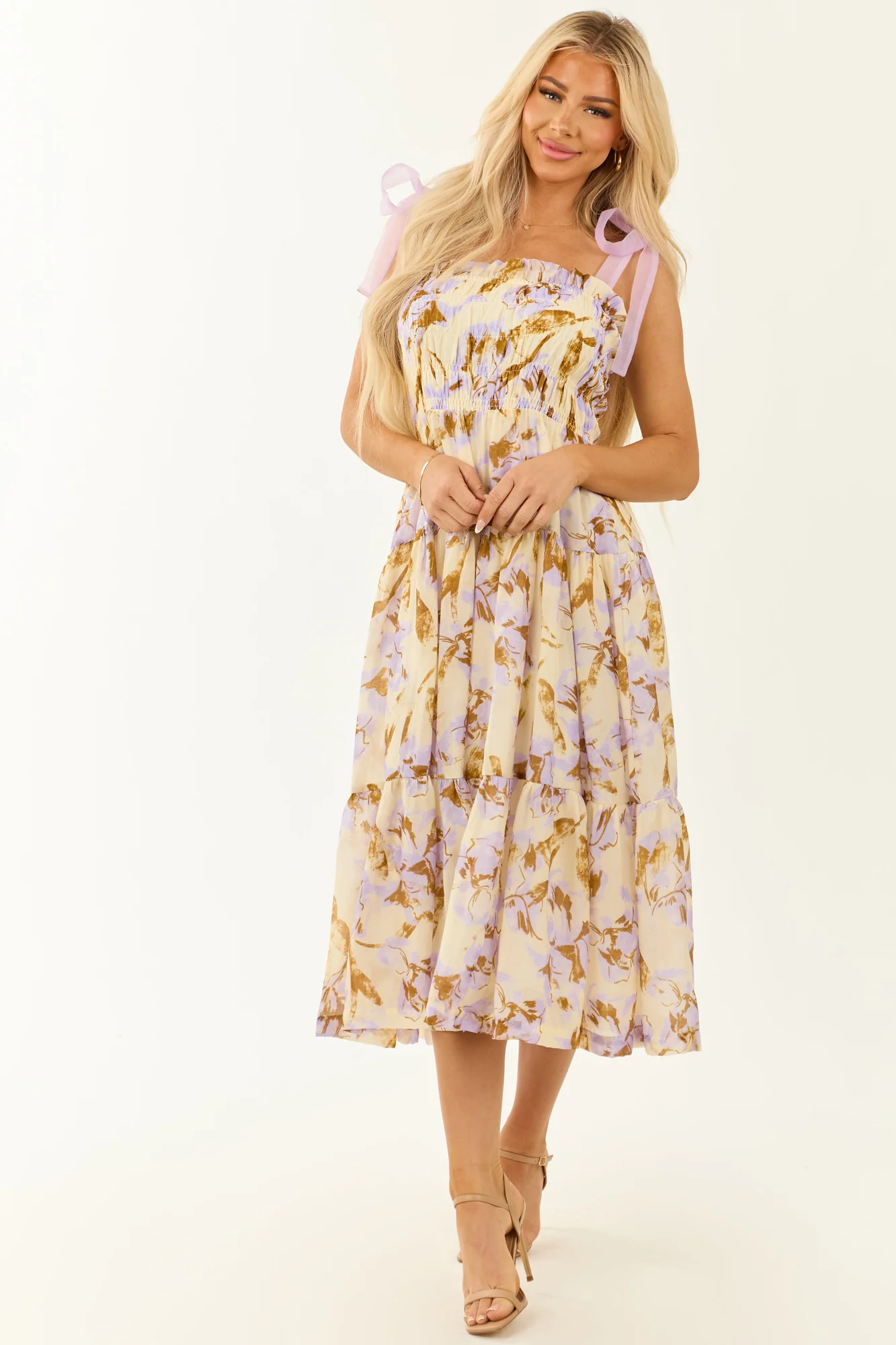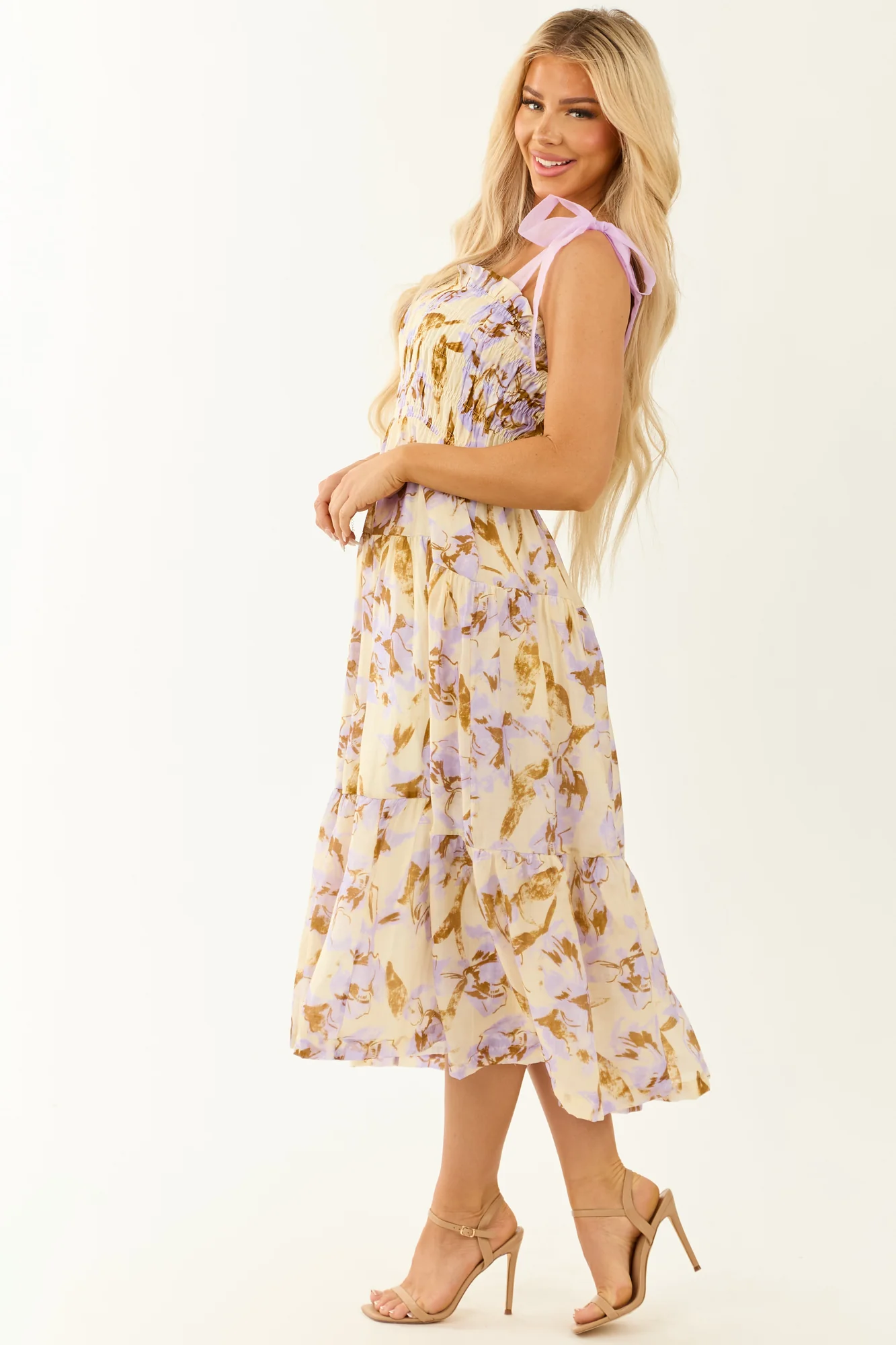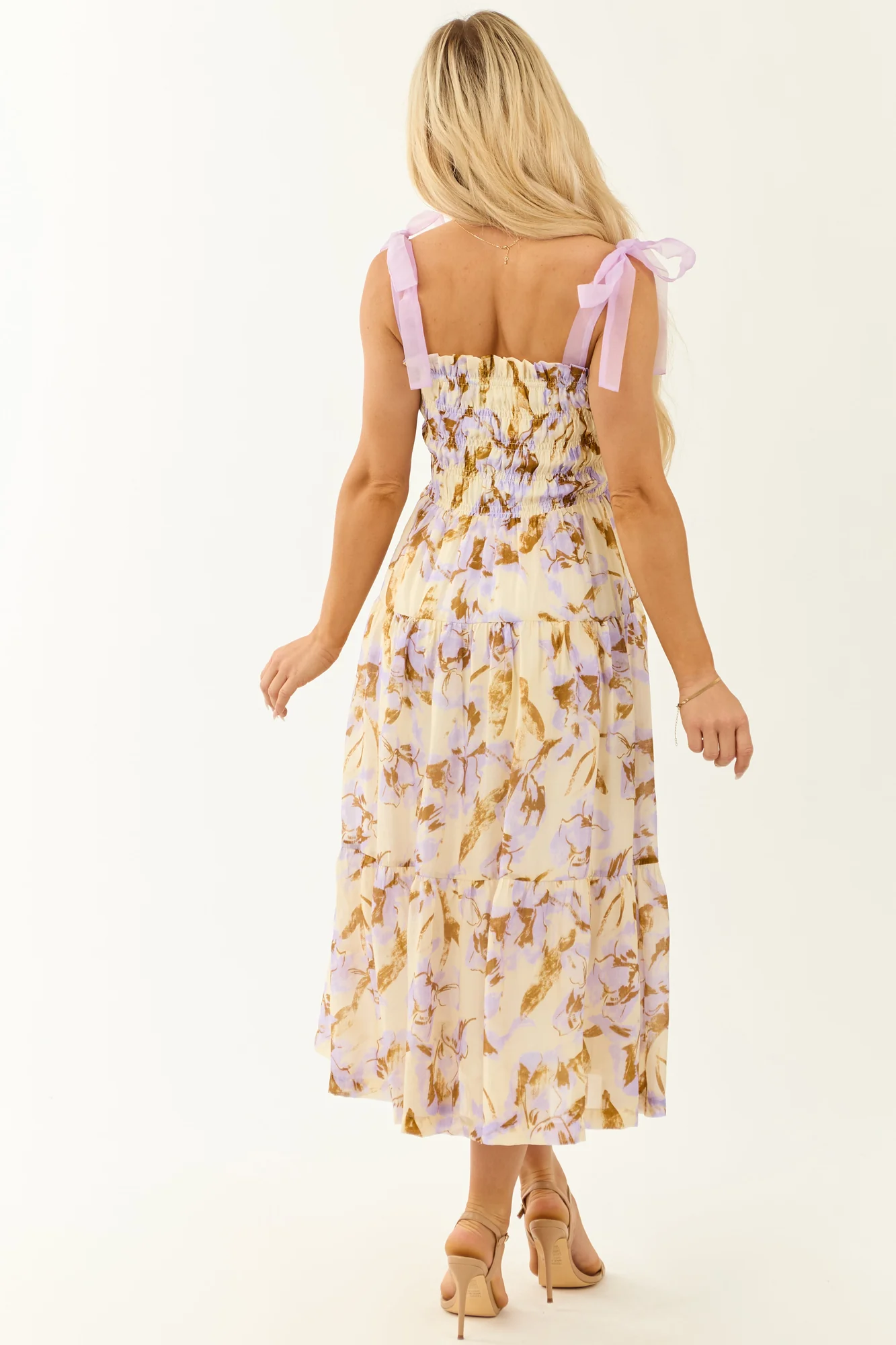 Experience the ethereal charm of a painted garden in motion with our Cream Floral Print Smocked Sleeveless Midi Dress. Crafted from a stretchy smocked bodice, this dress boasts flowy sheer ribbon shoulder tie straps and elegant tiered frills. The floral pattern features enchanting shades of Iris and Sepia. Each piece is unique due to the cutting and sewing process. Embrace true romantic style with this dreamy dress. Size Small measurements: Bust 34″, Waist 25″. Self: 70% Tencel, 30% Nylon. Lining: 100% Rayon. Imported.