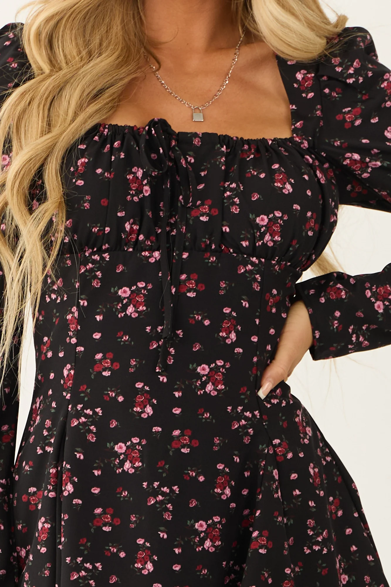 This stunning Black Floral Print Square Neck Mini Dress is a must-have for your wardrobe. Made with non-stretchy woven fabric in shades of Baby Pink, Juniper, and Cranberry, this dress features a square neckline with a notch and tie detail, a zippered back with a hook and eye closure, and long puff sleeves. The pleated skirt and lining add a touch of elegance to the design. Perfect for date nights or going out, this dress is both stylish and comfortable. Care instructions: Machine wash cold, do not bleach, iron low, line dry. Models are wearing size Small.