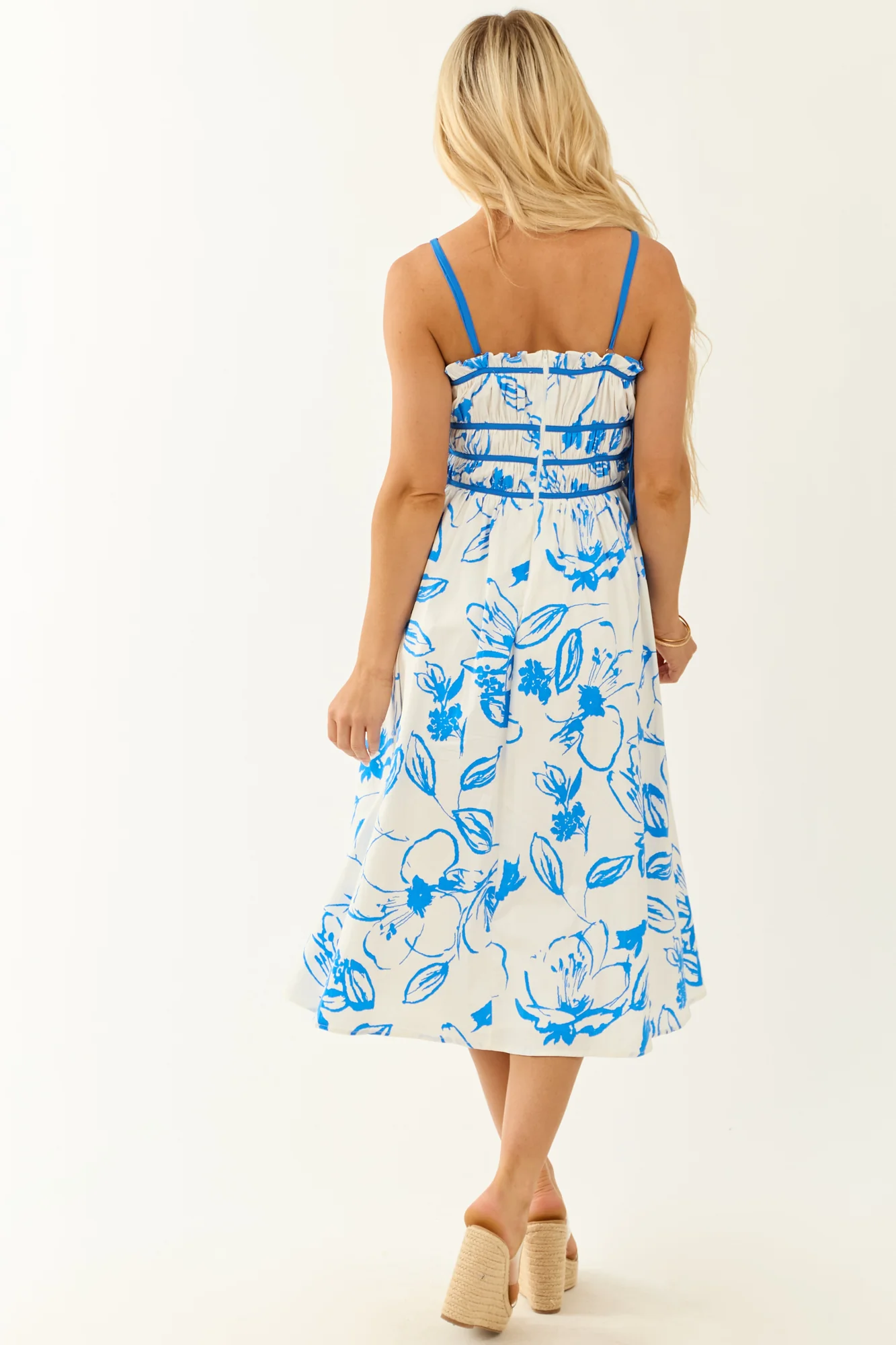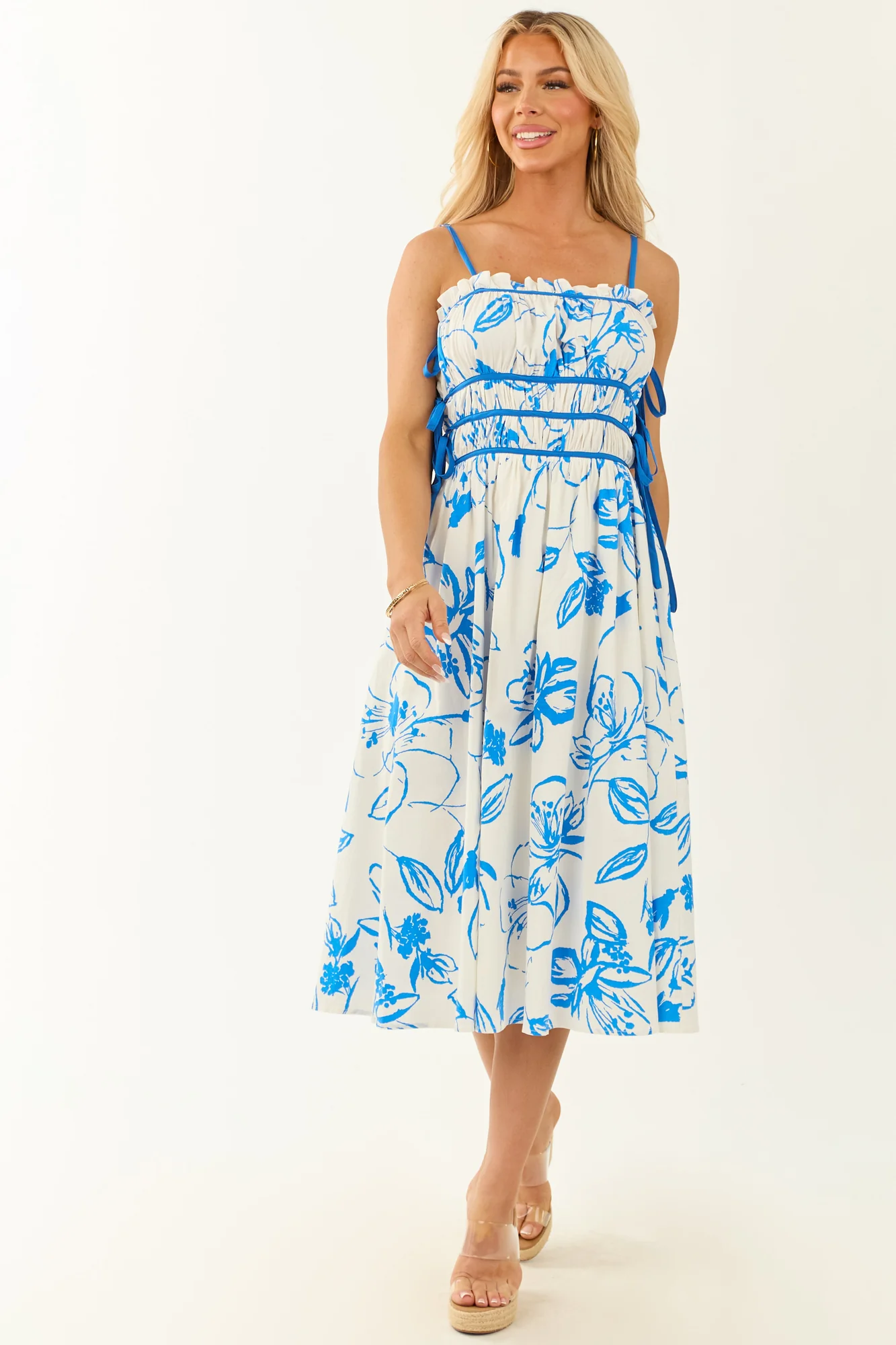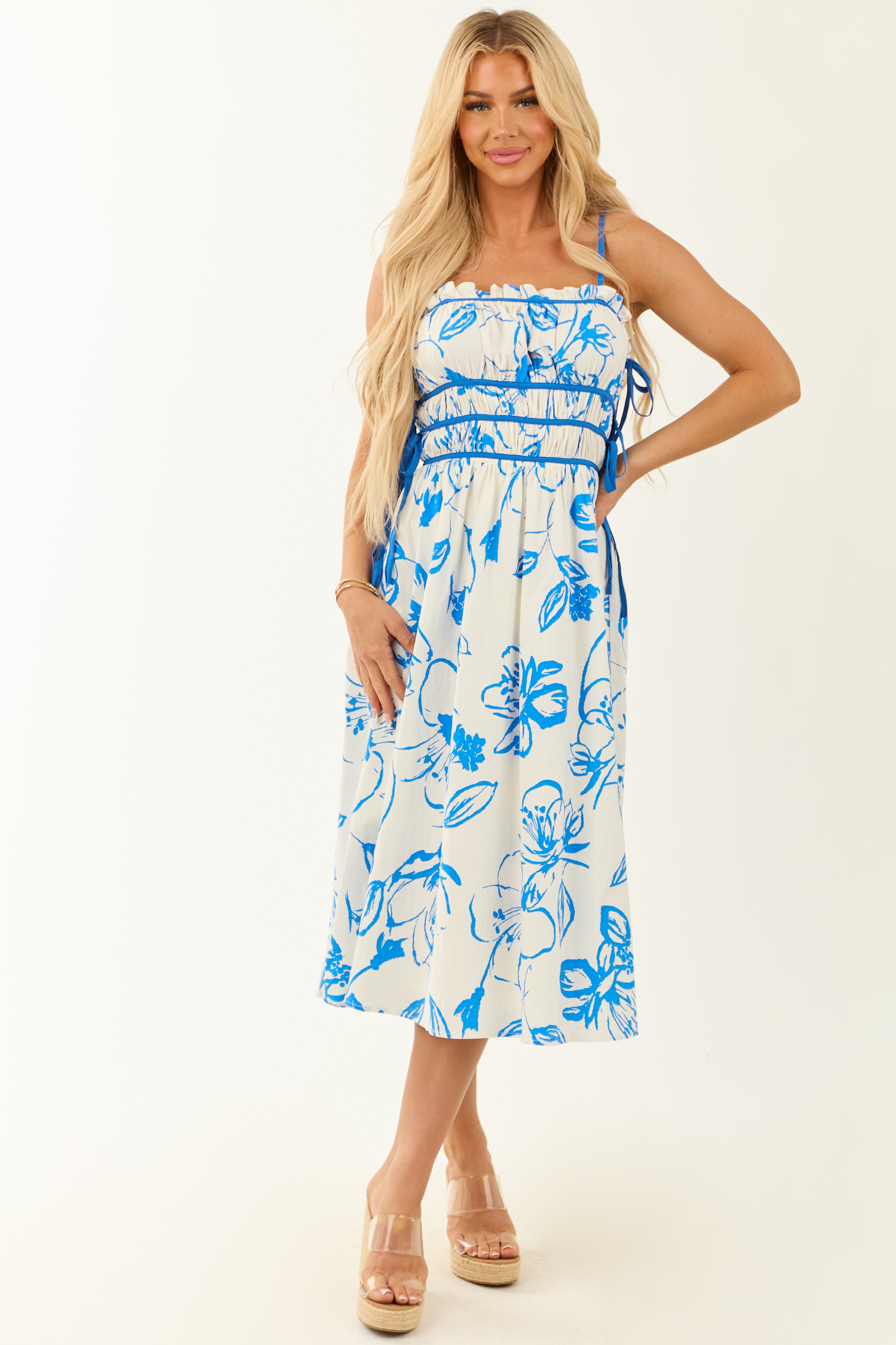 Elevate your style with this stunning Floral Print Square Neck Sleeveless Midi Dress in Ivory. Crafted for comfort and elegance, this dress features a ruched bodice, adjustable spaghetti straps, and ruffle trim for a touch of femininity. The back zipper with hook and eye closure adds a chic finish. Perfect for a sunny day out, this dress is a must-have in every fashion-forward wardrobe. Make a lasting impression with its floral print design in a graceful midi length.