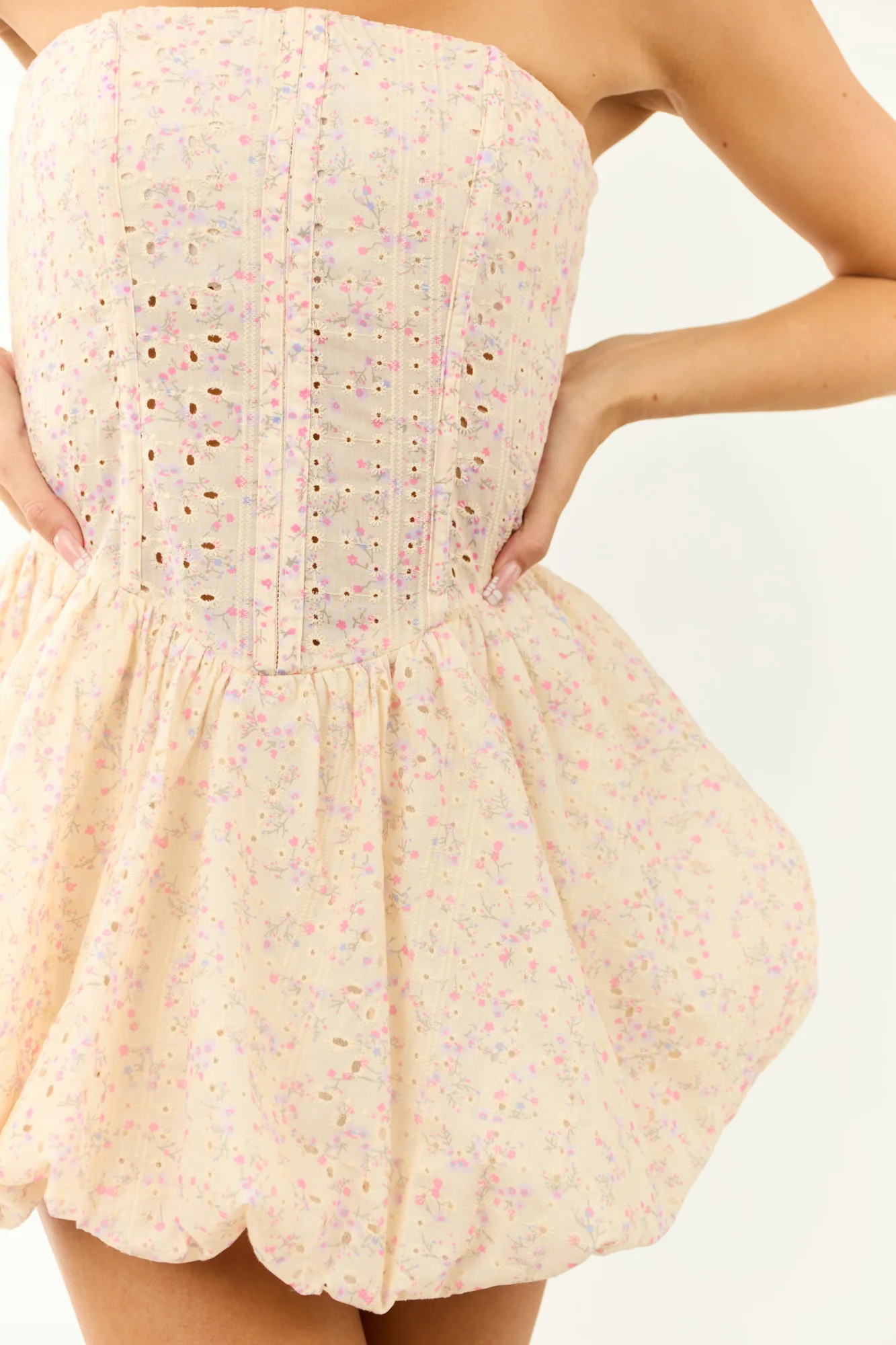 This stunning mini dress features a floral print in Bubblegum, Periwinkle, Dusty Blue, and Sage hues, making it perfect for sunny days and photos. With stretchy elastic bust, adhesive strip, boning in bodice, and eyelet details, this dress offers both style and comfort. The hidden back zipper, hook and eye closure, lined skirt with tulle layer, and strapless design add to its charm. Made from 100% Rayon with a polyester/spandex lining, this dress is ideal for various occasions. Available in sizes S, M, and L.