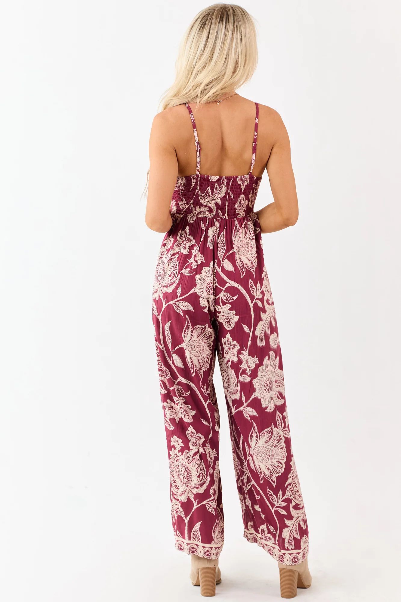This stunning jumpsuit features a floral print, tie-front cutout bust, and a flowy wide leg silhouette. Made of 100% Rayon, it includes smocked back detail, adjustable straps, and 2 pockets. The inseam is 33 inches. Available in sizes XS to XL, this jumpsuit is perfect for adding a touch of elegance to your wardrobe. Size specifications for SM: Bust 31 inches, Waist 26 inches, Torso Length 30 inches. Imported.