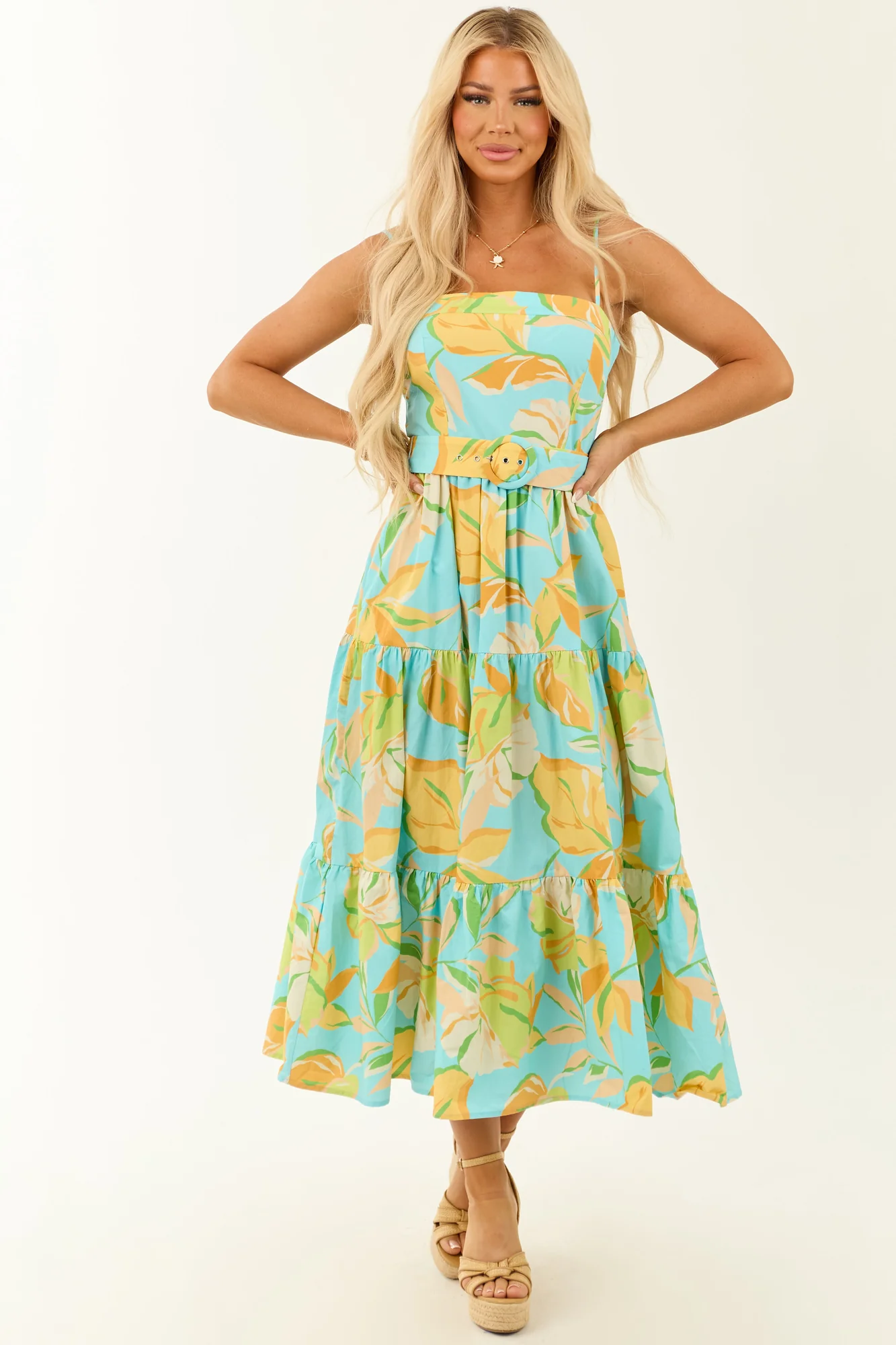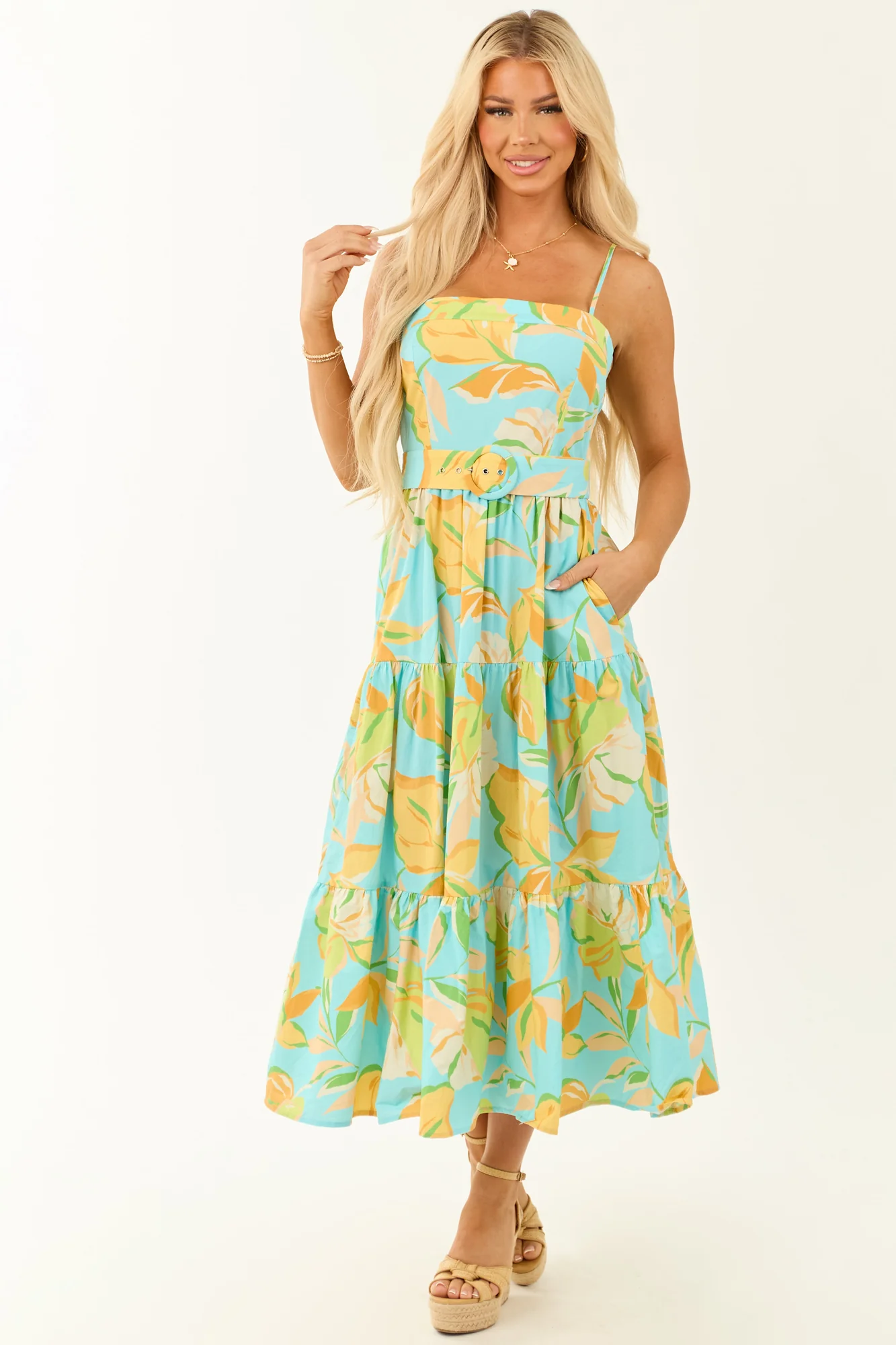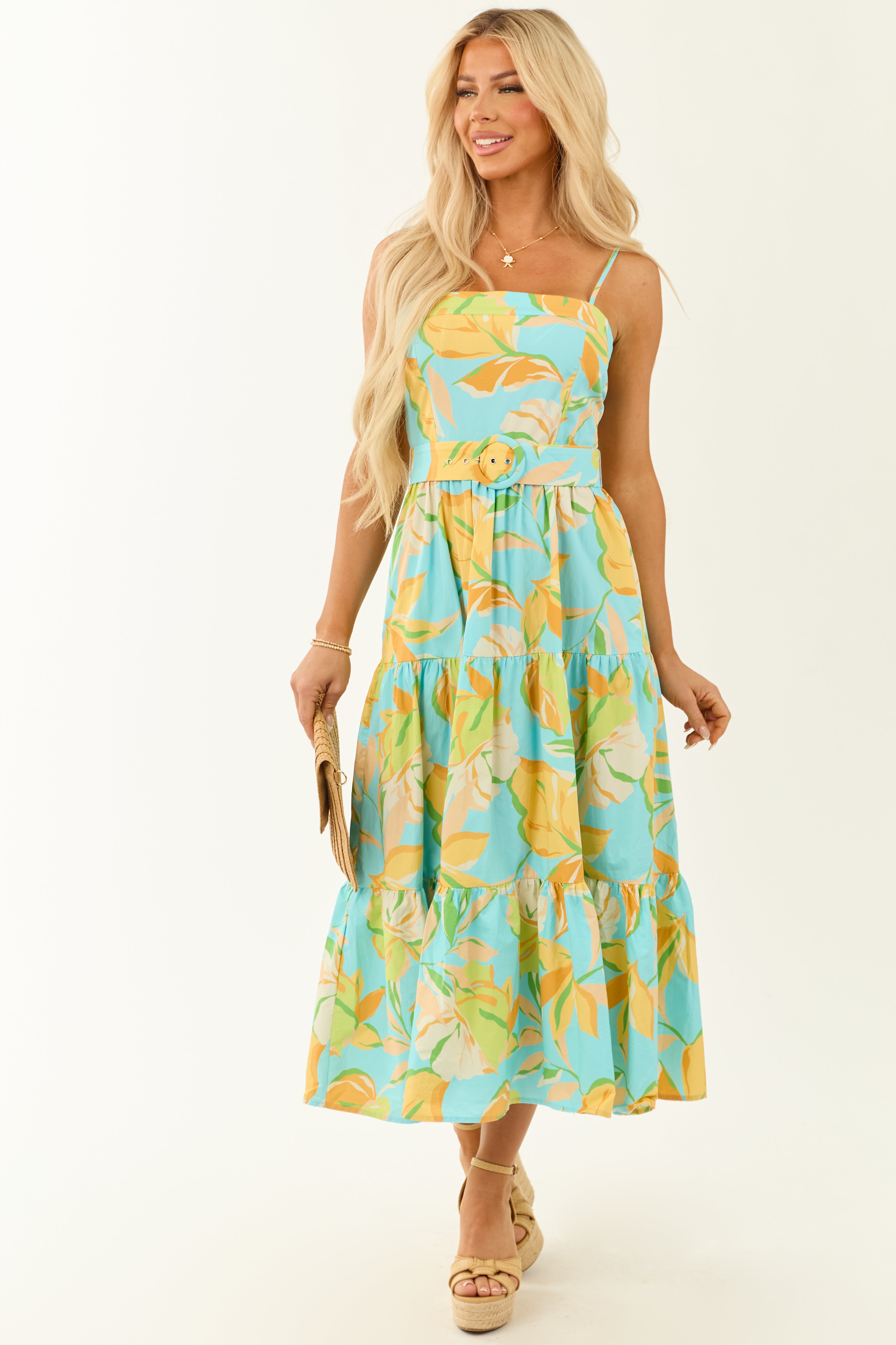 Indulge in a tropical escape with our Floral Print Tiered Maxi Dress. The vibrant floral pattern in Lime, Kelly Green, and other shades exudes fresh energy. Whether you seek a relaxed look or a cinched waist with the detachable belt, this dress offers versatility. Featuring a square neckline, spaghetti straps, and a hidden zipper, this dress is perfect for summer days. Crafted from 100% Cotton, this unlined dress fits loosely in the bust and snugly at the waist. Elevate your style with this breezy and flirty outfit.