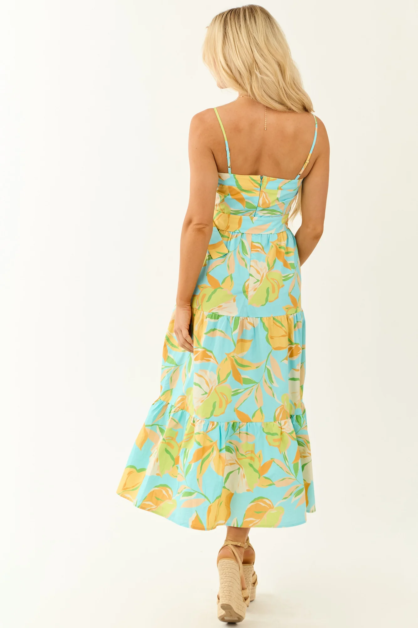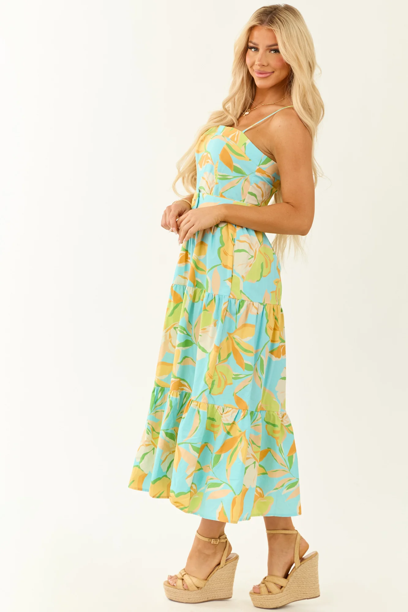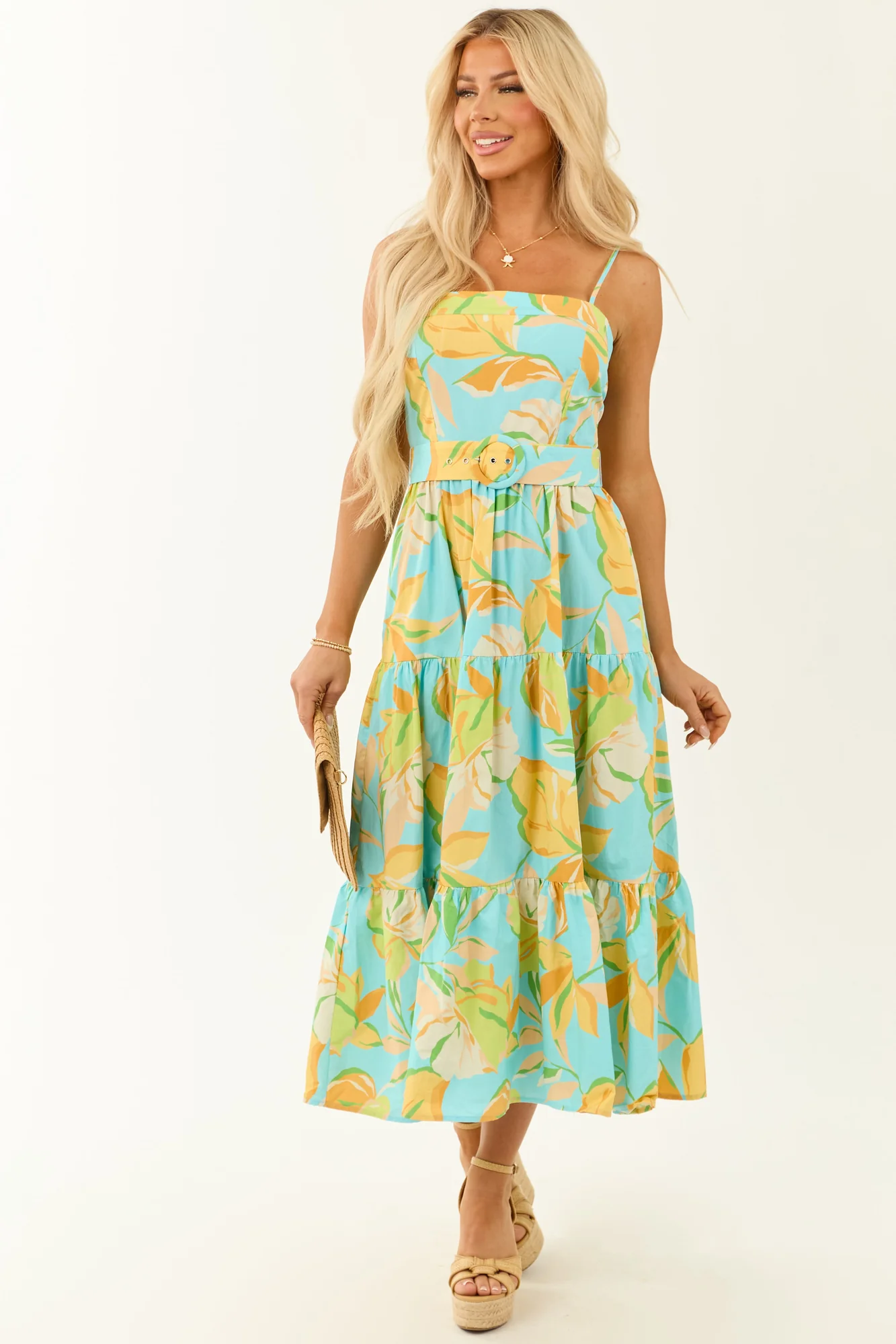 Indulge in a tropical escape with our Floral Print Tiered Maxi Dress. The vibrant floral pattern in Lime, Kelly Green, and other shades exudes fresh energy. Whether you seek a relaxed look or a cinched waist with the detachable belt, this dress offers versatility. Featuring a square neckline, spaghetti straps, and a hidden zipper, this dress is perfect for summer days. Crafted from 100% Cotton, this unlined dress fits loosely in the bust and snugly at the waist. Elevate your style with this breezy and flirty outfit.