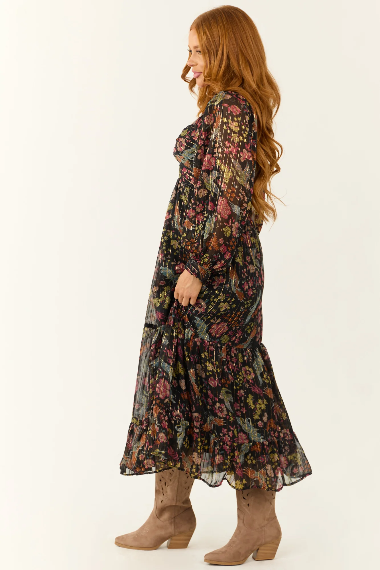 This elegant Floral Print Twist Maxi Dress in Black is a must-have addition to your wardrobe. Available in sizes S, M, and L with measurements fitting true to size. Crafted from non-stretchy woven material with stunning floral patterns in shades of Raspberry, Blush, Honeysuckle, and more. Features a charming sweetheart neckline, front cut out, and long puff sleeves. The smocked back, tiered ruffle skirt, and metallic gold threading add a touch of sophistication. Perfect for daytime occasions or casual outings. Hand wash recommended. Own this versatile piece that is sure to turn heads!